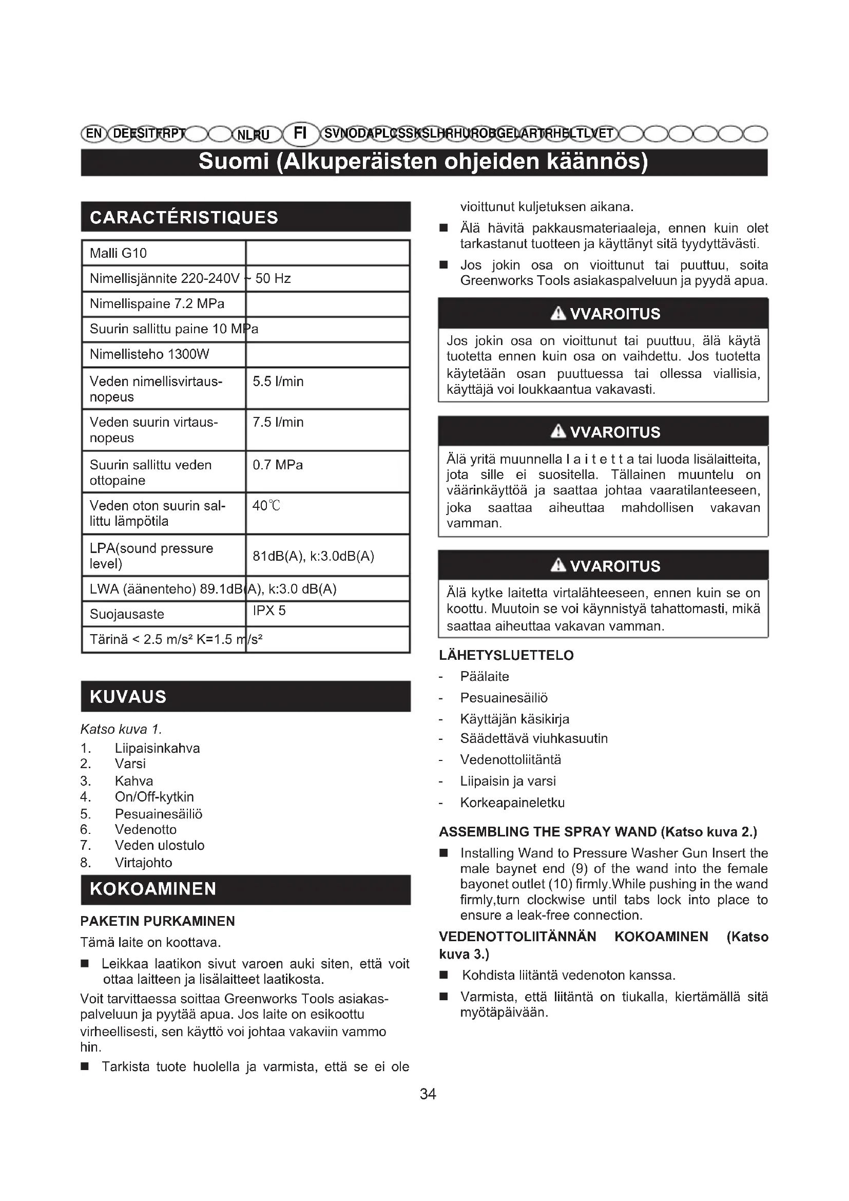 KOKOAMINEN PAKETIN PURKAMINEN Tämä laite on koottava. Leikkaa laatikon sivut varoen auki siten, että voit ottaa laitteen ja lisälaitteet laatikosta. Voit tarvittaessa soittaa Greenworks Tools asiakas- palveluun ja pyytää apua. Jos laite on esikoottu virheellisesti, sen käyttö voi johtaa vakaviin vammo hin. Tarkista tuote huolella ja varmista, että se ei ole vioittunut kuljetuksen aikana. Älä hävitä pakkausmateriaaleja, ennen kuin olet tarkastanut tuotteen ja käyttänyt sitä tyydyttävästi. Jos jokin osa on vioittunut tai puuttuu, soita Greenworks Tools asiakaspalveluun ja pyydä apua. VVAROITUS Jos jokin osa on vioittunut tai puuttuu, älä käytä tuotetta ennen kuin osa on vaihdettu. Jos tuotetta käytetään osan puuttuessa tai ollessa viallisia, käyttäjä voi loukkaantua vakavasti. VVAROITUS Älä yritä muunnella l a i t e t t a tai luoda lisälaitteita, jota sille ei suositella. Tällainen muuntelu on väärinkäyttöä ja saattaa johtaa vaaratilanteeseen, joka saattaa aiheuttaa mahdollisen vakavan vamman. VVAROITUS Älä kytke laitetta virtalähteeseen, ennen kuin se on koottu. Muutoin se voi käynnistyä tahattomasti, mikä saattaa aiheuttaa vakavan vamman. LÄHETYSLUETTELO - Päälaite - Pesuainesäiliö - Käyttäjän käsikirja - Säädettävä viuhkasuutin - Vedenottoliitäntä - Liipaisin ja varsi - Korkeapaineletku ASSEMBLING THE SPRAY WAND (Katso kuva 2.) Installing Wand to Pressure Washer Gun Insert the male baynet end (9) of the wand into the female bayonet outlet (10) firmly.While pushing in the wand firmly,turn clockwise until tabs lock into place to ensure a leak-free connection. VEDENOTTOLIITÄNNÄN KOKOAMINEN (Katso kuva 3.) Kohdista liitäntä vedenoton kanssa. Varmista, että liitäntä on tiukalla, kiertämällä sitä myötäpäivään.Suomi (Alkuperäisten ohjeiden käännös)