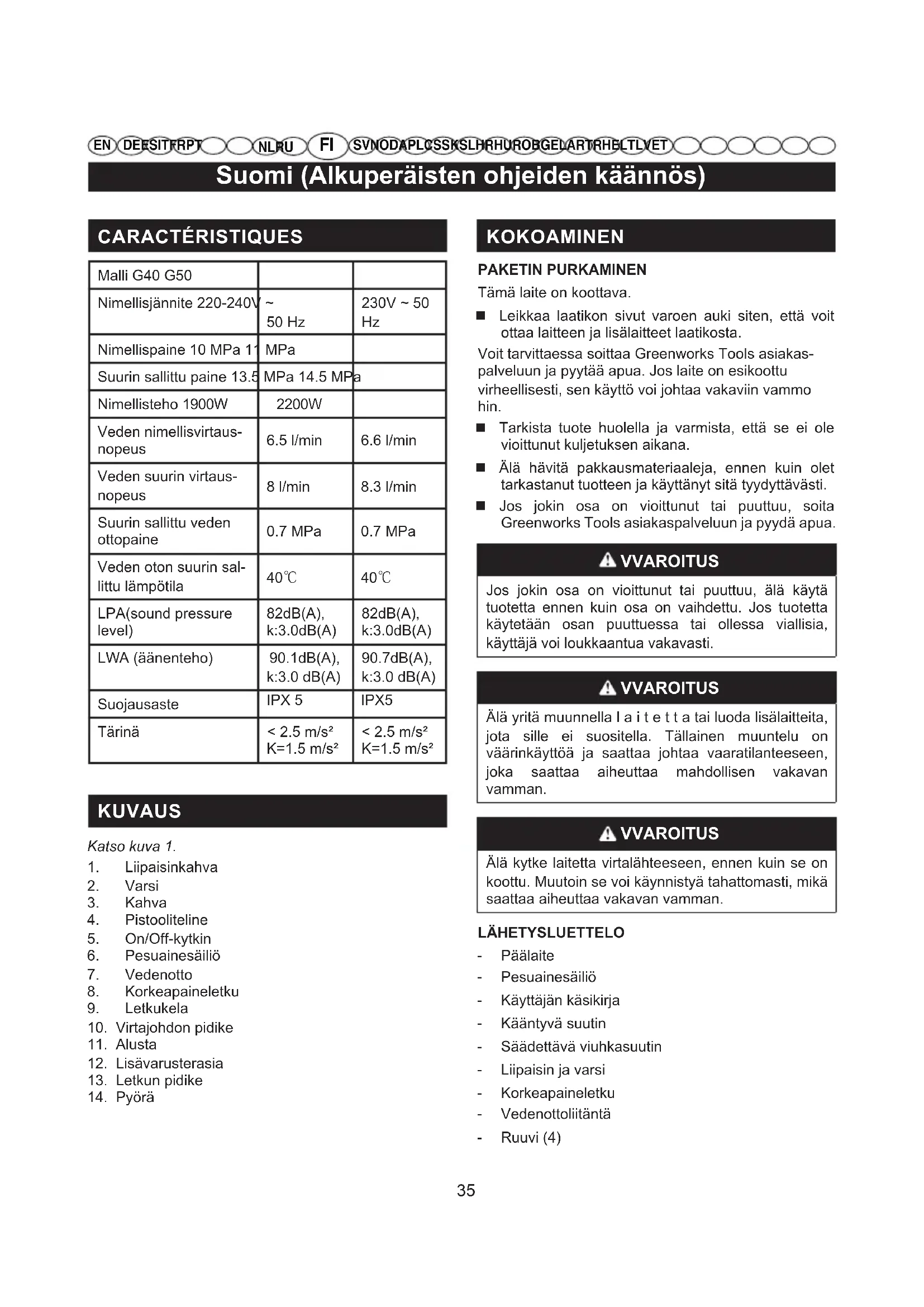 KOKOAMINEN PAKETIN PURKAMINEN Tämä laite on koottava. Leikkaa laatikon sivut varoen auki siten, että voit ottaa laitteen ja lisälaitteet laatikosta. Voit tarvittaessa soittaa Greenworks Tools asiakas- palveluun ja pyytää apua. Jos laite on esikoottu virheellisesti, sen käyttö voi johtaa vakaviin vammo hin. Tarkista tuote huolella ja varmista, että se ei ole vioittunut kuljetuksen aikana. Älä hävitä pakkausmateriaaleja, ennen kuin olet tarkastanut tuotteen ja käyttänyt sitä tyydyttävästi. Jos jokin osa on vioittunut tai puuttuu, soita Greenworks Tools asiakaspalveluun ja pyydä apua. VVAROITUS Jos jokin osa on vioittunut tai puuttuu, älä käytä tuotetta ennen kuin osa on vaihdettu. Jos tuotetta käytetään osan puuttuessa tai ollessa viallisia, käyttäjä voi loukkaantua vakavasti. VVAROITUS Älä yritä muunnella l a i t e t t a tai luoda lisälaitteita, jota sille ei suositella. Tällainen muuntelu on väärinkäyttöä ja saattaa johtaa vaaratilanteeseen, joka saattaa aiheuttaa mahdollisen vakavan vamman. VVAROITUS Älä kytke laitetta virtalähteeseen, ennen kuin se on koottu. Muutoin se voi käynnistyä tahattomasti, mikä saattaa aiheuttaa vakavan vamman. LÄHETYSLUETTELO - Päälaite - Pesuainesäiliö - Käyttäjän käsikirja - Kääntyvä suutin - Säädettävä viuhkasuutin - Liipaisin ja varsi - Korkeapaineletku - Vedenottoliitäntä - Ruuvi (4)Suomi (Alkuperäisten ohjeiden käännös)