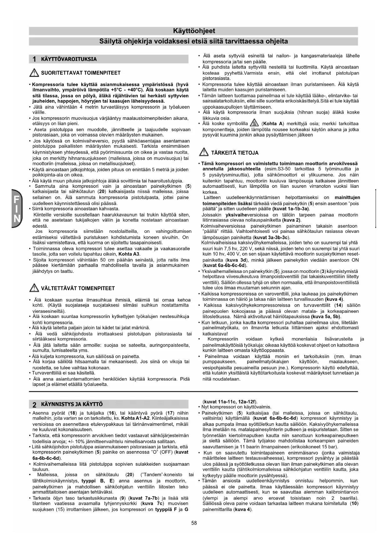 Heikentynyt tuotto, käynnistyy tiheään Alhaiset painearvot. Kohtuuton kulutus . Vähennä kulutustarvetta. Liitoksissa ja/tai putkistossa vuotoja. Uusi tiivisteet. Imusuodatin tukossa (13). Puhdista/vaihda imusuodatin (13) (kuvat 13a-13b). Hihna luistaa. Tarkista hihnojen kireys (kuva 15). Moottori (3) ja/tai kompressori lämpenevät poikkeavasti. Riittämätön ilmanvaihto. Paranna työympäristöä. Ilma-aukkoja tukossa. Tarkasta ja tarvittaessa puhdista ilmansuodatin (13). Liian vähäinen voitelu. Lisää öljyä tai vaihda se (kuvat 18a-18b-18c-18d). Kompressori yrittää käynnistyä, mutta lämpösuoja pysäyttää sen moottorin suuren rasituksen vuoksi. Kompressori yrittää käynnistyä, vaikka sen päässä on painetta. Release the compressor’s head by using the pressure switch’s push button (5). lämpötila on alhainen. Paranna ympäristön olosuhteita. jännite riittämätön. Tarkista, että verkon jännite vastaa arvokilvessä mainittua. Poista mahdolliset jatkojohdot. Kompressori yrittää käynnistyä, mutta lämpösuoja pysäyttää sen moottorin suuren rasituksen vuoksi. Voitelu virheellinen tai riittämätön. Tarkista öljyn määrä (9) ja lisää tai vaihda tarvittaessa. Sähköventtiili ei toimi. Ota yhteyttä Huoltokeskukseen. Käynnissä ollessaan kompressori pysähtyy ilman näkyvää syytä. Moottorin lämpösuojan laukeaminen. Tarkasta öljyn määrä (9). Yksivaiheiset yksivyöhykemallit: vie painekytkimen (5) painike takaisin asentoon ”off” (kuva 1a). nollaa lämpösuoja (kuva 2) ja käynnistä uudelleen (kuvat 1b). Jos vika ei poistu, ota yhteyttä Huoltokeskukseen. Mallit, joissa tähtikolmiokäynnistys: paina lämpösuojan painiketta, joka on sähkötaulun rasian sisällä (kuva 3c), ja käynnistä uudestaan (kuva 6d). Jos vika ei poistu, ota yhteyttä Huoltokeskukseen. Kolmivaiheiset kaksivyöhykemallit, joiden teho on suurempi tai yhtä suuri kuin 7,5 hv, 220V, Kolmivaiheiset kaksivyöhykemallit, joiden teho on suurempi tai yhtä suuri kuin 10 hv, 400V: paina moottorin suojakytkimen reset-painiketta (kuva 3d), ja vie sitten painekytkin asentoon ON (kuvat 6a-6b-6c-6d). Muut mallit: vie painekytkimen (5) painike takaisin asentoon ”off” ja sitten uudelleen asentoon ”on” (kuva 1a-1b). Jos vika ei poistu, ota yhteyttä Huoltokeskukseen. Sähkövika. Ota yhteyttä Huoltokeskukseen. Käynnissä ollessaan kompressori tärisee ja moottorista kuuluu poikkeavaa ääntä. Jos se pysähtyy, se ei käynnisty uudelleen, vaikka moottorista kuuluu ääntä. Yksivaihemoottorit: kondensaattorissa vikaa. Vaihdata kondensaattori. Kolmevaihemoottorit: 3-vaiheisesta syöttöjärjestelmästä puuttuu yksi vaihe, todennäköisesti sulakkeen laukeamisen vuoksi. Tarkista sähkötaulun sisällä tai sähkörasiassa (20) olevat sulakkeet ja vaihda tarvittaessa vahingoittuneet (kuva 19). Verkossa öljyä, jota ei pitäisi olla. Kohtuuton öljykuormitus laiteryhmän sisällä. Tarkasta öljyn määrä (9). Osat kuluneet. Ota yhteyttä Huoltokeskukseen. Poistohanasta vuotaa lauhdevettä (4). Likaa/hiekkaa hanassa. Puhdista hana. Kaikki muut mahdolliset toimenpiteet tulee antaa valtuutettujen Huoltokeskusten tehtäväksi. Vaadi aina alkuperäisiä varaosia. Koneen korjaaminen omin päin voi vaarantaa turvallisuutesi ja aiheuttaa takuun raukeamisen.61