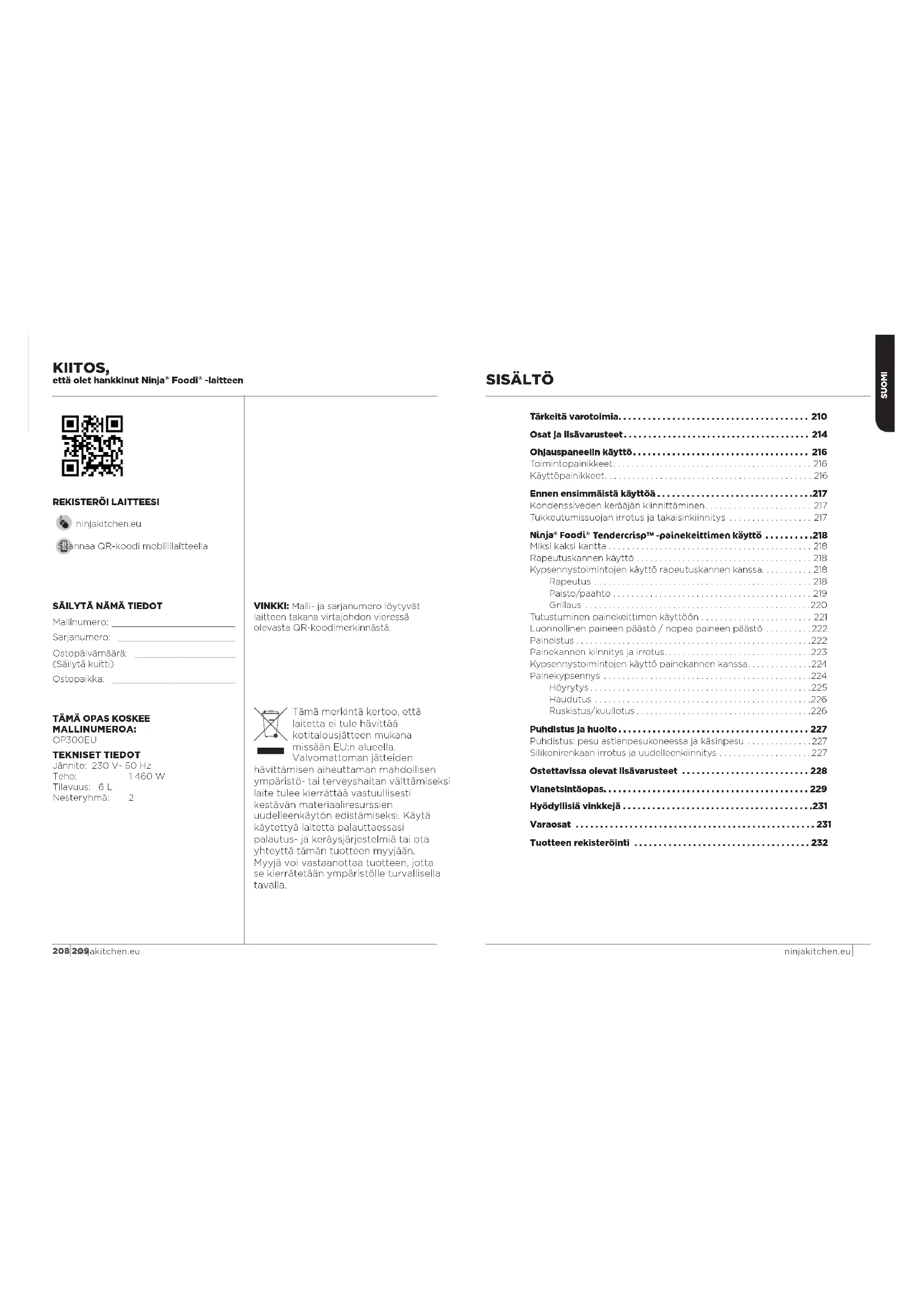 MALLINUMEROA: OP300EU TEKNISET TIEDOT Jännite: 230V~ 50Hz Teho: 1460W Tilavuus: 6 L Nesteryhmä: 2 SUOMI Tämä merkintä kertoo, että laitetta ei tule hävittää kotitalousjätteen mukana missään EU:n alueella. Valvomattoman jätteiden hävittämisen aiheuttaman mahdollisen ympäristö- tai terveyshaitan välttämiseksi laite tulee kierrättää vastuullisesti kestävän materiaaliresurssien uudelleenkäytön edistämiseksi. Käytä käytettyä laitetta palauttaessasi palautus- ja keräysjärjestelmiä tai ota yhteyttä tämän tuotteen myyjään. Myyjä voi vastaanottaa tuotteen, jotta se kierrätetään ympäristölle turvallisella tavalla.210 211 ninjakitchen.eu ninjakitchen.eu Lue kaikki ohjeet ennen Ninja Foodi®. Sähkölaitetta käytettäessä on noudatettava aina tavanomaisia turvallisuusohjeita mukaan lukien seuraavat: VAROITUS 1 Laitetta voivat käyttää henkilöt, joiden fyysinen, sensorinen tai henkinen toimintakyky on rajoittunut tai joilla ei ole kokemusta tai tietoa laitteen käytöstä, jos heitä valvotaan tai heille annetaan ohjeita laitteen turvalliseen käyttöön liittyen ja he ymmärtävät sen käyttöön liittyvät vaarat. 2 ÄLÄ anna lasten käyttää laitetta. Tarkkaa valvontaa vaaditaan, kun laitetta käytetään lasten lähellä. 3 Pienten lasten tukehtumisvaaran estämiseksi kannattaa poistaa ja hävittää tämän laitteen pistokkeeseen asennettu suojus. 4 Lapset eivät saa leikkiä tällä laitteella. 5 Älä KOSKAAN käytä työtason alapuolella olevaa pistorasiaa. 6 Älä KOSKAAN liitä tätä laitetta ulkoiseen ajastinkytkimeen tai erilliseen kauko-ohjausjärjestelmään. 7 ÄLÄ käytä jatkojohtoa. Lyhyen virtajohdon tarkoituksena on pienentää riskiä, että alle 8-vuotiaat lapset tarttuvat tai sotkeutuvat johtoon tai että joku kompastuu johtoon. 8 Suojautuaksesi sähköiskulta ÄLÄ upota johtoa, pistokkeita tai pääyksikön koteloa veteen tai muuhun nesteeseen. Kypsennä ainoastaan mukana toimitetussa kattilassa tai sen sisälle asetetussa, SharkNinjan suosittelemassa välineessä. 9 Tarkasta laite ja virtajohto säännöllisin väliajoin. ÄLÄ käytä laitetta, jos sen virtajohto tai pistoke on vaurioitunut. Jos laitteen toiminnassa on häiriöitä tai se on vaurioitunut, keskeytä käyttö välittömästi ja ota yhteyttä asiakaspalveluun. 10 Varmista AINA ennen käyttöä, että laite on koottu oikein. 11 Tarkista AINA ennen käyttöä paineenpäästöventtiili ja nesteen pinnan punainen säätöventtiili tukosten varalta, ja poista sellaiset tarvittaessa. Tarkista, että painekannen nesteen pinnan punainen säätöventtiili liikkuu vapaasti. Ruuat, kuten omenasose, karpalot, kiillotetut ohrasuurimot, kaurahiutaleet tai muut hiutaleet, silvotut herneet, nuudelit, makaroni, raparperi tai spagetti, voivat vaahdota, kuohua ja muodostaa roiskeita painekypsennyksessä tukkien paineenpäästöventtiilin. Näitä ja samankaltaisia paisuvia ruokia (kuten kuivatut kasvikset, pavut, jyvät ja riisi) ei tule kypsentää painekeittimessä muuten kuin Ninja