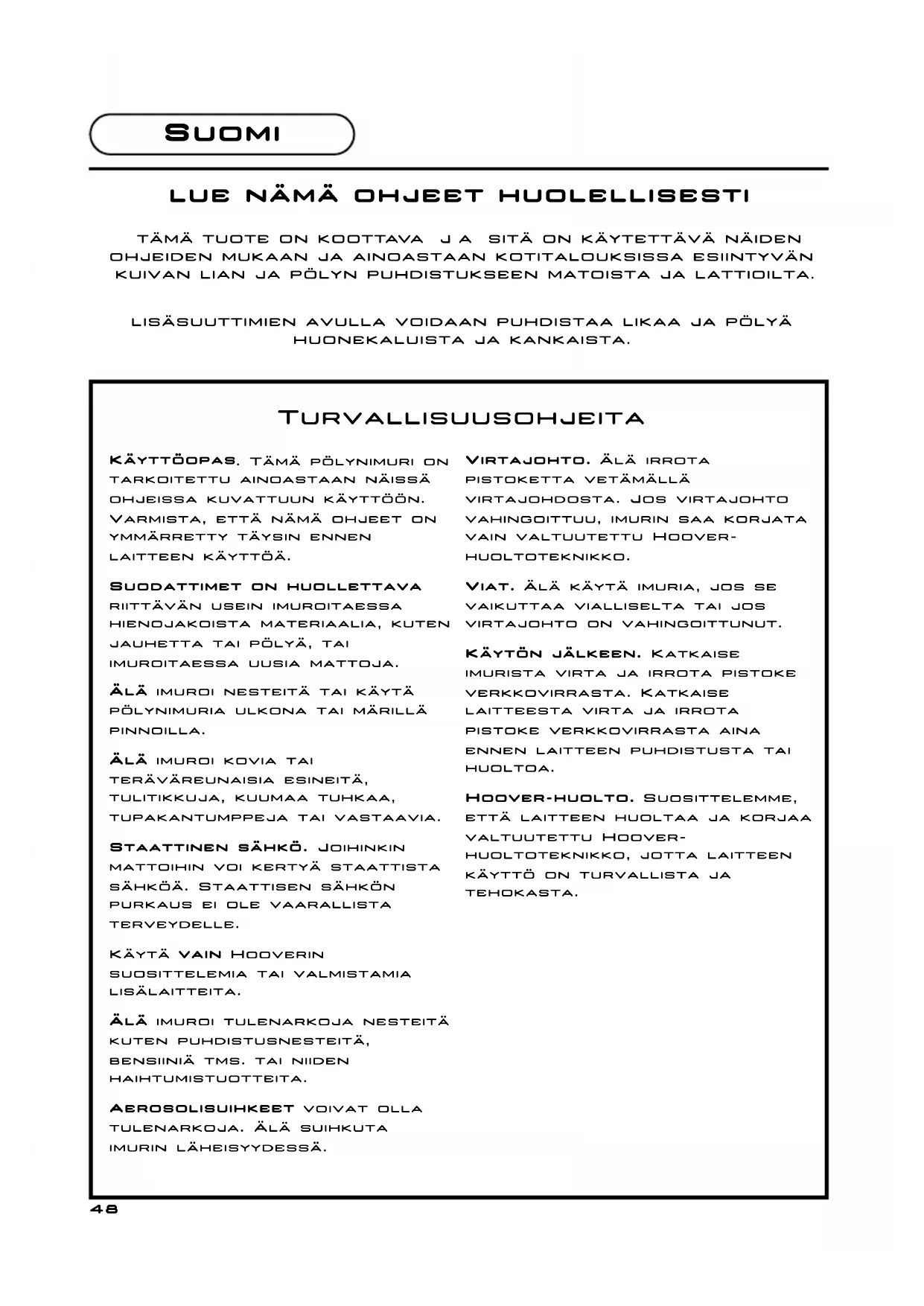 Käyttöopas . Tämä pölynimuri on tarkoitettu ainoastaan näissä ohjeissa kuvattuun käyttöön. Varmista, että nämä ohjeet on ymmärretty täysin ennen laitteen käyttöä. Suodattimet on huollettava riittävän usein imuroitaessa hienojakoista materiaalia, kuten jauhetta tai pölyä, tai imuroitaessa uusia mattoja. Älä imuroi nesteitä tai käytä pölynimuria ulkona tai märillä pinnoilla. Älä imuroi kovia tai teräväreunaisia esineitä, tulitikkuja, kuumaa tuhkaa, tupakantumppeja tai vastaavia. Staattinen sähkö. Joihinkin mattoihin voi kertyä staattista sähköä. Staattisen sähkön purkaus ei ole vaarallista terveydelle. Käytä vain Hooverin suosittelemia tai valmistamia lisälaitteita. Älä imuroi tulenarkoja nesteitä kuten puhdistusnesteitä, bensiiniä tms. tai niiden haihtumistuotteita. Aerosolisuihkeet voivat olla tulenarkoja. Älä suihkuta imurin läheisyydessä. Virtajohto. Älä irrota pistoketta vetämällä virtajohdosta. Jos virtajohto vahingoittuu, imurin saa korjata vain valtuutettu Hoover- huoltoteknikko. Viat. Älä käytä imuria, jos se vaikuttaa vialliselta tai jos virtajohto on vahingoittunut. Käytön jälkeen. Katkaise imurista virta ja irrota pistoke verkkovirrasta. Katkaise laitteesta virta ja irrota pistoke verkkovirrasta aina ennen laitteen puhdistusta tai huoltoa. Hoover-huolto. Suosittelemme, että laitteen huoltaa ja korjaa valtuutettu Hoover- huoltoteknikko, jotta laitteen käyttö on turvallista ja tehokasta.