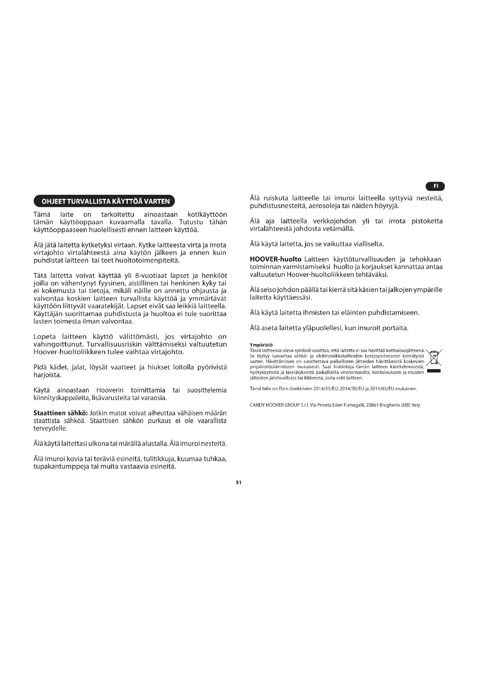 Tämä laite on tarkoitettu ainoastaan kotikäyttöön tämän käyttöoppaan kuvaamalla tavalla. Tutustu tähän käyttöoppaaseen huolellisesti ennen laitteen käyttöä. Älä jätä laitetta kytketyksi virtaan. Kytke laitteesta virta ja irrota virtajohto virtalähteestä aina käytön jälkeen ja ennen kuin puhdistat laitteen tai teet huoltotoimenpiteitä. Tätä laitetta voivat käyttää yli 8-vuotiaat lapset ja henkilöt joilla on vähentynyt fyysinen, aistillinen tai henkinen kyky tai ei kokemusta tai tietoja, mikäli näille on annettu ohjausta ja valvontaa koskien laitteen turvallista käyttöä ja ymmärtävät käyttöön liittyvät vaaratekijät. Lapset eivät saa leikkiä laitteella. Käyttäjän suorittamaa puhdistusta ja huoltoa ei tule suorittaa lasten toimesta ilman valvontaa. Lopeta laitteen käyttö välittömästi, jos virtajohto on vahingoittunut. Turvallisuusriskin välttämiseksi valtuutetun Hoover-huoltoliikkeen tulee vaihtaa virtajohto. Pidä kädet, jalat, löysät vaatteet ja hiukset loitolla pyörivistä harjoista. Käytä ainoastaan Hooverin toimittamia tai suosittelemia kiinnityskappaleita, lisävarusteita tai varaosia. Staattinen sähkö: Jotkin matot voivat aiheuttaa vähäisen määrän staattista sähköä. Staattisen sähkön purkaus ei ole vaarallista terveydelle. Älä käytä laitettasi ulkona tai märällä alustalla. Älä imuroi nesteitä. Älä imuroi kovia tai teräviä esineitä, tulitikkuja, kuumaa tuhkaa, tupakantumppeja tai muita vastaavia esineitä. Älä ruiskuta laitteelle tai imuroi laitteella syttyviä nesteitä, puhdistusnesteitä, aerosoleja tai näiden höyryjä. Älä aja laitteella verkkojohdon yli tai irrota pistoketta virtalähteestä johdosta vetämällä. Älä käytä laitetta, jos se vaikuttaa vialliselta. HOOVER-huolto Laitteen käyttöturvallisuuden ja tehokkaan toiminnan varmistamiseksi huolto ja korjaukset kannattaa antaa valtuutetun Hoover-huoltoliikkeen tehtäväksi. Älä seiso johdon päällä tai kierrä sitä käsien tai jalkojen ympärille laitetta käyttäessäsi. Älä käytä laitetta ihmisten tai eläinten puhdistamiseen. Älä aseta laitetta yläpuolellesi, kun imuroit portaita. Ympäristö Tässä laitteessa oleva symboli osoittaa, että laitetta ei saa hävittää kotitalousjätteenä. Se täytyy luovuttaa sähkö- ja elektroniikkalaitteiden keräyspisteeseen kierrätystä varten. Hävittäminen on suoritettava paikallisten jätteiden hävittämistä koskevien ympäristösäännösten mukaisesti. Saat lisätietoja tämän laitteen käsittelemisestä, hyötykäytöstä ja kierrätyksestä paikallisilta viranomaisilta, kotitalouksien ja muiden jätteiden jätehuollosta tai liikkeestä, josta ostit laitteen. Tämä laite on EU:n direktiivien 2014/35/EU, 2014/30/EU ja 2011/65/EU mukainen. CANDY HOOVER GROUP S.r.l. Via Privata Eden Fumagalli, 20861 Brugherio (MB) Italy32