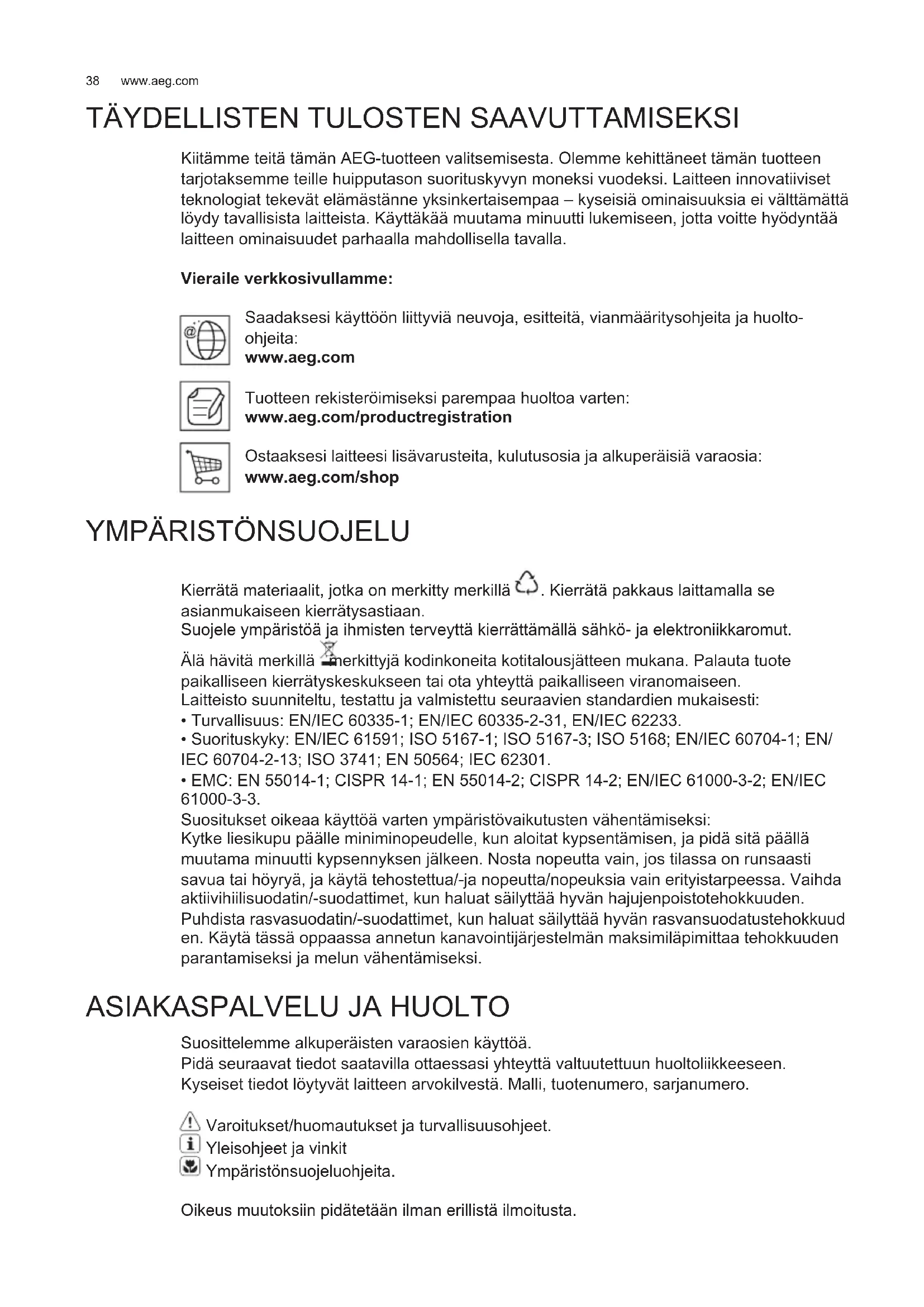 Kiitämme teitä tämän AEG-tuotteen valitsemisesta. Olemme kehittäneet tämän tuotteen tarjotaksemme teille huipputason suorituskyvyn moneksi vuodeksi. Laitteen innovatiiviset teknologiat tekevät elämästänne yksinkertaisempaa – kyseisiä ominaisuuksia ei välttämättä löydy tavallisista laitteista. Käyttäkää muutama minuutti lukemiseen, jotta voitte hyödyntää laitteen ominaisuudet parhaalla mahdollisella tavalla. Vieraile verkkosivullamme: Saadaksesi käyttöön liittyviä neuvoja, esitteitä, vianmääritysohjeita ja huolto- ohjeita: www.aeg.com Tuotteen rekisteröimiseksi parempaa huoltoa varten: www.aeg.com/productregistration Ostaaksesi laitteesi lisävarusteita, kulutusosia ja alkuperäisiä varaosia: www.aeg.com/shop