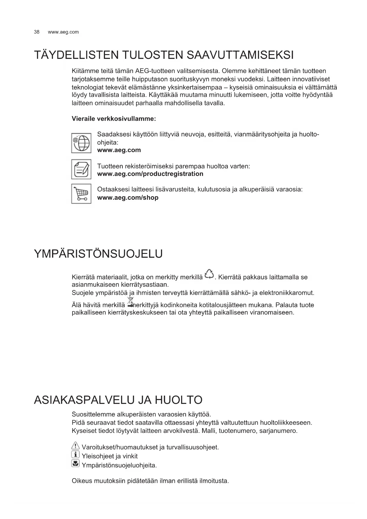 Kiitämme teitä tämän AEG-tuotteen valitsemisesta. Olemme kehittäneet tämän tuotteen tarjotaksemme teille huipputason suorituskyvyn moneksi vuodeksi. Laitteen innovatiiviset teknologiat tekevät elämästänne yksinkertaisempaa – kyseisiä ominaisuuksia ei välttämättä löydy tavallisista laitteista. Käyttäkää muutama minuutti lukemiseen, jotta voitte hyödyntää laitteen ominaisuudet parhaalla mahdollisella tavalla. Vieraile verkkosivullamme: Saadaksesi käyttöön liittyviä neuvoja, esitteitä, vianmääritysohjeita ja huolto- ohjeita: www.aeg.com Tuotteen rekisteröimiseksi parempaa huoltoa varten: www.aeg.com/productregistration Ostaaksesi laitteesi lisävarusteita, kulutusosia ja alkuperäisiä varaosia: www.aeg.com/shop