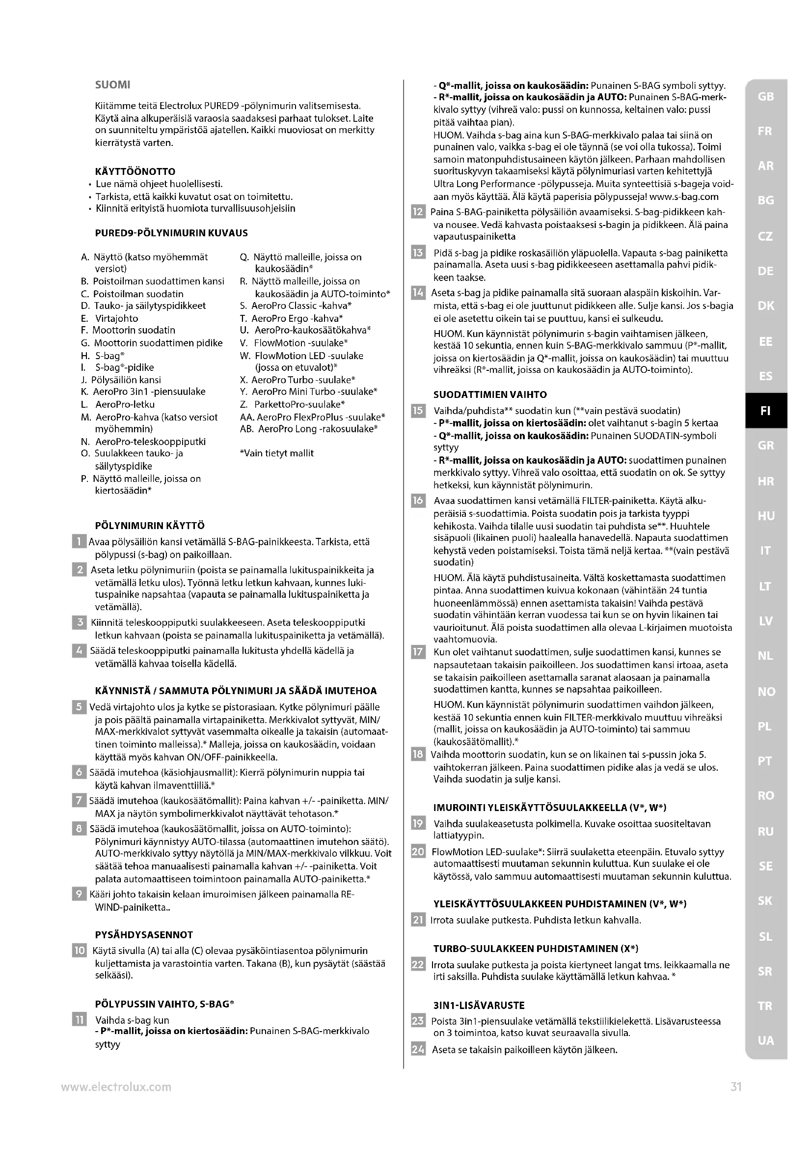 UASUOMI Kiitämme teitä Electrolux PURED9 -pölynimurin valitsemisesta. Käytä aina alkuperäisiä varaosia saadaksesi parhaat tulokset. Laite on suunniteltu ympäristöä ajatellen. Kaikki muoviosat on merkitty kierrätystä varten.
