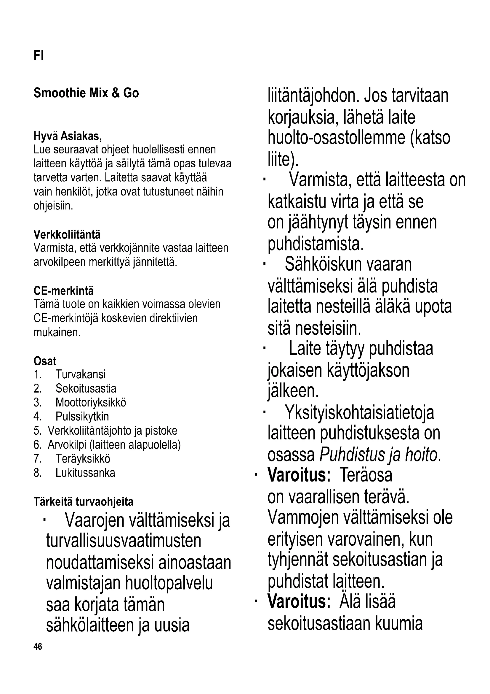 Tärkeitä turvaohjeita ∙ Vaarojen välttämiseksi ja turvallisuusvaatimusten noudattamiseksi ainoastaan valmistajan huoltopalvelu saa korjata tämän sähkölaitteen ja uusia liitäntäjohdon. Jos tarvitaan korjauksia, lähetä laite huolto-osastollemme (katso liite). ∙ Varmista, että laitteesta on katkaistu virta ja että se on jäähtynyt täysin ennen puhdistamista. ∙ Sähköiskun vaaran välttämiseksi älä puhdista laitetta nesteillä äläkä upota sitä nesteisiin. ∙ Laite täytyy puhdistaa jokaisen käyttöjakson jälkeen. ∙ Yksityiskohtaisia tietoja laitteen puhdistuksesta on osassa Puhdistus ja hoito. ∙ Varoitus: Teräosa on vaarallisen terävä. Vammojen välttämiseksi ole erityisen varovainen, kun tyhjennät sekoitusastian ja puhdistat laitteen. ∙ Varoitus: Älä lisää sekoitusastiaan kuumia FI47 aineksia. ∙ Ole varovainen, kun kaadat kuumia nesteitä, sillä laitteesta voi suihkuta ulos höyryä. ∙ Varoitus: Väärinkäytöstä saattaa seurata vakavia henkilövammoja. ∙ Irrota pistotulppa pistorasiasta aina - ennen laitteen lisäosan asentamista siihen tai purkua, - jos laitteessa on käyttöhäiriö - käytön jälkeen - kun laite ei ole valvottuna - ennen laitteen puhdistamista. ∙ Tämä laite on tarkoitettu kotitalouskäyttöön tai vastaavaan, kuten - ruokalat, toimistot ja muut kaupalliset ympäristöt - maatalousyritykset - hotellien, motellien jne. ja vastaavien yritysten asiakkaat - aamiaisen ja majoituksen tarjoavat majatalot. ∙ Henkilö, jolla on fyysisesti, aistillisesti tai henkisesti rajoittunut toimintakyky tai jolla on puuttuvat tai vajavaiset tiedot laitteen toiminnasta, saa käyttää laitetta vain siinä tapauksessa, että hän on valvonnan alaisena tai hänelle on annettu tarkat ohjeet laitteen käyttämiseen. Lisäksi hän ymmärtää täysin laitteen käyttöön liittyvät vaarat ja noudattaa tarvittavia turvatoimia. ∙ Lasten ei saa antaa käyttää laitetta. Laite ja sen liitäntäjohto on pidettävä poissa lasten ulottuvilta. ∙ Lasten ei saa antaa leikkiä laitteella.48 ∙ Varoitus: Pidä lapset poissa pakkausmateriaalien luota potentiaalisen vaaratilanteen esim. tukehtumisvaaran vuoksi. ∙ Tarkasta aina ennen laitteen käyttöä huolellisesti laitteen runko, liitäntäjohto ja mahdolliset asennetut lisäosat vaurioiden varalta. Jos laite on esimerkiksi pudonnut kovalle pinnalle tai liitäntäjohdon vetämiseen on käytetty liikaa voimaa, laitetta ei saa enää käyttää: näkymättömätkin vauriot voivat aiheuttaa laitetta käytettäessä vaaratilanteita. ∙ Laite tulisi asettaa aina tasaiselle alustalle. Älä anna laitteen rungon tai liitäntäjohdon joutua kosketuksiin avoliekkien tai kuumien pintojen (esim. lieden keittolevyjen) kanssa. ∙ Älä anna liitäntäjohdon roikkua laitteesta. ∙ Varoitus: Älä kiinnitä teräyksikköä moottoriyksikön päälle, ilman että sekoitusastia on asennettuna paikalleen. ∙ Älä koske liikkuvia osia käytön aikana; se saattaa olla erittäin vaarallista. ∙ Kun irrotat pistotulpan pistorasiasta, älä vedä liitäntäjohdosta; tartu aina pistotulppaan. ∙ Jos laite vahingoittuu väärinkäytön seurauksena tai siksi, että annettuja ohjeita ei ole noudatettu, valmistaja ei vastaa aiheutuneista vahingoista. Sekoitusastia ∙ Sekoitusastia suljetaan käytön jälkeen ruuvaamalla kansi kireälle sen päälle. Tällä tavoin smoothieta voidaan säilyttää käytännöllisesti tai kantaa. ∙ Smoothie voidaan kaataa suoraan sekoitusastiasta avaamalla lukitussanka. ∙ Kantta voidaan säilyttää käytännöllisesti kiinnittämällä se sekoitusastian pohjaan. Ennen ensikäyttöä Ennen kuin laitetta käytetään ensimmäistä kertaa, sekoitusastia ja teräyksikkö täytyy puhdistaa perusteellisesti kappaleessa Puhdistus ja hoito olevan kuvauksen mukaisesti. Lyhytaikainen käyttö Laite on suunniteltu käytettäväksi kotitalouksissa käytettävien keskimääräisten ruokamäärien käsittelyyn. Sitä voidaan käyttää keskeytyksettä enintään 1 minuutin ajan, jonka jälkeen sen täytyy antaa jäähtyä huonelämpötilaan. Turvakytkin Moottoriyksikössä on erityinen turvakytkin, joka varmistaa, ettei laitetta voi käynnistää, ellei sekoitusastia ole asetettuna kunnolla paikoilleen. Käyttö ∙ Pilko ainekset noin 15 mm kuutioiksi ja laita ne sekoitusastiaan. ∙ Parhaat tulokset saadaan aikaan laittamalla ainekset sekoitusastiaan seuraavassa järjestyksessä: