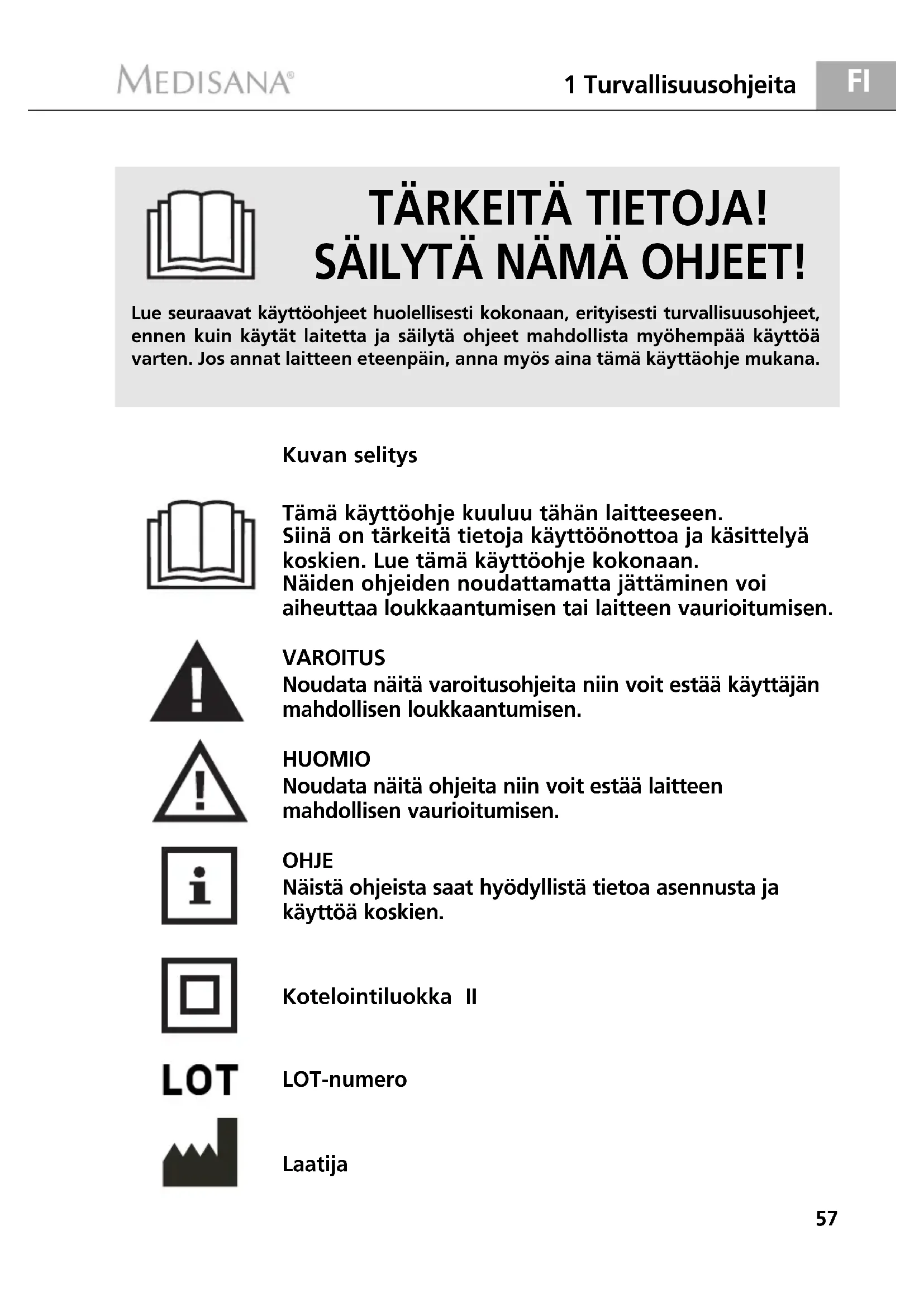 Jotta saisit parhaan mahdollisen hoitotuloksen ja voisit mahdollisimman pitkään käyttää MEDISANA Medistyle -laitettasi, suosittelemme seuraavien käyttö- ja hoito-ohjeiden lukemista.