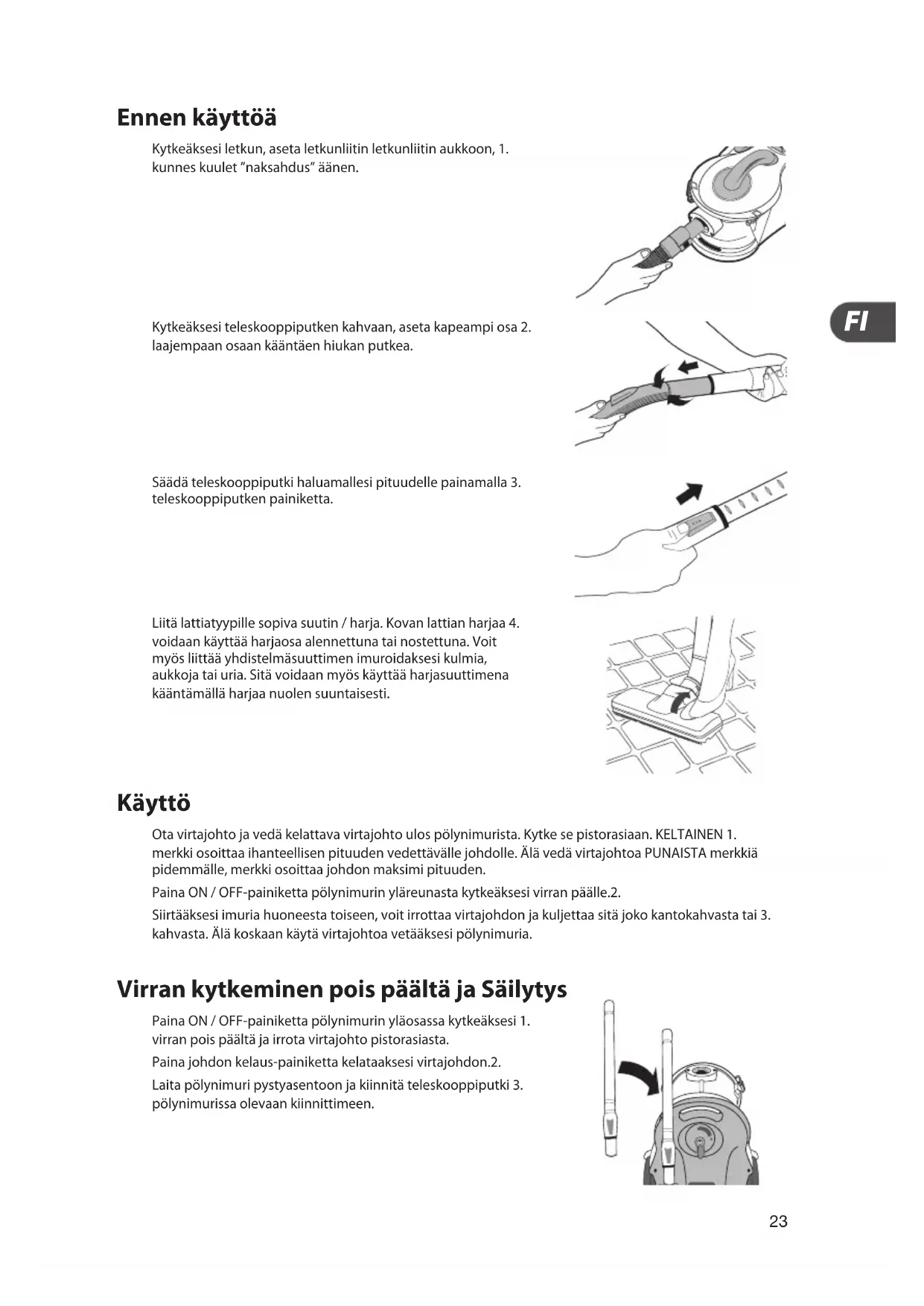 Säädä teleskooppiputki haluamallesi pituudelle painamalla 3. teleskooppiputken painiketta. Ennen käyttöä Kytkeäksesi letkun, aseta letkunliitin letkunliitin aukkoon, 1. kunnes kuulet ”naksahdus” äänen. Kytkeäksesi teleskooppiputken kahvaan, aseta kapeampi osa 2. laajempaan osaan kääntäen hiukan putkea. Käyttö Ota virtajohto ja vedä kelattava virtajohto ulos pölynimurista. Kytke se pistorasiaan. KELTAINEN 1. merkki osoittaa ihanteellisen pituuden vedettävälle johdolle. Älä vedä virtajohtoa PUNAISTA merkkiä pidemmälle, merkki osoittaa johdon maksimi pituuden. Paina ON / OFF-painiketta pölynimurin yläreunasta kytkeäksesi virran päälle.2. Siirtääksesi imuria huoneesta toiseen, voit irrottaa virtajohdon ja kuljettaa sitä joko kantokahvasta tai 3. kahvasta. Älä koskaan käytä virtajohtoa vetääksesi pölynimuria. Virran kytkeminen pois päältä ja Säilytys Paina ON / OFF-painiketta pölynimurin yläosassa kytkeäksesi 1. virran pois päältä ja irrota virtajohto pistorasiasta. Paina johdon kelaus-painiketta kelataaksesi virtajohdon.2. Laita pölynimuri pystyasentoon ja kiinnitä teleskooppiputki 3. pölynimurissa olevaan kiinnittimeen. Liitä lattiatyypille sopiva suutin / harja. Kovan lattian harjaa 4. voidaan käyttää harjaosa alennettuna tai nostettuna. Voit myös liittää yhdistelmäsuuttimen imuroidaksesi kulmia, aukkoja tai uria. Sitä voidaan myös käyttää harjasuuttimena kääntämällä harjaa nuolen suuntaisesti.24