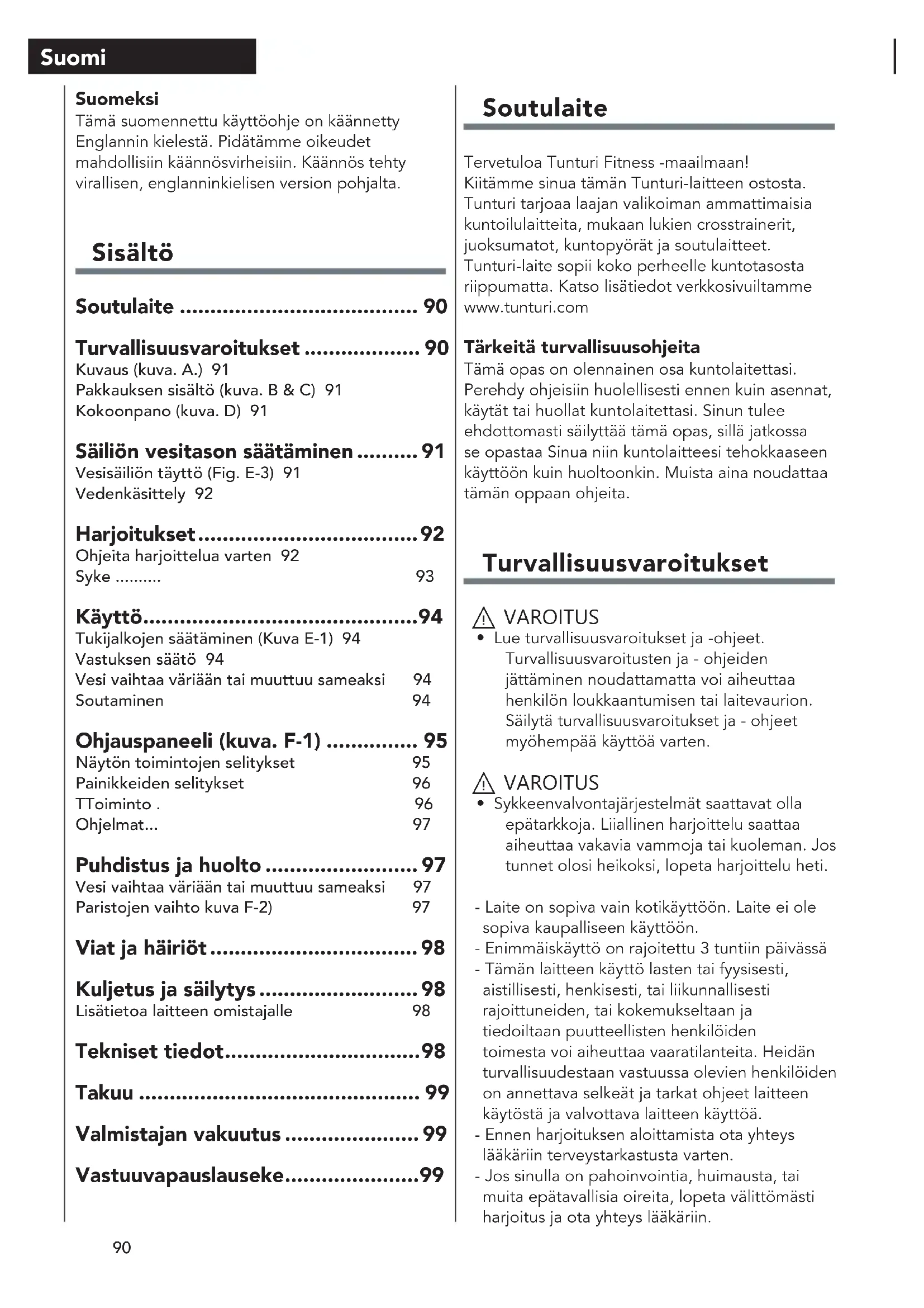 - Sykkeenvalvontajärjestelmät saattavat olla epätarkkoja. Liiallinen harjoittelu saattaa aiheuttaa vakavia vammoja tai kuoleman. Jos tunnet olosi heikoksi, lopeta harjoittelu heti. - Laite on sopiva vain kotikäyttöön. Laite ei ole sopiva kaupalliseen käyttöön. - Enimmäiskäyttö on rajoitettu 3 tuntiin päivässä - Tämän laitteen käyttö lasten tai fyysisesti, aistillisesti, henkisesti, tai liikunnallisesti rajoittuneiden, tai kokemukseltaan ja tiedoiltaan puutteellisten henkilöiden toimesta voi aiheuttaa vaaratilanteita. Heidän turvallisuudestaan vastuussa olevien henkilöiden on annettava selkeät ja tarkat ohjeet laitteen käytöstä ja valvottava laitteen käyttöä. - Ennen harjoituksen aloittamista ota yhteys lääkäriin terveystarkastusta varten. - Jos sinulla on pahoinvointia, huimausta, tai muita epätavallisia oireita, lopeta välittömästi harjoitus ja ota yhteys lääkäriin. Suomeksi Tämä suomennettu käyttöohje on käännetty Englannin kielestä. Pidätämme oikeudet mahdollisiin käännösvirheisiin. Käännös tehty virallisen, englanninkielisen version pohjalta. Sisältö Soutulaite ....................................... 90 Turvallisuusvaroitukset ................... 90 Kuvaus (kuva. A.) 91 Pakkauksen sisältö (kuva. B & C) 91 Kokoonpano (kuva. D) 91 Säiliön vesitason säätäminen .......... 91 Vesisäiliön täyttö (Fig. E-3) 91 Vedenkäsittely 92 Harjoitukset .................................... 92 Ohjeita harjoittelua varten 92 Syke .......... 93 Käyttö ............................................. 94 Tukijalkojen säätäminen (Kuva E-1) 94 Vastuksen säätö 94 Vesi vaihtaa väriään tai muuttuu sameaksi 94 Soutaminen 94 Ohjauspaneeli (kuva. F-1) ............... 95 Näytön toimintojen selitykset 95 Painikkeiden selitykset 96 TToiminto . 96 Ohjelmat ... 97 Puhdistus ja huolto ......................... 97 Vesi vaihtaa väriään tai muuttuu sameaksi 97 Paristojen vaihto kuva F-2) 97 Viat ja häiriöt .................................. 98 Kuljetus ja säilytys .......................... 98 Lisätietoa laitteen omistajalle 98 Tekniset tiedot ................................ 98 Takuu .............................................. 99 Valmistajan vakuutus ...................... 99 Vastuuvapauslauseke ...................... 9991 Suomi - Vältä lihaskipuja ja venähdyksiä aloittamalla jokainen harjoitus lämmittelyjaksolla ja päätä jokainen harjoitus jäähdyttelyjaksolla. Muista venytellä harjoittelun lopuksi. - Laite on sopiva vain sisäkäyttöön. Laite ei ole sopiva ulkokäyttöön. - Käytä laitetta riittävällä tuuletuksella varustetuissa tiloissa. Älä käytä laitetta vetoisissa tiloissa välttääksesi kylmettymisen. - Käytä laitetta vain ympäristölämpötilassa 10 °C - 35 °C. Säilytä laitetta vain ympäristölämpötilassa 5 °C - 45 °C. - Älä käytä tai säilytä laitetta kosteissa tiloissa. Ilmankosteus ei saa koskaan olla yli 80 %. - Käytä laitetta vain sen aiottuun tarkoitukseen. Älä käytä laitetta muihin, kuin tässä käyttöoppaassa esitettyihin tarkoituksiin. - Älä käytä laitetta, jos sen jokin osa on vaurioitunut tai viallinen. Jos osa on vaurioitunut tai viallinen, ota yhteys jälleenmyyjään. - Pidä kätesi, jalkasi ja kehon muut osat pois liikkuvista osista. - Pidä hiuksesi pois liikkuvista osista. - Käytä asianmukaista vaatetusta ja kenkiä. - Pidä vaatteet, korut ja muut esineet pois liikkuvista osista. - Varmista, että vain yksi henkilö kerrallaan käyttää laitetta. Yli 150 kg (330 lbs) ainava henkilö ei saa käyttää laitetta. - Älä avaa laitetta ilman yhteydenottoa jälleenmyyjääsi. Kuvaus (kuva. A.) Soutulaitteesi on paikallaan pysyvä kuntoilulaite, jota käytetään simuloimaan soutua ilman liiallista rasitusta niveliin. Pakkauksen sisältö (kuva. B & C) - Pakkaus sisältää kuvassa B näytetyt osat. - Pakkaus sisältää kuvassa C näytetyt kiinnittimet. Katso “Kuvaus”-osiota. ‼ ILMOITUS