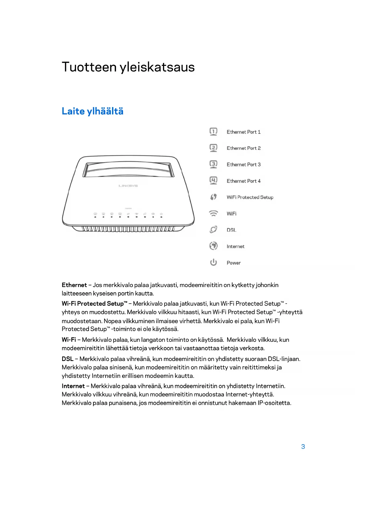 Ethernet - -- Jos merkkivalo palaa jatkuvasti, modeemireititin on kytketty johonkin laitteeseen kyseisen portin kautta. Wi-Fi Protected Setup™ - -- Merkkivalo palaa jatkuvasti, kun Wi-Fi Protected Setup™ - yhteys on muodostettu. Merkkivalo vilkkuu hitaasti, kun Wi-Fi Protected Setup™ -yhteyttä muodostetaan. Nopea vilkkuminen ilmaisee virhettä. Merkkivalo ei pala, kun Wi-Fi Protected Setup™ -toiminto ei ole käytössä. Wi-Fi - -- Merkkivalo palaa, kun langaton toiminto on käytössä. Merkkivalo vilkkuu, kun modeemireititin lähettää tietoja verkkoon tai vastaanottaa tietoja verkosta. DSL - -- Merkkivalo palaa vihreänä, kun modeemireititin on yhdistetty suoraan DSL-linjaan. Merkkivalo palaa sinisenä, kun modeemireititin on määritetty vain reitittimeksi ja yhdistetty Internetiin erillisen modeemin kautta. Internet - -- Merkkivalo palaa vihreänä, kun modeemireititin on yhdistetty Internetiin. Merkkivalo vilkkuu vihreänä, kun modeemireititin muodostaa Internet-yhteyttä. Merkkivalo palaa punaisena, jos modeemireititin ei onnistunut hakemaan IP-osoitetta. 3Virta - -- Merkkivalo palaa vihreänä, kun modeemireitittimeen on kytketty virta. Merkkivalo vilkkuu, kun modeemireititin on itsediagnostiikkatilassa käynnistyksen aikana. Kun diagnostiikka on valmis, merkkivalo palaa jatkuvasti. Merkkivalo palaa punaisena, jos laitteessa tapahtuu virhe. Laite takaa