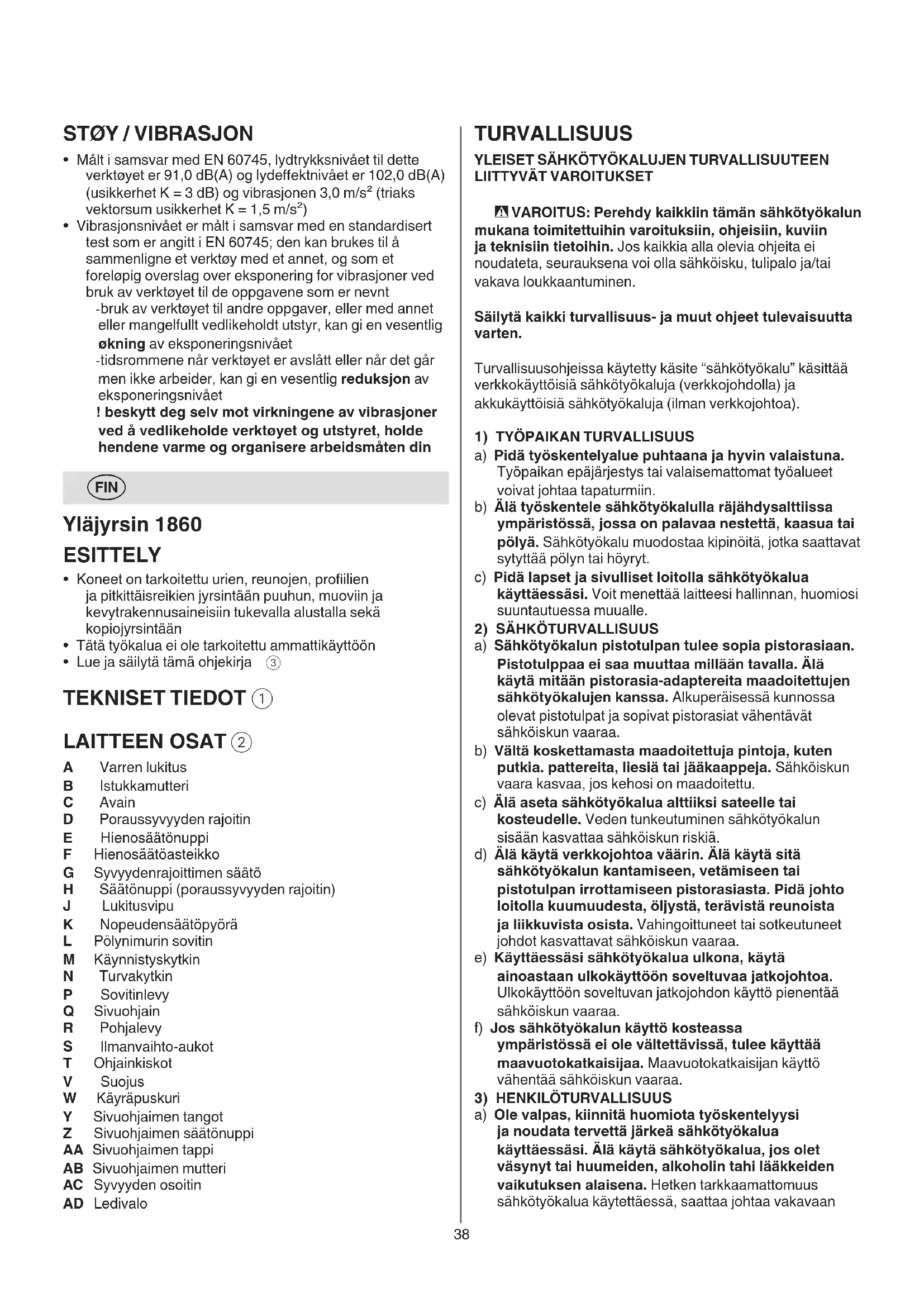 VAROITUS: Perehdy kaikkin tämän sahkötyokalun mukana toimitettuihin varoituksiin, ohjeisiin, kuviin ja teknisiin tietoin. Jos kaikkia alla olevia ohjeita ei noudateta, seurauksena voi olla sahköisku, tulipalo ja/tai yakava loukkaantuminen.