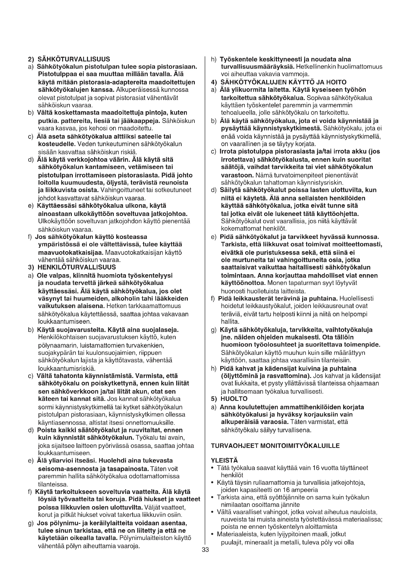 a) Ole valpas, kiinnitä huomiota työskentelyysi ja noudata tervettä järkeä sähkötyökalua käyttäessäsi. Älä käytä sähkötyökalua, jos olet väsynyt tai huumeiden, alkoholin tahi lääkkeiden vaikutuksen alaisena. Hetken tarkkaamattomuus sähkötyökalua käytettäessä, saattaa johtaa vakavaan loukkaantumiseen. b) Käytä suojavarusteita. Käytä aina suojalaseja. Henkilökohtaisen suojavarustuksen käyttö, kuten pölynaamarin, luistamattomien turvakenkien, suojakypärän tai kuulonsuojaimien, riippuen sähkötyökalun lajista ja käyttötavasta, vähentää loukkaantumisriskiä. c) Vältä tahatonta käynnistämistä. Varmista, että sähkötyökalu on poiskytkettynä, ennen kuin liität sen sähköverkkoon ja/tai liität akun, otat sen käteen tai kannat sitä. Jos kannat sähkötyökalua sormi käynnistyskytkimellä tai kytket sähkötyökalun pistotulpan pistorasiaan, käynnistyskytkimen ollessa käyntiasennossa, altistat itsesi onnettomuuksille. d) Poista kaikki säätötyökalut ja ruuvitaltat, ennen kuin käynnistät sähkötyökalun. Työkalu tai avain, joka sijaitsee laitteen pyörivässä osassa, saattaa johtaa loukkaantumiseen. e) Älä yliarvioi itseäsi. Huolehdi aina tukevasta seisoma-asennosta ja tasapainosta. Täten voit paremmin hallita sähkötyökalua odottamattomissa tilanteissa. f) Käytä tarkoitukseen soveltuvia vaatteita. Älä käytä löysiä työvaatteita tai koruja. Pidä hiukset ja vaatteet poissa liikkuvien osien ulottuvilta. Väljät vaatteet, korut ja pitkät hiukset voivat takertua liikkuviin osiin. g) Jos pölynimu- ja keräilylaitteita voidaan asentaa, tulee sinun tarkistaa, että ne on liitetty ja että ne käytetään oikealla tavalla. Pölynimulaitteiston käyttö vähentää pölyn aiheuttamia vaaroja.34 ja huolehdi siitä, ettei lähellä ole muita henkilöitä eikä tulenarkoja materiaaleja