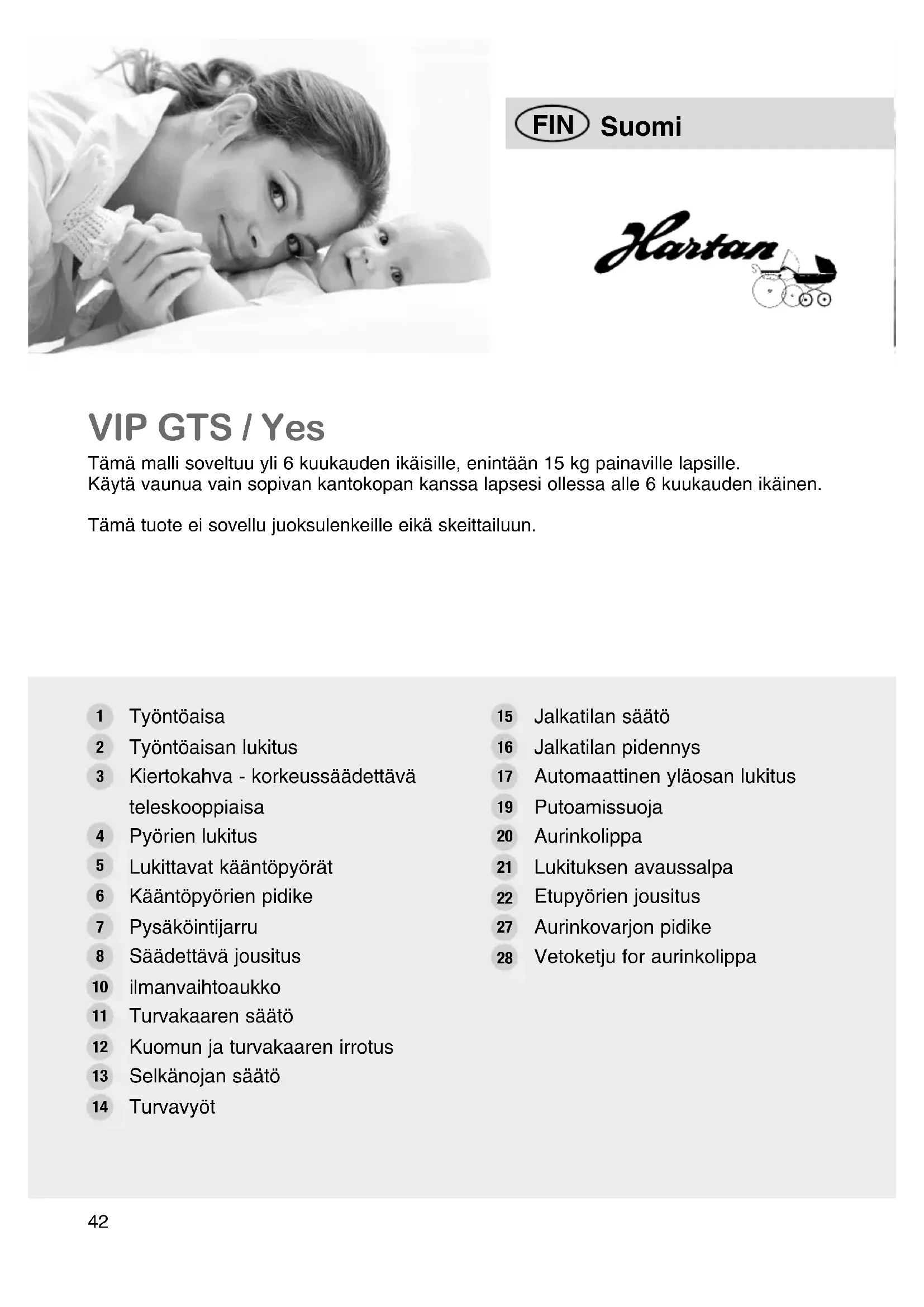 28Onnittelumme Koska haluat vauvasi tuntevan olonsa hyväksi ja turvalliseksi, olet valinnut korkealuokkaisen -tuotteen, ja olet siten tehnyt erittäin hyvän päätöksen. Ensiluokkaiset valmistusmenetelmät ja jatkuva tiukka laaduntarkkailu varmistavat, että Sinulla tulee olemaan pitkäksi aikaa iloa -vaunuista. Valmistukseen käytetyt tekstiilit eivät todistetusti sisällä haitallisia aineita, mikä takaa vauvasi turvallisuuden. Huom! Lue kaikki ohjeet huolellisesti ennen lastenvaunujen käyttöä ja säilytä ohjeet mahdollista myöhempää tarvetta varten. Näiden ohjeiden huomiottajättäminen voi vaarantaa lapsesi turvallisuutta. Ota yhteyttä myyjään jos et ymmärrä käyttöohjetta tai jos haluat lisätietoja. Varmista, että myös muut näiden vaunujen käyttäjät tuntevat vaunun toiminnot ja turvallisuusohjeet. VaRoituS! – Tarkista ennen käyttöä, että vaunut eivät ole rikkoontuneet eikä mikään osa ole revennyt tai murtunut. Jos näin on, vaunuja ei missään tapaukses sa saa käyttää. VaRoituS! – Varmista tapaturmien välttämiseksi, että lapsesi ei ole lähellä rattaita niitä avattaessa ja kiinnilaitettaessa. VaRoituS! – Älä koskaan jätä lastasi vartioimatta vaunuihin. VaRoituS! – Varmista ennen käyttöä, että vaunukoppa tai istuin tai autonistuin on kiinnittynyt kunnolla. VaRoituS! – J os vaunuilla ajetaan rappuja tai portaita pitkin tai jos vaunut ylikuormiteta an, ne voivat rikkoontua ja siten vaarantaa lapsen turvallisuutta. VaRoituS! – Lukitse jarrut aina kun jätät vaunut seisomaan paikoilleen. Jos kuljet vaunujen kanssa yleisissä kulkuneuvoissa, varmista aina, että vaunut pysyvät tukevasti paikallaan. VaRoituS! – Lastenvaunut, rattaat ja kantokoppa on tarkoitettu ainoastaan lapsen kuljettamiseen, ne eivät korvaa sänkyä tai kehtoa. VaRoituS! – Näiden lastenvaunujen käyttö samanaikaisesti kun hölkkäilet, lautailet tms. on vaarallista ja siistä syystä kielletty. VaRoituS! – Pidä huoli, että lapset eivät leiki vaunun läheisyydessä eivätkä itse vaunulla. VaRoituS! – Käytä aina turvavöitä. VaRoituS! – Älä kiinnitä laukkuja eikä kuormia työntötankoon, selkänojaan eikä vaunujen sivuille. Se vaikuttaa heikentävästi vaunun vakauteen. VaRoituS! – Tämä malli on tarkoitettu yhtä lasta varten. VaRoituS! – Tässä mallissa ei saa käyttää lisäistuimia. VaRoituS! – Istuinta, lastenvaunujen yläosaa ja kantolaukkua ei saa käyttää kuljetukseen autossa. VaRoituS! – Älä käytä sadesuojaa sellaisenaan jos olet irrottanut ja ottanut pois kuo mun paikaltaan (tukehtumisen vaara). Älä koskaan käytä sadesuojaa aurin gonpaahteessa kun lapsesi on vaunussa (ylikuumennuksen vaara). VaRoituS! – Pidä vaunu turvallisen välimatkan etäisyydellä avonaisesta tulesta ja mui sta lämmönlähteistä. VaRoituS! – Poista heti kaikki muoviset pakkauspussit. Älä anna lapsesi leikkiä niillä (tukehtumisen vaara). VaRoituS! – Ei saa käyttää varusteita eikä varaosia, joita valmistaja ei ole hyväksynyt. Lapsen turvallisuuden varmistamiseksi