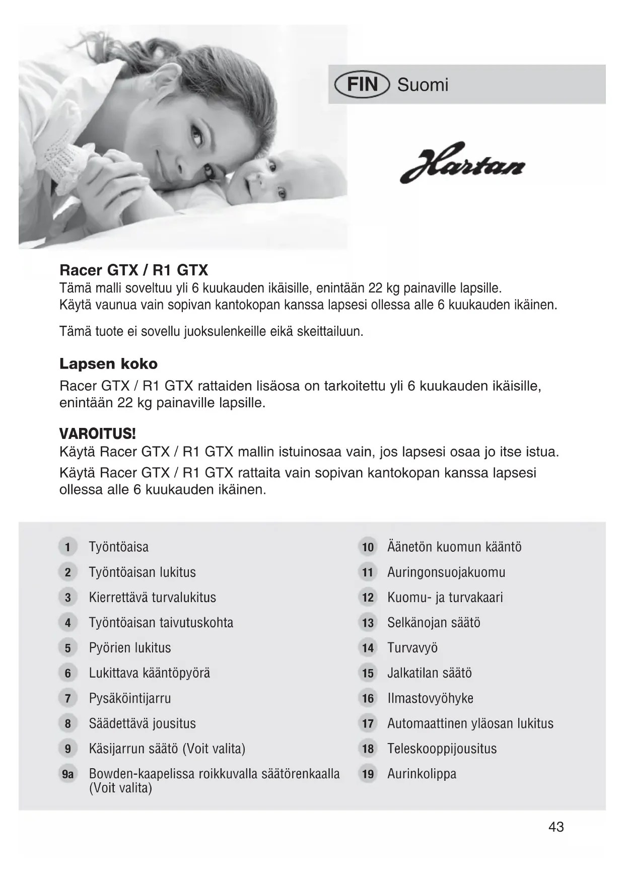 Racer GTX / R1 GTX Tämä malli soveltuu yli 6 kuukauden ikäisille, enintään 22 kg painaville lapsille. Käytä vaunua vain sopivan kantokopan kanssa lapsesi ollessa alle 6 kuukauden ikäinen. Tämä tuote ei sovellu juoksulenkeille eikä skeittailuun. Työntöaisa Työntöaisan lukitus Kierrettävä turvalukitus Työntöaisan taivutuskohta Pyörien lukitus Lukittava kääntöpyörä Pysäköintijarru Säädettävä jousitus Käsijarrun säätö (Voit valita) Bowden-kaapelissa roikkuvalla säätörenkaalla (Voit valita) Äänetön kuomun kääntö Auringonsuojakuomu Kuomu- ja turvakaari Selkänojan säätö Turvavyö Jalkatilan säätö Ilmastovyöhyke Automaattinen yläosan lukitus Teleskooppijousitus Aurinkolippa