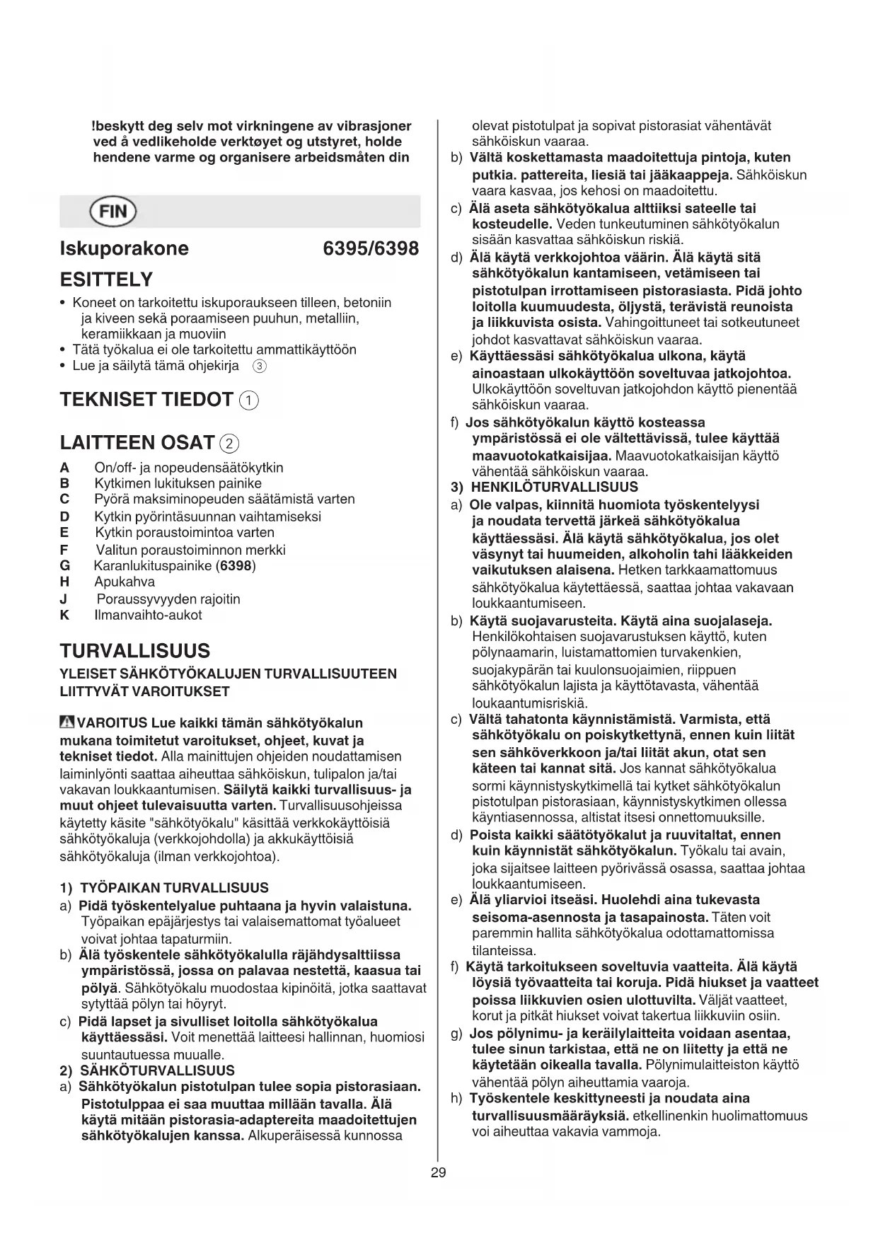 f) Jos sahkötyokalun käytto kosteassa ympäristössä ei ole välttävissä, tulee käyttaa maavuotokatkaisijaa. Maavuotokatkaisijan käytto vahentä sahköiskun vaaraa.