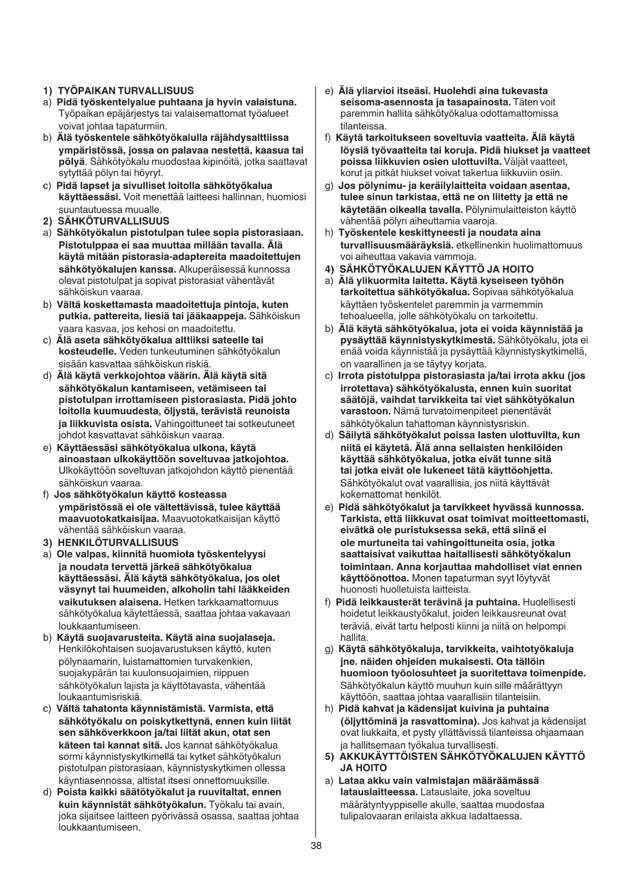 VAROITUS Lue kaikki tän sahkötyokalun mukana toimitetut varoitukset, ohjeet, kuvat ja tekniset tiedot. Alla mainittujen ohjeiden noudattamisen laiminlyonti saattaa aiheuttaa sahköiskun, tulipalon ja/taivakavan loukkaantumisen. Sailyta kaikki turvallisuus- ja muut ojeet tuleaisuutta varten. Turvallisuohjeissa kayetty kasite "sahkötyokalu" kasittaa verkkokayttoisiä sahkötyokaluja (verkojohdolla) ja akkukayttoisiä sahkötyokaluja (ilman verkojohtoa).
