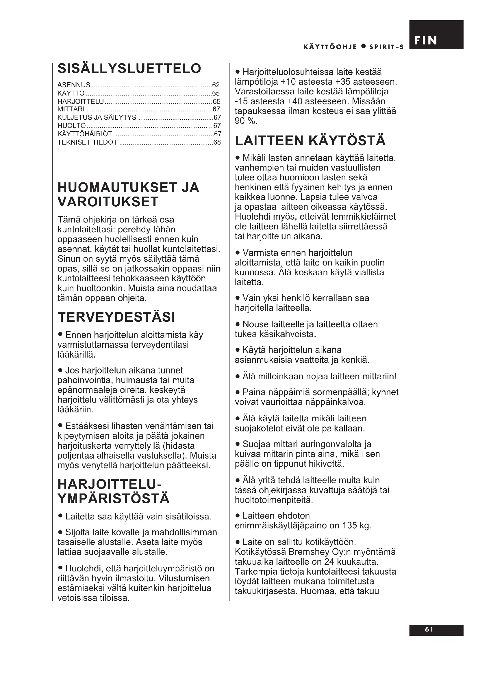 - Varmista ennen harjoittelun aloittamista, etta laite on kaikin puolin kunnossa. Alä koskaan käytä vialista laitetta.