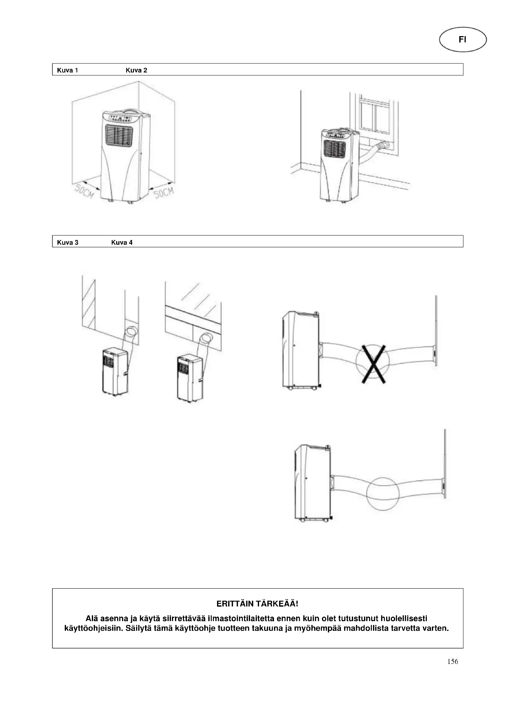 Asennus Laite sijoitetaan lattialle 50 cm etäisyydelle muista kohteista, koska laitteen teho voi muuten vaikuttaa näihin huomattavasti (kuva 1). Varoitus: Ennen laitteen käyttöönottoa laitteen pitäisi antaa olla paikoillaan pystyasennossa vähintään 24 tuntia. Laitetta voidaan siirtää ongelmitta eri tiloihin, kuitenkin seuraavat seikat on otettava huomioon: Poistoilmaletkun asennus, kuvat 2 ja 3