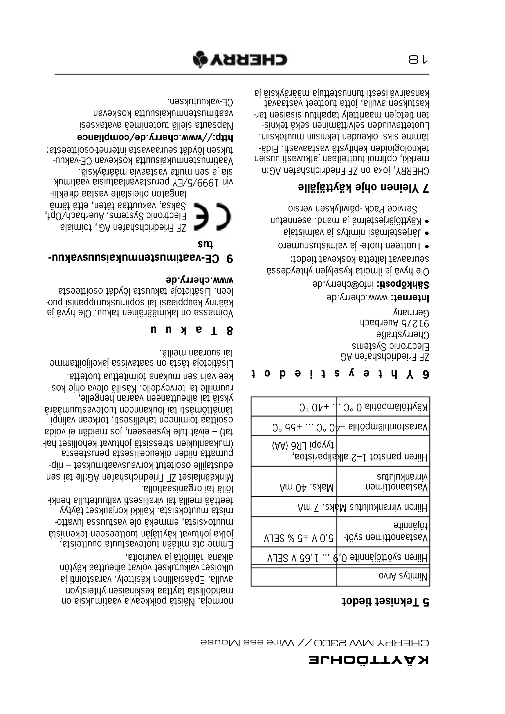 CHERRY MW 2300 // Wireless Mouse18 5 Tekniset tiedot 6Yhteystiedot ZF Friedrichshafen AG Electronic Systems Cherrystraße 91275 Auerbach Germany Internet: www.cherry.de Sähköposti: info@cherry.de Ole hyvä ja ilmoita kyselyjen yhteydessä seuraavat laitetta koskevat tiedot: