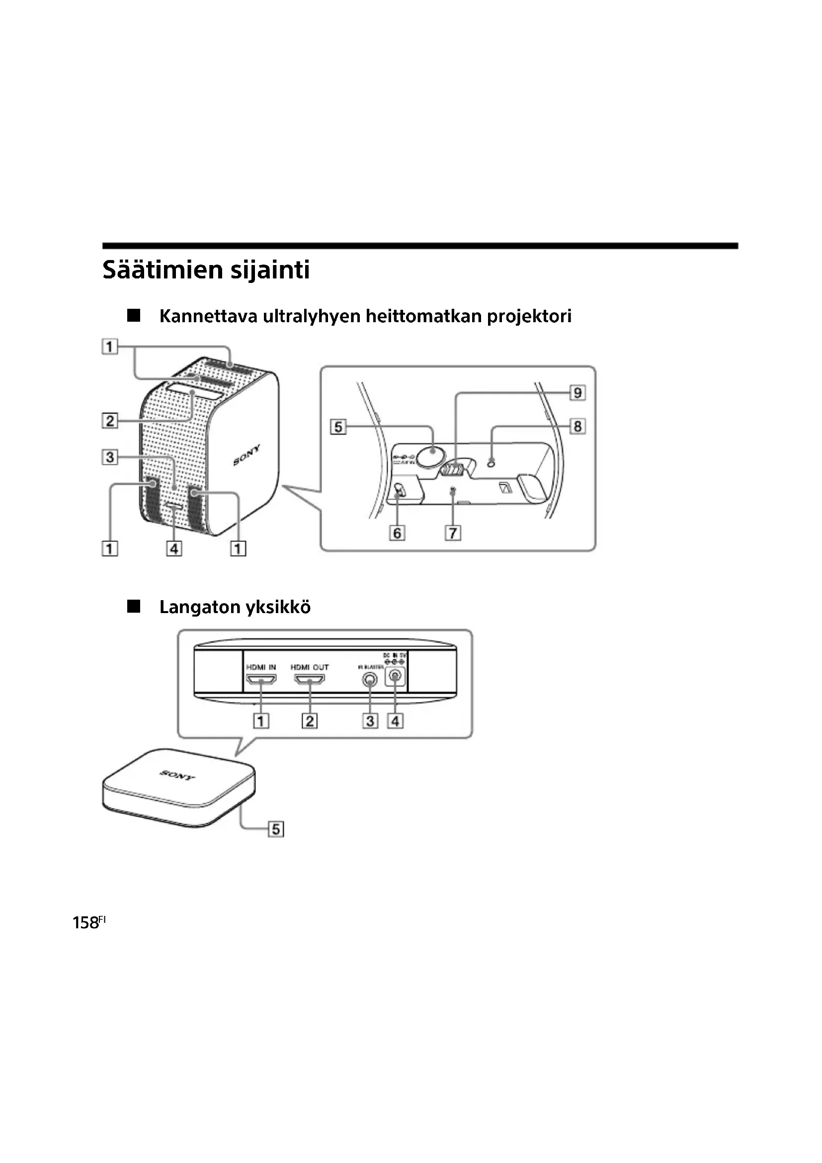 FI Kannettava ultralyhyen heittomatkan projektori Tuuletusaukot (tulo/poisto) Projektioikkuna (laseraukko) Virtailmaisin Virtapainike DC IN 19.5V -liitäntä Etäisyysanturi RESET-painike Latausilmaisin Telineen virtaliitäntä (lisävaruste) Langaton yksikkö HDMI IN -liitin HDMI OUT (läpivienti) -liitin IR BLASTER -liitin DC IN 5V -liitäntä PAIRING-painike VAROITUS Ilmoitus EU-maiden asiakkaille Valmistaja: Sony Corporation, 1-7-1 Konan Minato-ku Tokyo, 108-0075, Japani EU vaatimusten mukaisuus: Sony Belgium, bijkantoor van Sony Europe Limited, Da Vincilaan 7-D1, 1935 Zaventem, Belgia Sony Corporation vakuuttaa, että tämä laite on direktiivin 2014/53/EU mukainen. EU-vaatimustenmukaisuusvakuutuksen täysimittainen teksti on saatavilla seuraavassa internetosoitteessa: http://www.compliance.sony.de/ 5150-5350 MHz:n kaista on rajoitettu ainoastaan sisäkäyttöön. Nämä rajoitukset koskevat seuraavia maita: AT/BE/BG/CZ/DK/EE/FI/FR/DE/EL/HU/IE/ IT/LU/NL/NO/PL/PT/RO/ES/SE/CH/UK