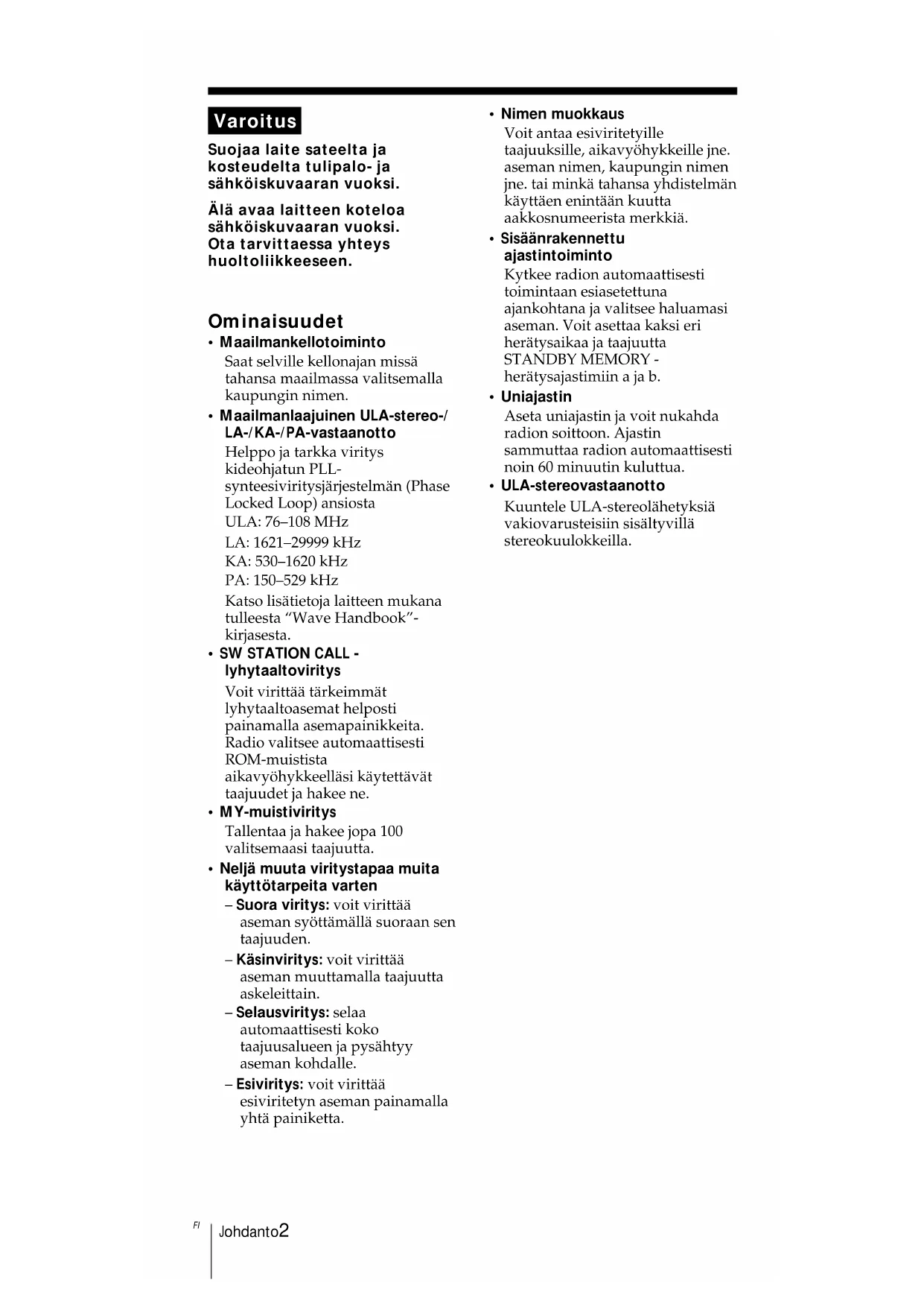 Varoitus Suojaa laite sateelta ja kosteudelta tulipalo- ja sähköiskuvaaran vuoksi. Älä avaa laitteen koteloa sähköiskuvaaran vuoksi. Ota tarvittaessa yhteys huoltoliikkeeseen. Ominaisuudet