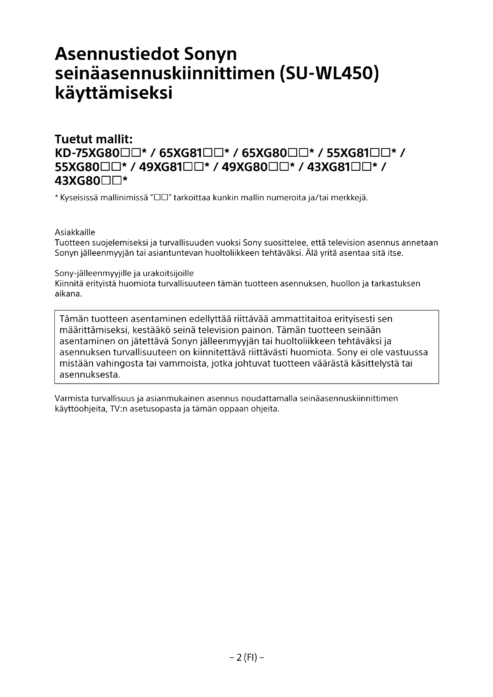Tämän tuotteen asentaminen edellyttä riittävä ammattitaitoa erityisesti sen märittämiseksi,kestäkö seinä television painon. Tämän tuotteen seinaan asentaminen on jatettäv Sonyn jalleenmyyjan tai huoltolikkeen tehtäväksi ja asennuksen turvallisuuteen on kiinnitettävi riittävästi huomiota. Sony ei ole vastuussa mistaan vahingosta tai vammoista, jotka johtuvat tuotteen vaärastä käsittelysta tai asennuksesta.