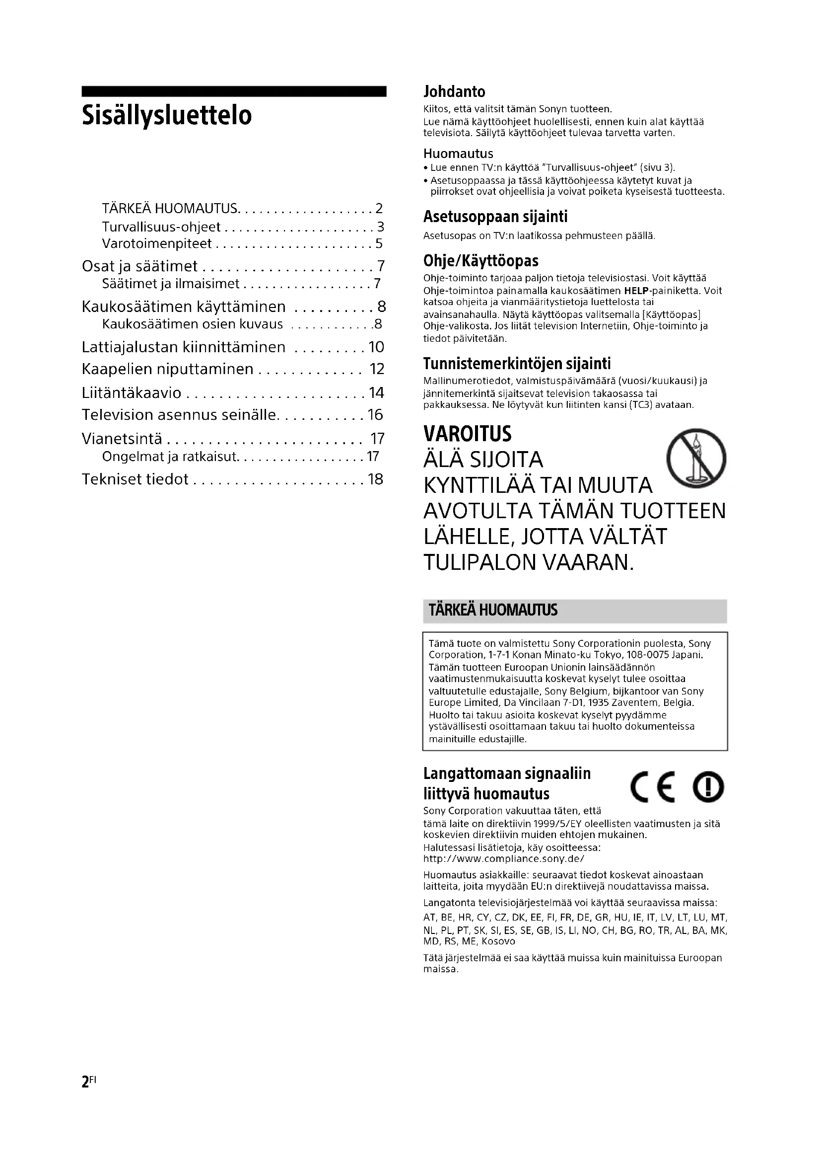 TULIPALON VAARAN. Langattomaan signaaliin liittyvä huomautus Sony Corporation vakuuttaa täten, että tämä laite on direktiivin 1999/5/EY oleellisten vaatimusten ja sitä koskevien direktiivin muiden ehtojen mukainen.Halutessasi lisätietoja, käy osoitteessa:http://www.compliance.sony.de/Huomautus asiakkaille: seuraavat tiedot koskevat ainoastaan laitteita, joita myydään EU:n direktiivejä noudattavissa maissa.Langatonta televisiojärjestelmää voi käyttää seuraavissa maissa: AT, BE, HR, CY, CZ, DK, EE, FI, FR, DE, GR, HU, IE, IT, LV, LT, LU, MT, NL, PL, PT, SK, SI, ES, SE, GB, IS, LI, NO, CH, BG, RO, TR, AL, BA, MK, MD, RS, ME, KosovoTätä järjestelmää ei saa käyttää muissa kuin mainituissa Euroopan maissa.