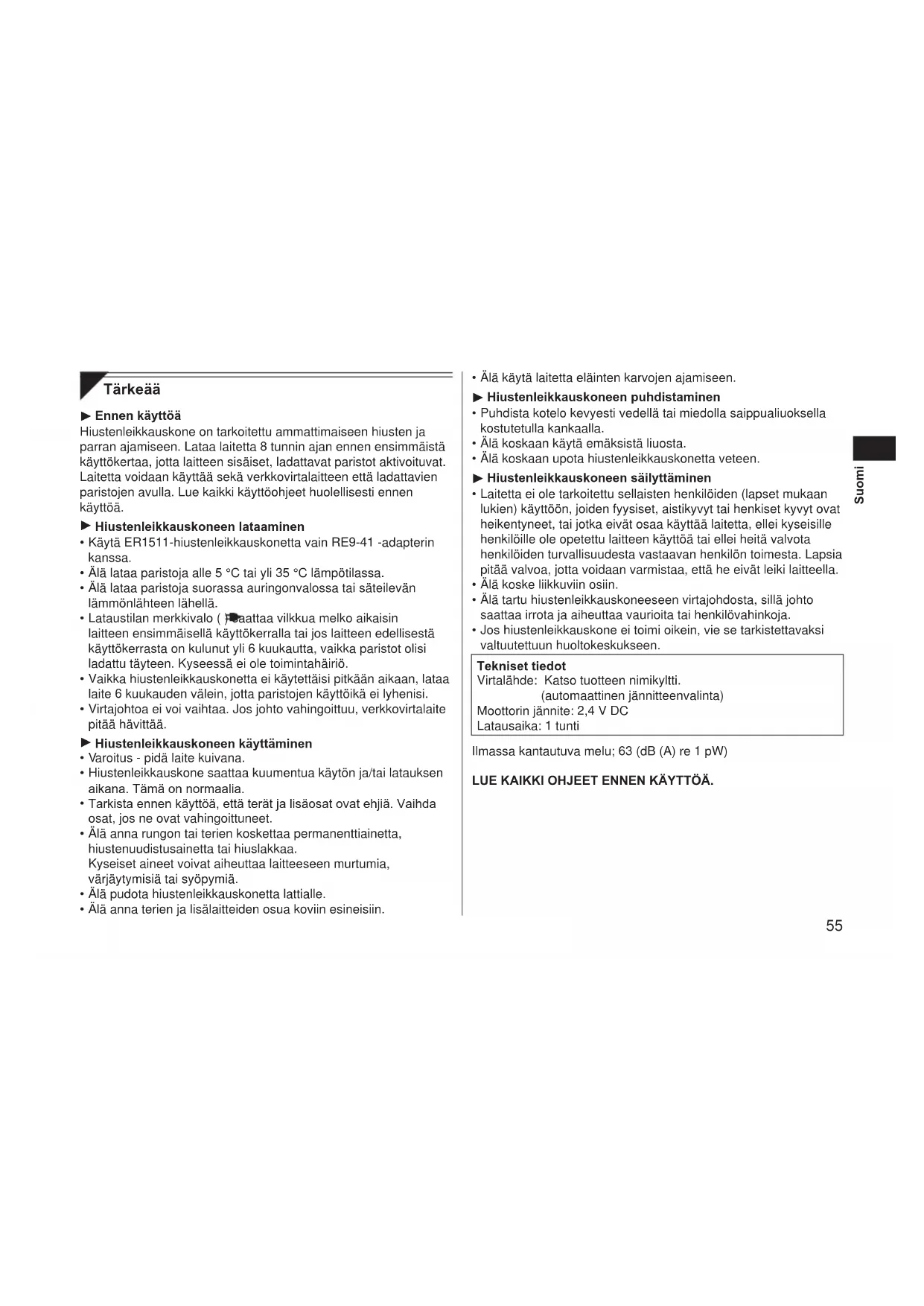 Älä käytä laitetta eläinten karvojen ajamiseen. Hiustenleikkauskoneen puhdistaminen Puhdista kotelo kevyesti vedellä tai miedolla saippualiuoksella kostutetulla kankaalla. Älä koskaan käytä emäksistä liuosta. Älä koskaan upota hiustenleikkauskonetta veteen. Hiustenleikkauskoneen säilyttäminen Laitetta ei ole tarkoitettu sellaisten henkilöiden (lapset mukaan lukien) käyttöön, joiden fyysiset, aistikyvyt tai henkiset kyvyt ovat heikentyneet, tai jotka eivät osaa käyttää laitetta, ellei kyseisille henkilöille ole opetettu laitteen käyttöä tai ellei heitä valvota henkilöiden turvallisuudesta vastaavan henkilön toimesta. Lapsia pitää valvoa, jotta voidaan varmistaa, että he eivät leiki laitteella. Älä koske liikkuviin osiin. Älä tartu hiustenleikkauskoneeseen virtajohdosta, sillä johto saattaa irrota ja aiheuttaa vaurioita tai henkilövahinkoja. Jos hiustenleikkauskone ei toimi oikein, vie se tarkistettavaksi valtuutettuun huoltokeskukseen. Tekniset tiedot Virtalähde: Katso tuotteen nimikyltti. (automaattinen jännitteenvalinta) Moottorin jännite: 2,4 V DC Latausaika: 1 tunti Ilmassa kantautuva melu; 63 (dB (A) re 1 pW) LUE KAIKKI OHJEET ENNEN KÄYTTÖÄ.