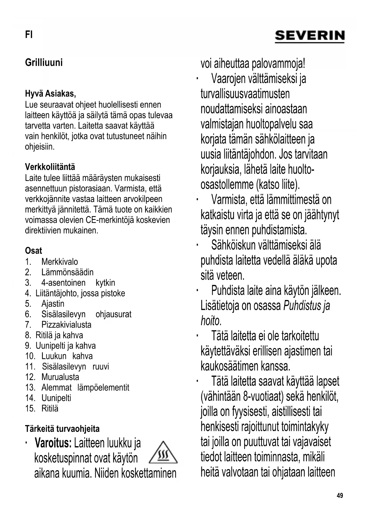 ∙ Avaa kuuma ovi käytön jälkeen aina kahvasta. Käytä uunipellin tai ritilän poistamiseen oheista kahvaa. Sijoita uunipelti ja ritilä aina kuumuutta kestävälle alustalle. ∙ Irrota pistotulppa seinäpistorasiasta käytön jälkeen. Kypsennysajat Alla olevat grillaus-/kypsennysajat ovat keskimääräisiä, sillä kaikki kypsennettävä ruoka on erilaista. Katso myös ruoan pakkausmerkintöjä. Ruoka Lämpö/ asetus Grillaus/ kypsennysaika Pizza (pakastettu) 200°C 9-10 min. Päällystetty leipä 220°C 10-14 min. Patonki (pakastettu) 200°C 14-15 min. Puhdistus ja hoito ∙ Irrota aina pistotulppa pistorasiasta ja anna laitteen jäähtyä kunnolla ennen sen puhdistamista. ∙ Sähköiskun välttämiseksi älä puhdista laitetta vedellä. Älä myöskään upota sitä veteen. ∙ Älä käytä hankaavia, voimakkaita puhdistusaineita tai spray-tyyppisiä uuninpuhdistusaineita. ∙ Laitteen ulkopinta tulee puhdistaa kostealla, nukkaantumattomalla kankaalla. ∙ Uunipelti ja ritilä voidaan pestä kuumalla vedellä ja miedolla pesuaineella tai astianpesukoneessa. ∙ Murualustan voi ottaa ulos puhdistusta varten. Jos alustalle on kerääntynyt paljon rasvaa, puhdista alusta ensin paperipyyhkeellä. Varmista, että murualusta asennetaan puhdistuksen jälkeen kunnolla paikoilleen lämpöelementtien alle. ∙ Anna pizzakivialustan jäähtyä kokonaan ennen puhdistamista. Pintaan jääneen ruoan voi raapia pois puulastalla. Koska alustan pinta on huokoinen, on normaalia, että se värjäytyy ollessaan kosketuksessa ruoan kanssa. Jos huuhtelet alustan vedellä53 puhdistuksen yhteydessä, varmista, että se on kokonaan kuivunut ennen kuin käytät sitä uudelleen, Vain täysin kuivalla alustalla saadaan paras paistotulos. ∙ Oven sisälasilevy voidaan myös irrottaa puhdistusta varten. Avaa luukku vaakasuoraan asentoon, avaa ruuvi ja vedä lasilevy ulos. Pese ja kuivaa se sitten kauttaaltaan. Asenna sisälasilevy takaisin paikalleen sijoittamalla se lasiovessa olevien ohjausurien väliin. Varmista, että se sijaitsee oikein keskellä olevien ohjausurien yläpuolella ja molempien ulompien ohjausurien alapuolella. Kun sijoitat levyn takaisin, varmista, että oikea puoli on ylöspäin – eli kumitiivisteen avoin puoli (läpällinen) on alaspäin kiinteää levyä vasten. Kiristä jälleen ruuvi. Jätehuolto Tällä symbolilla merkityt laitteet täytyy hävittää kotitalousjätteestä erillään, sillä ne sisältävät arvokkaita kierrätyskelpoisia materiaaleja. Asianmukaisella hävittämisellä suojellaan ympäristöä ja ihmisterveyttä. Saat aiheesta lisätietoa paikallisilta viranomaisilta tai jälleenmyyjiltä. Takuu Laitteelle myönnetään 2 vuoden takuu, joka koskee valmistus- ja ainevikoja, ostopäivästä lukien yksilöityä ostokuittia vastaan yleisten Suomessa kulloinkin alalla voimassa olevien takuuehtojen mukaan. Mikäli laitetta käytetään väärin, käyttöohjeen vastaisesti tai huolimattomasti, vastuu syntyvistä esine- ja henkilövahingoista lankeaa laitteen käyttäjälle. Tämä takuu ei vaikuta lakimääräisiin oikeuksiin eikä mihinkään muihin kansallisen lainsäädännön säätämiin tuotteiden ostoa koskeviin laillisiin kuluttajaoikeuksiin, joita tuotteen hankkijalla on. Valmistuttaja: Severin Elektrogeräte GmbH, Saksa Maahantuoja: Oy Harry Marcell Ab PL 63, 01511 VANTAA Puh (09) 870 87860 Fax (09) 870 87801 www.harrymarcell.fi asiakaspalvelu@harrymarcell.fi54 Piekarnik-Toster Szanowni Klienci! Przed użyciem urządzenia proszę dokładnie zapoznać się z poniższą instrukcją, którą należy zachować do późniejszego wglądu. Urządzenie może być obsługiwane wyłącznie przez osoby, które zapoznały się z niniejszą instrukcją. Podłączenie do sieci zasilającej Urządzenie należy podłączać do sieci elektrycznej wyłącznie do prawidłowo zainstalowanego gniazdka z uziemieniem. Należy sprawdzić, czy napięcie sieciowe zgadza się z napięciem podanym na tabliczce znamionowej urządzenia. Niniejszy wyrób zgodny jest z obowiązującymi w UE przepisami dotyczącymi oznakowania produktu. Zestaw