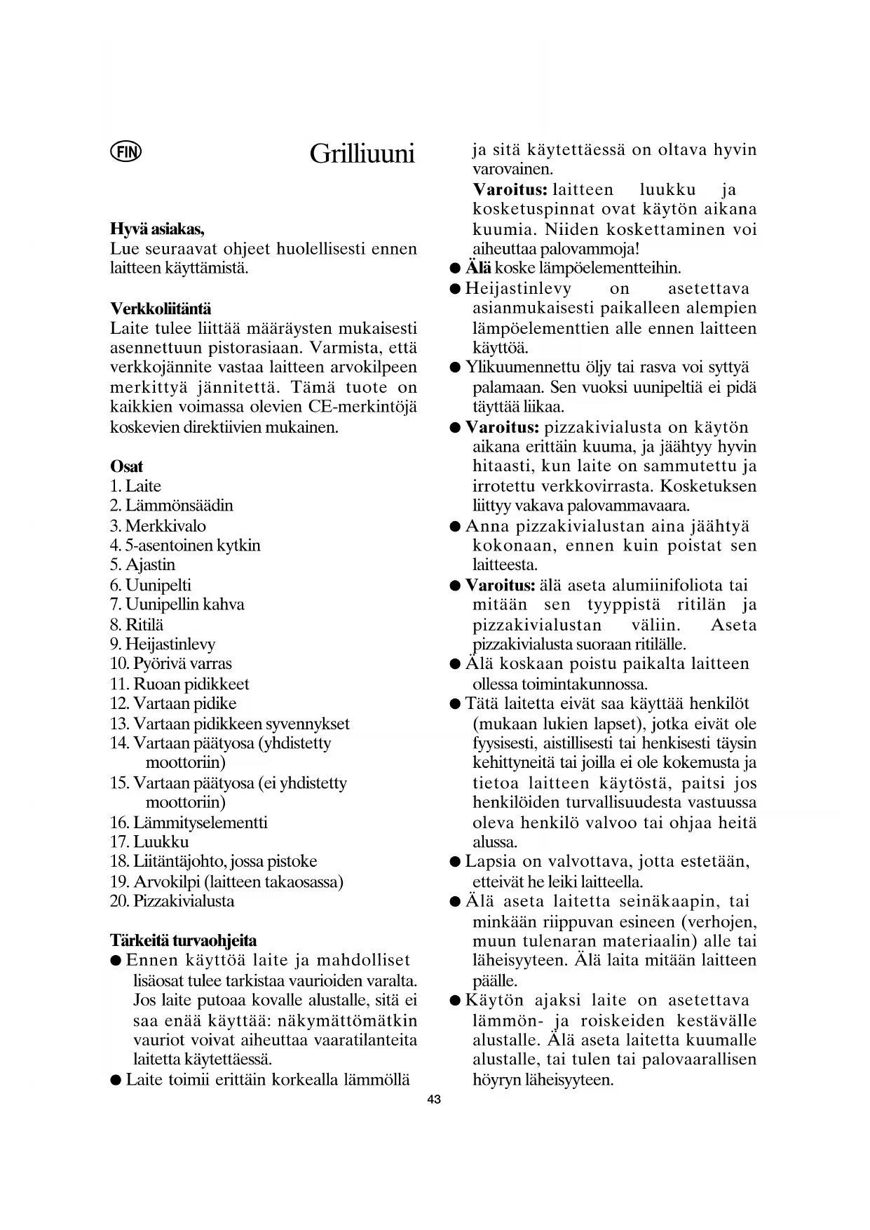 FIN● Älä anna liitäntäjohdon koskea laitteen kuumia osia. ● Älä anna liitäntäjohtimen roikkua laitteesta. ● Katkaise virta laitteesta aina käytön jälkeen ja irrota pistotulppa pistorasiasta. Tee samoin, - jos laitteessa on toimintahäiriö - ennen kuin puhdistat laitteen ● Kun irrotat pistotulpan pistorasiasta, älä vedä liitäntäjohdosta; tartu aina pistotulppaan. ● Tätä laitetta ei ole tarkoitettu käytettäväksi erillisen ajastimen tai kaukosäätimen kanssa. ● Valmistaja ei ole vastuussa mahdollisista vaurioista, jos ne johtuvat laitteen väärinkäytöstä tai käyttöohjeiden laiminlyömisestä. ● Laite on tarkoitettu ainoastaan kotitalouskäyttöön eikä sitä tule käyttää kaupallisiin tarkoituksiin. ● Turvallisuusmääräykset vaativat, että sähkölaitteen saa korjata ja liitäntäjohdon uusia ainoastaan sähköalan ammattilainen. Näin vältytään vaarallisilta tilanteilta. Jos laite vaatii huoltoa tai korjausta, ota yhteys asiakaspalveluumme. Lämpötilan säätö Lämpötila voidaan säätää halutuksi lämpötilan säätimellä. Merkkivalo syttyy, kun ajastin on aktivoitu. Merkkivalo sammuu, kun asetettu lämpötila saavutetaan. 5-asentoinen kytkin Molemmat lämpöelementit ja pyörivä varras ovat poissa päältä Ylälämpö Ylälämpö ja pyörivä varras Ala- ja ylälämpö Alalämpö Lämpöelementit kuumenevat vasta kun ajastin aktivoidaan. Ajastin Kypsennysajan voi säätää ajastimen avulla (enintään 60 min.). Merkkivalo palaa lämpöelementin toimiessa. Kun ohjelmoitu aika loppuu, äänimerkki ilmoittaa lämpöelementtien sammumisesta. Kun koko laite kytketään pois päältä, myös lämpöelementit on sammutettava. Kuumailmatoiminto Kuumailmapuhallin käynnistyy automaattisesti, kun lämpöelementit kytketään toimimaan. Pyörivä varras Pyörivän vartaan kanssa käytetään vain ylälämpötoimintoa.