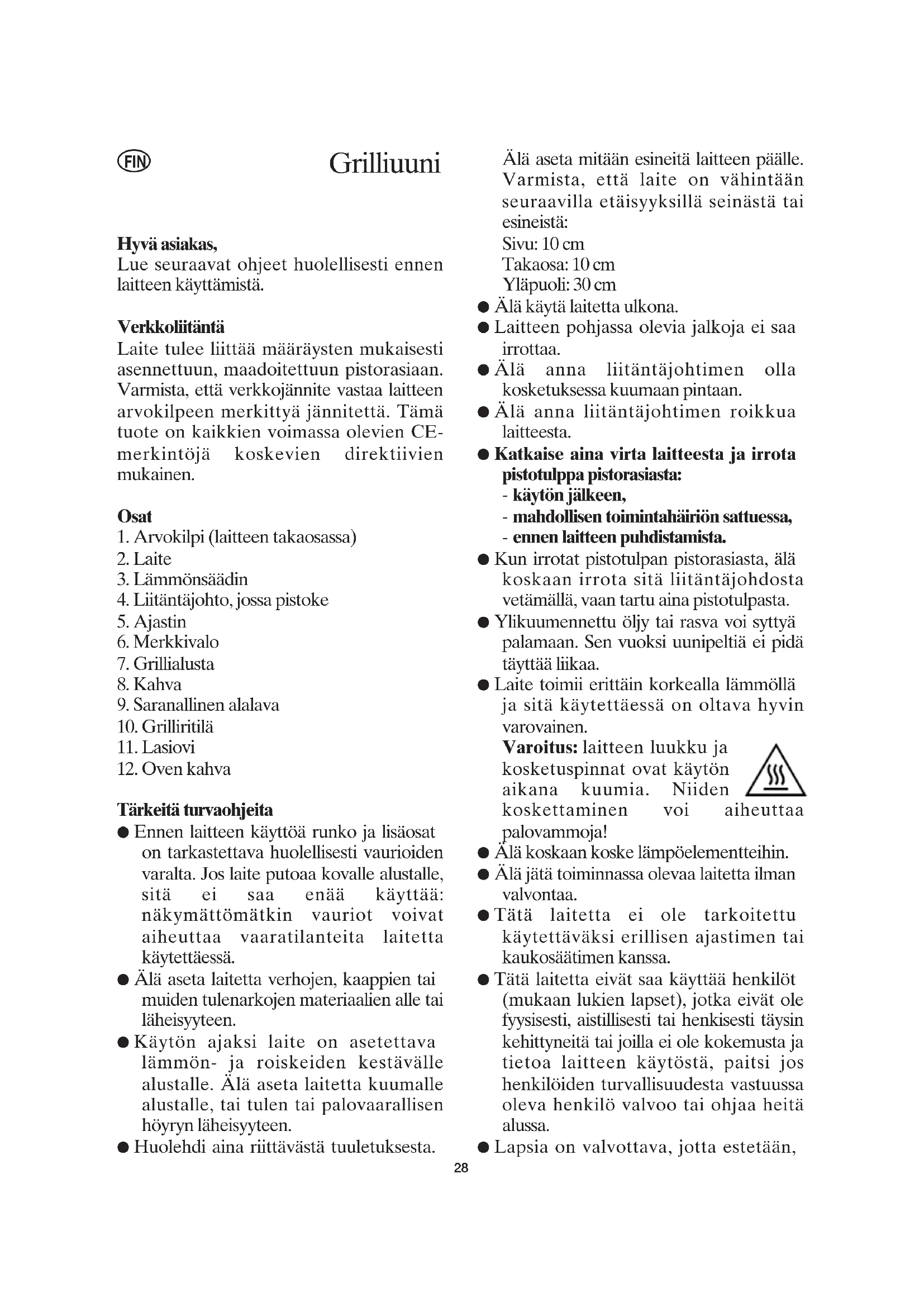Tärkeitä turvaohjeita ● Ennen laitteen käyttöä runko ja lisäosat on tarkastettava huolellisesti vaurioiden varalta. Jos laite putoaa kovalle alustalle, sitä ei saa enää käyttää: näkymättömätkin vauriot voivat aiheuttaa vaaratilanteita laitetta käytettäessä. ● Älä aseta laitetta verhojen, kaappien tai muiden tulenarkojen materiaalien alle tai läheisyyteen. ● Käytön ajaksi laite on asetettava lämmön- ja roiskeiden kestävälle alustalle. Älä aseta laitetta kuumalle alustalle, tai tulen tai palovaarallisen höyryn läheisyyteen. ● Huolehdi aina riittävästä tuuletuksesta. Älä aseta mitään esineitä laitteen päälle. Varmista, että laite on vähintään seuraavilla etäisyyksillä seinästä tai esineistä: Sivu: 10 cm Takaosa: 10 cm Yläpuoli: 30 cm ● Älä käytä laitetta ulkona. ● Laitteen pohjassa olevia jalkoja ei saa irrottaa. ● Älä anna liitäntäjohtimen olla kosketuksessa kuumaan pintaan. ● Älä anna liitäntäjohtimen roikkua laitteesta. ● Katkaise aina virta laitteesta ja irrota pistotulppa pistorasiasta: - käytön jälkeen, - mahdollisen toimintahäiriön sattuessa, - ennen laitteen puhdistamista. ● Kun irrotat pistotulpan pistorasiasta, älä koskaan irrota sitä liitäntäjohdosta vetämällä, vaan tartu aina pistotulpasta. ● Ylikuumennettu öljy tai rasva voi syttyä palamaan. Sen vuoksi uunipeltiä ei pidä täyttää liikaa. ● Laite toimii erittäin korkealla lämmöllä ja sitä käytettäessä on oltava hyvin varovainen. Varoitus: laitteen luukku ja kosketuspinnat ovat käytön aikana kuumia. Niiden koskettaminen voi aiheuttaa palovammoja! ● Älä koskaan koske lämpöelementteihin. ● Älä jätä toiminnassa olevaa laitetta ilman valvontaa. ● Tätä laitetta ei ole tarkoitettu käytettäväksi erillisen ajastimen tai kaukosäätimen kanssa. ● Tätä laitetta eivät saa käyttää henkilöt (mukaan lukien lapset), jotka eivät ole fyysisesti, aistillisesti tai henkisesti täysin kehittyneitä tai joilla ei ole kokemusta ja tietoa laitteen käytöstä, paitsi jos henkilöiden turvallisuudesta vastuussa oleva henkilö valvoo tai ohjaa heitä alussa. ● Lapsia on valvottava, jotta estetään,