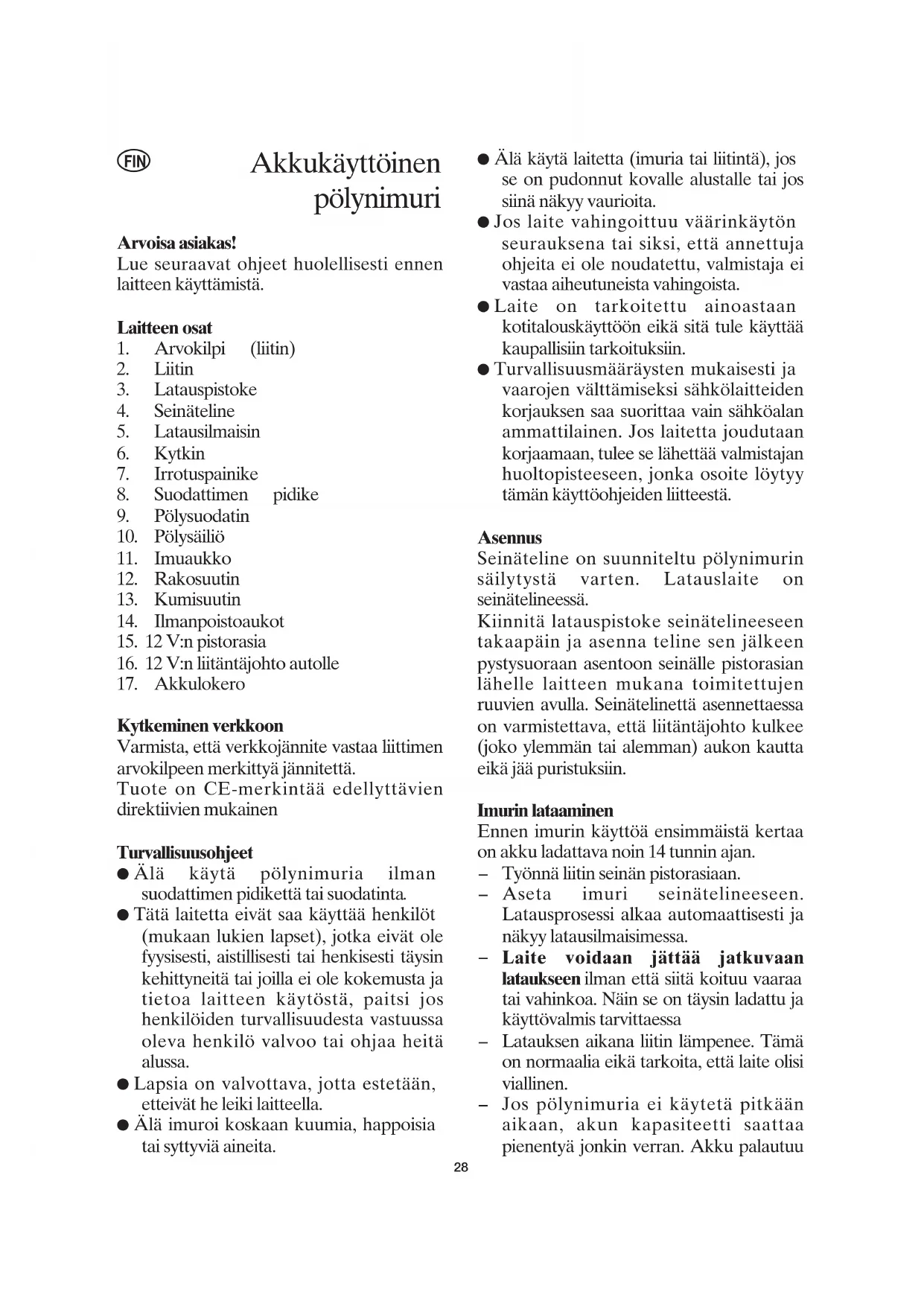 Kytkeminen verkkoon Varmista, että verkkojännite vastaa liittimen arvokilpeen merkittyä jännitettä. Tuote on CE-merkintää edellyttävien direktiivien mukainen Turvallisuusohjeet ● Älä käytä pölynimuria ilman suodattimen pidikettä tai suodatinta. ● Tätä laitetta eivät saa käyttää henkilöt (mukaan lukien lapset), jotka eivät ole fyysisesti, aistillisesti tai henkisesti täysin kehittyneitä tai joilla ei ole kokemusta ja tietoa laitteen käytöstä, paitsi jos henkilöiden turvallisuudesta vastuussa oleva henkilö valvoo tai ohjaa heitä alussa. ● Lapsia on valvottava, jotta estetään, etteivät he leiki laitteella. ● Älä imuroi koskaan kuumia, happoisia tai syttyviä aineita. ● Älä käytä laitetta (imuria tai liitintä), jos se on pudonnut kovalle alustalle tai jos siinä näkyy vaurioita. ● Jos laite vahingoittuu väärinkäytön seurauksena tai siksi, että annettuja ohjeita ei ole noudatettu, valmistaja ei vastaa aiheutuneista vahingoista. ● Laite on tarkoitettu ainoastaan kotitalouskäyttöön eikä sitä tule käyttää kaupallisiin tarkoituksiin. ● Turvallisuusmääräysten mukaisesti ja vaarojen välttämiseksi sähkölaitteiden korjauksen saa suorittaa vain sähköalan ammattilainen. Jos laitetta joudutaan korjaamaan, tulee se lähettää valmistajan huoltopisteeseen, jonka osoite löytyy tämän käyttöohjeiden liitteestä. Asennus Seinäteline on suunniteltu pölynimurin säilytystä varten. Latauslaite on seinätelineessä. Kiinnitä latauspistoke seinätelineeseen takaapäin ja asenna teline sen jälkeen pystysuoraan asentoon seinälle pistorasian lähelle laitteen mukana toimitettujen ruuvien avulla. Seinätelinettä asennettaessa on varmistettava, että liitäntäjohto kulkee (joko ylemmän tai alemman) aukon kautta eikä jää puristuksiin. Imurin lataaminen Ennen imurin käyttöä ensimmäistä kertaa on akku ladattava noin 14 tunnin ajan.