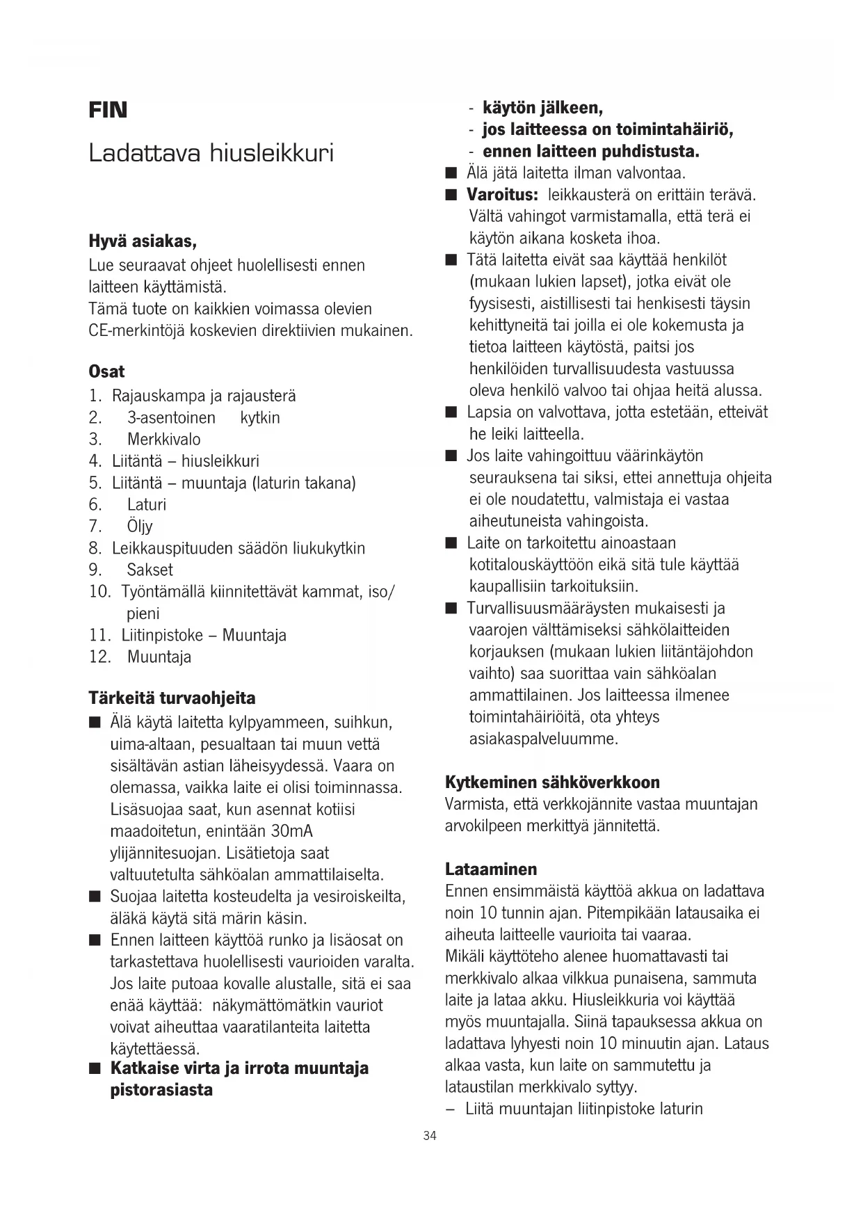 Tärkeitä turvaohjeita ■ Älä käytä laitetta kylpyammeen, suihkun, uima-altaan, pesualtaan tai muun vettä sisältävän astian läheisyydessä. Vaara on olemassa, vaikka laite ei olisi toiminnassa. Lisäsuojaa saat, kun asennat kotiisi maadoitetun, enintään 30mA ylijännitesuojan. Lisätietoja saat valtuutetulta sähköalan ammattilaiselta. ■ Suojaa laitetta kosteudelta ja vesiroiskeilta, äläkä käytä sitä märin käsin. ■ Ennen laitteen käyttöä runko ja lisäosat on tarkastettava huolellisesti vaurioiden varalta. Jos laite putoaa kovalle alustalle, sitä ei saa enää käyttää: näkymättömätkin vauriot voivat aiheuttaa vaaratilanteita laitetta käytettäessä. ■ Katkaise virta ja irrota muuntaja pistorasiasta - käytön jälkeen, - jos laitteessa on toimintahäiriö, - ennen laitteen puhdistusta. ■ Älä jätä laitetta ilman valvontaa. ■ Varoitus: leikkausterä on erittäin terävä. Vältä vahingot varmistamalla, että terä ei käytön aikana kosketa ihoa. ■ Tätä laitetta eivät saa käyttää henkilöt (mukaan lukien lapset), jotka eivät ole fyysisesti, aistillisesti tai henkisesti täysin kehittyneitä tai joilla ei ole kokemusta ja tietoa laitteen käytöstä, paitsi jos henkilöiden turvallisuudesta vastuussa oleva henkilö valvoo tai ohjaa heitä alussa. ■ Lapsia on valvottava, jotta estetään, etteivät he leiki laitteella. ■ Jos laite vahingoittuu väärinkäytön seurauksena tai siksi, ettei annettuja ohjeita ei ole noudatettu, valmistaja ei vastaa aiheutuneista vahingoista. ■ Laite on tarkoitettu ainoastaan kotitalouskäyttöön eikä sitä tule käyttää kaupallisiin tarkoituksiin. ■ Turvallisuusmääräysten mukaisesti ja vaarojen välttämiseksi sähkölaitteiden korjauksen (mukaan lukien liitäntäjohdon vaihto) saa suorittaa vain sähköalan ammattilainen. Jos laitteessa ilmenee toimintahäiriöitä, ota yhteys asiakaspalveluumme. Kytkeminen sähköverkkoon Varmista, että verkkojännite vastaa muuntajan arvokilpeen merkittyä jännitettä. Lataaminen Ennen ensimmäistä käyttöä akkua on ladattava noin 10 tunnin ajan. Pitempikään latausaika ei aiheuta laitteelle vaurioita tai vaaraa. Mikäli käyttöteho alenee huomattavasti tai merkkivalo alkaa vilkkua punaisena, sammuta laite ja lataa akku. Hiusleikkuria voi käyttää myös muuntajalla. Siinä tapauksessa akkua on ladattava lyhyesti noin 10 minuutin ajan. Lataus alkaa vasta, kun laite on sammutettu ja lataustilan merkkivalo syttyy.