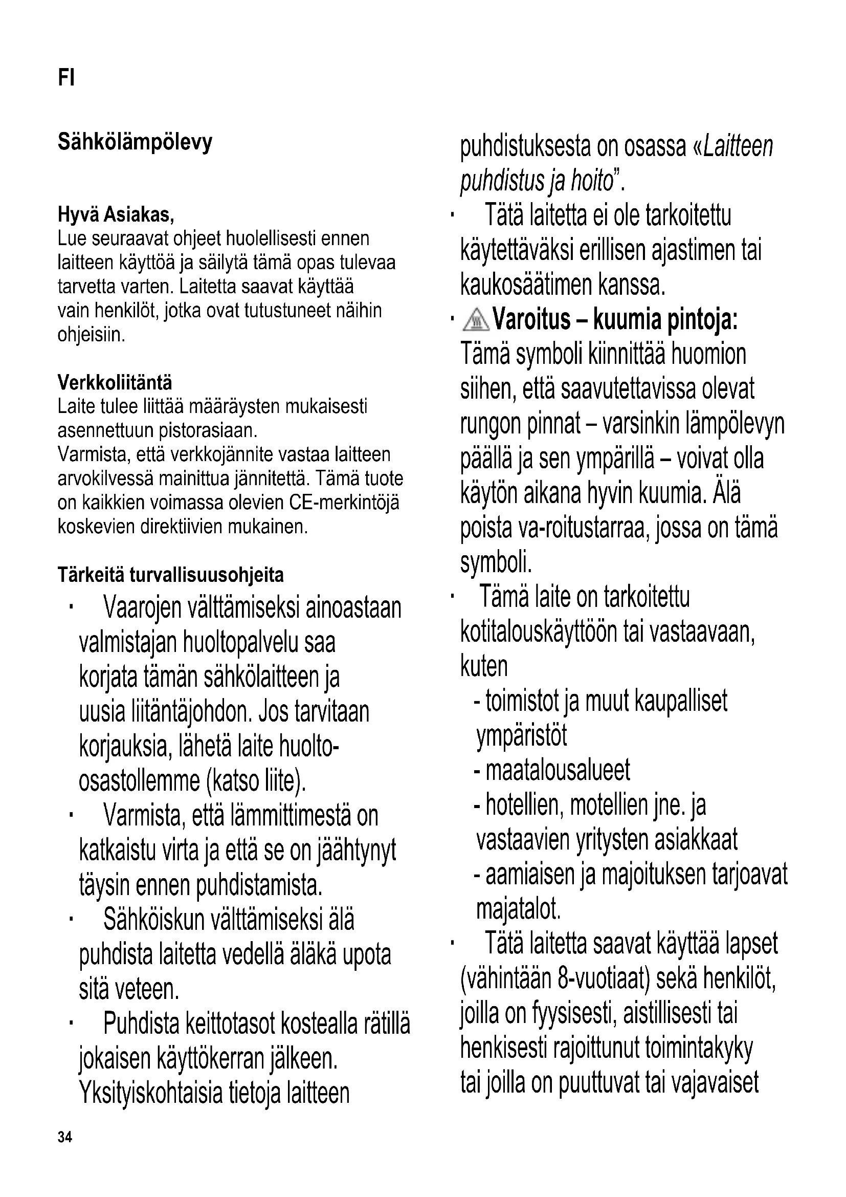 Varoitus – kuumia pintoja: Tämä symboli kiinnittää huomion siihen, että saavutettavissa olevat rungon pinnat – varsinkin lämpölevyn päällä ja sen ympärillä – voivat olla käytön aikana hyvin kuumia. Älä poista va-roitustarraa, jossa on tämä symboli. ∙ Tämä laite on tarkoitettu kotitalouskäyttöön tai vastaavaan, kuten - toimistot ja muut kaupalliset ympäristöt - maatalousalueet - hotellien, motellien jne. ja vastaavien yritysten asiakkaat - aamiaisen ja majoituksen tarjoavat majatalot. ∙ Tätä laitetta saavat käyttää lapset (vähintään 8-vuotiaat) sekä henkilöt, joilla on fyysisesti, aistillisesti tai henkisesti rajoittunut toimintakyky tai joilla on puuttuvat tai vajavaiset FI35 tiedot laitteen toiminnasta, mikäli heitä valvotaan tai ohjataan laitteen käytössä ja he ymmärtävät täysin kaikki käyttöön liittyvät vaarat ja turvatoimenpiteet. ∙ Lasten ei saa antaa leikkiä laitteella. ∙ Lasten ei saa antaa tehdä laitteen puhdistus- tai huoltotoimenpiteitä, elleivät he ole aikuisen valvonnassa sekä vähintään 8 vuotta vanhoja. ∙ Laite ja sen liitäntäjohto täytyy aina pitää alle 8-vuotiaiden ulottumattomissa. ∙ Varoitus: Pidä lapset poissa pakkausmateriaalien luota potentiaalisen vaaratilanteen esim. tukehtumisvaaran vuoksi. ∙ Tarkasta aina ennen laitteen käyttöä huolellisesti laitteen runko, liitäntäjohto ja mahdolliset asennetut lisäosat vaurioiden varalta. Jos laite on esimerkiksi pudonnut kovalle pinnalle tai liitäntäjohdon vetämiseen on käytetty liikaa voimaa, laitetta ei saa enää käyttää: näkymättömätkin vauriot voivat aiheuttaa laitetta käytettäessä vaaratilanteita. ∙ Älä koskaan poistu paikalta laitteen ollessa käytössä. ∙ Varoitus: Ylikuumennettu ruoka voi syttyä palamaan, varsinkin jos kyseessä on paljon rasvaa tai öljyä sisältävä ruoka. ∙ Älä aseta laitetta seinäkaapin tai minkään riippuvan esineen (verhojen, muun tulenaran materiaalin) alle tai läheisyyteen. ∙ Aseta laite käytön ajaksi kuumuutta, roiskeita, tahroja ja kuumaa höyryä kestävälle pinnalle. Varmista aina, että ilma pääsee kiertämään vapaasti laitteen alta. Laitteen on oltava vähintään 10 cm:n päässä seinistä. ∙ Laitteen alapuolella olevia tuuletusaukkoja ei saa peittää käytön aikana. ∙ Irrota pistotulppa pistorasiasta aina - jos laitteessa on käyttöhäiriö - käytön jälkeen - ennen laitteen puhdistamista. ∙ Kun irrotat pistotulpan pistorasiasta, älä vedä liitäntäjohdosta; tartu aina pistotulppaan. ∙ Älä anna liitäntäjohtimen roikkua laitteesta. ∙ Älä anna liitäntäjohdon koskea laitteen kuumia osia. ∙ Valmistaja ei ole vastuussa mahdollisista vaurioista, jos ne johtuvat laitteen väärinkäytöstä tai käyttöohjeiden laiminlyömisestä. Käyttöönotto Anna laitteen lämmetä maksimiteholla noin kolme minuuttia ennen ensikäyttöä (mutta ilman padan tai kattilan käyttöä) ja varmista samalla kunnollinen tuuletus. Kuumennuksen aikana voi esiintyä vähän hajua ja savua. Se on normaalia ja kestää vain hetken. Varmista riittävä tuuletus avaamalla ikkunat tai parvekkeen ovet. Puhdista laite toimenpiteen jälkeen Laitteen puhdistus ja hoito -osassa kuvatulla tavalla. Käyttö ∙ Aseta levylle aina pata/kattila ennen kuin kytket virran. ∙ Varmista, että kyseisen astian ulkopinta on puhdas ja kuiva. Älä käytä nokisia36 patoja/kattiloita. ∙ Jotta lämpölevy ei vahingoittuisi, käytä vain tasapohjaisia patoja/kattiloita. Parhaiten sopivat astiat, jotka on suunniteltu nimenomaan sähkölevyjä varten (katso kuva I). ∙ Varmista aina, että käyttämäsi padan/ kattilan pohja on vähintään yhtä suuri kuin levy. Näin minimoit lämmönhukan ja estät epätasaisen lämmönjakautumisen mahdollisesti levylle aiheuttamat vauriot. Termostaatin asetukset MAX : Esikypsennys ja nopea paistaminen 4-5 : Normaali kypsennys ja paistaminen 3-4 : Hauduttaminen 1-2 : Lämpimänä pitäminen Aseta termostaatin nuppi “MIN”-asentoon käytön jälkeen. Irrota aina pistotulppa seinäpistorasiasta käytön jälkeen varmistaaksesi, että laite on kytketty kokonaan irti verkkovirrasta. Merkkivalo Merkkivalo palaa, kun lämpölevyn lämpeneminen on käynnissä. Se sammuu, kun esiasetettu lämpötila on saavutettu. Laitteen puhdistus ja hoito ∙ Katkaise virta ja anna laitteen jäähtyä ennen puhdistamista. ∙ Sähköturvallisuussyistä laitetta ei saa puhdistaa vedellä eikä upottaa veteen. ∙ Älä käytä hankaavia tai karkeita puhdistusaineita. ∙ Käytön jälkeen voit poistaa tahrat levyistä märällä rievulla. ∙ Levyt tulee käsitellä silloin tällöin erikoispuhdistusaineella. Jätehuolto Tällä symbolilla merkityt laitteet täytyy hävittää kotitalousjätteestä erillään, sillä ne sisältävät arvokkaita kierrätyskelpoisia materiaaleja. Asianmukaisella hävittämisellä suojellaan ympäristöä ja ihmisterveyttä. Saat aiheesta lisätietoa paikallisilta viranomaisilta tai jälleenmyyjiltä. Takuu Laitteelle myönnetään 2 vuoden takuu, joka koskee valmistus- ja ainevikoja, ostopäivästä lukien yksilöityä ostokuittia vastaan yleisten Suomessa kulloinkin alalla voimassa olevien takuuehtojen mukaan. Mikäli laitetta käytetään väärin, käyttöohjeen vastaisesti tai huolimattomasti, vastuu syntyvistä esine- ja henkilövahingoista lankeaa laitteen käyttäjälle. Tämä takuu ei vaikuta lakimääräisiin oikeuksiin eikä mihinkään muihin kansallisen lainsäädännön säätämiin tuotteiden ostoa koskeviin laillisiin kuluttajaoikeuksiin, joita tuotteen hankkijalla on. Valmistuttaja: Severin Elektrogeräte GmbH, Saksa Maahantuoja: Oy Harry Marcell Ab PL 63, 01511 VANTAA Puh (09) 870 87860 Fax (09) 870 87801 www.harrymarcell.fi asiakaspalvelu@harrymarcell.fi37 Elektryczna płyta grzewcza do gotowania i smażenia Szanowni Klienci! Przed użyciem urządzenia proszę dokładnie zapoznać się z poniższą instrukcją, któr