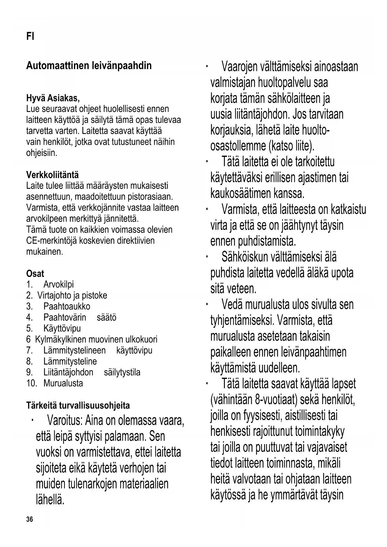 Tärkeitä turvallisuusohjeita ∙ Varoitus: Aina on olemassa vaara, että leipä syttyisi palamaan. Sen vuoksi on varmistettava, ettei laitetta sijoiteta eikä käytetä verhojen tai muiden tulenarkojen materiaalien lähellä. ∙ Vaarojen välttämiseksi ainoastaan valmistajan huoltopalvelu saa korjata tämän sähkölaitteen ja uusia liitäntäjohdon. Jos tarvitaan korjauksia, lähetä laite huolto- osastollemme (katso liite). ∙ Tätä laitetta ei ole tarkoitettu käytettäväksi erillisen ajastimen tai kaukosäätimen kanssa. ∙ Varmista, että laitteesta on katkaistu virta ja että se on jäähtynyt täysin ennen puhdistamista. ∙ Sähköiskun välttämiseksi älä puhdista laitetta vedellä äläkä upota sitä veteen. ∙ Vedä murualusta ulos sivulta sen tyhjentämiseksi. Varmista, että murualusta asetetaan takaisin paikalleen ennen leivänpaahtimen käyttämistä uudelleen. ∙ Tätä laitetta saavat käyttää lapset (vähintään 8-vuotiaat) sekä henkilöt, joilla on fyysisesti, aistillisesti tai henkisesti rajoittunut toimintakyky tai joilla on puuttuvat tai vajavaiset tiedot laitteen toiminnasta, mikäli heitä valvotaan tai ohjataan laitteen käytössä ja he ymmärtävät täysin FI37 kaikki käyttöön liittyvät vaarat ja turvatoimenpiteet. ∙ Lasten ei saa antaa leikkiä laitteella. ∙ Lasten ei saa antaa tehdä laitteen puhdistus- tai huoltotoimenpiteitä, elleivät he ole aikuisen valvonnassa sekä vähintään 8 vuotta vanhoja. ∙ Laite ja sen liitäntäjohto täytyy aina pitää alle 8-vuotiaiden ulottumattomissa. ∙ Varoitus: Pidä lapset poissa pakkausmateriaalien luota potentiaalisen vaaratilanteen esim. tukehtumisvaaran vuoksi. ∙ Aseta laite aina tasaiselle ja kuumuutta kestävälle pinnalle. ∙ Jotta laitteen ulkopinta ei vahingoittuisi, älä aseta laitetta kuumille pinnoille tai niiden lähelle äläkä avotuleen, kuten lämpölevylle tai kaasuliekille. ∙ Varoitus: Laitteen ulkokuori on käytön aikana kuuma. Ole erittäin varovainen, sillä kuumien osien koskettaminen voi aiheutta palovamman. ∙ Tarkasta aina ennen laitteen käyttöä huolellisesti laitteen runko, liitäntäjohto ja mahdolliset asennetut lisäosat vaurioiden varalta. Jos laite on esimerkiksi pudonnut kovalle pinnalle tai liitäntäjohdon vetämiseen on käytetty liikaa voimaa, laitetta ei saa enää käyttää: näkymättömätkin vauriot voivat aiheuttaa laitetta käytettäessä vaaratilanteita. ∙ Älä anna liitäntäjohdon koskea kuumia pintoja. ∙ Älä jätä liitäntäjohtoa riippumaan vapaana. ∙ Älä koskaan poistu paikalta laitteen ollessa toimintakunnossa. ∙ Älä peitä paahtoaukkoa käytön aikana. ∙ Älä ota leipää pois paahtimesta sormillasi äläkä laita paahtoaukkoon esineitä (esim. veistä tai haarukkaa). Lämpöelementeissä on sähkövirta. ∙ Irrota pistotulppa pistorasiasta aina - käytön jälkeen - jos laitteessa on käyttöhäiriö - ennen laitteen puhdistamista. ∙ Kun irrotat pistotulpan pistorasiasta, älä vedä liitäntäjohdosta vaan tartu aina pistotulppaan. ∙ Jos laite vahingoittuu väärinkäytön seurauksena tai siksi, että annettuja ohjeita ei ole noudatettu, valmistaja ei vastaa aiheutuneista vahingoista. ∙ Tämä laite on tarkoitettu kotitalouskäyttöön tai vastaavaan, kuten - toimistot ja muut kaupalliset ympäristöt - maatalousyritykset - hotellien, motellien jne. ja vastaavien yritysten asiakkaat - aamiaisen ja majoituksen tarjoavat majatalot. Käyttö Yleistä ∙ Huom.: Käyttövipu lukkiutuu vain silloin, kun pistotulppa on pistorasiassa. ∙ Älä paahda liian paksuja tai suuria viipaleita, koska ne voivat juuttua paahtimeen. Paahdettavien viipaleiden paksuus ei saa ylittää 14 mm. ∙ Jos paahtimen käytössä ilmenee ongelmia tai toimintahäiriöitä, irrota aina pistotulppa pistorasiasta. Irrota pistotulppa myös puhdistamisen38 yhteydessä. ∙ Käytä tylsää puutikkua kiinni juuttuneen viipaleen poistamiseksi paahtoaukosta. Älä koske koskaan metallisiin lämpöelementteihin. Ennen ensimmäistä käyttökertaa ∙ Puhdista paahdin perusteellisesti (ks. Laitteen puhdistus ja huolto). ∙ Kytke virta paahtimeen laittamatta siihen leipää ja käytä paahdinta ainakin viiden paahtokerran läpi maksimilämpötila- asetuksilla. ∙ Anna paahtimen jäähtyä paahtokertojen välillä. ∙ Kun kytket laitteeseen virran ensimmäisen kerran, paahtimesta saattaa tulla jonkin verran hajua ja savua. Sen takia täytyy varmistaa riittävä tuuletus avaamalla ikkuna tai parvekkeen ovi. Paahtovärin säätö: Paahtoväri voidaan säätää halutunlaiseksi paahtovärin säätimellä. Vaalea: käännä säädintä vastapäivään. Tumma: käännä säädintä myötäpäivään. Jos käytät valmiiksi paloiteltua paahtoleipää, on suositeltavaa käyttää asetusta 3 tai 4. Käyttö ∙ Säädä paahtoväri, laita leipäviipale paahtoaukkoon ja paina käyttövipua. ∙ Kun paahtoväri on sopiva, virta katkeaa paahtimesta automaattisesti. Viipaleet tulevat ulos ja ne voidaan ottaa pois paahtimesta. ∙ Jotta paahtoväri pysyy tasaisena paahdettaessa useampia viipaleita peräkkäin, anna paahtimen jäähtyä 60-90 sekuntia kunkin paahtokerran välillä. ∙ Älä peitä paahtoaukkoa käytön aikana. Paahtojakson keskeyttäminen Jos haluat keskeyttää paahtamisen, työnnä säätövipua ylöspäin. Pullien, sämpylöiden ym. leivonnaisten lämmittäminen ∙ Kun haluat lämmittää pullia, sämpylöitä tai muita leivonnaisia, työnnä liukusäädintä paahtoaukkoa kohti sämpylätelineen nostamiseksi. ∙ Aseta lämmitettävät leivonnaiset telineen päälle, säädä paahtovärin säädin keskiasentoon ja paina käyttövipu alas virran kytkemiseksi paahtimeen. ∙ Kun paahtojakso on päättynyt ja virta on katkennut laitteesta automaattisesti, käännä sämpylä ja toista toimenpide. ∙ Palauta sämpyläteline käytön jälkeen lepoasentoon työntämällä liukusäädin takaisin. ∙ Älä aseta leivonnaisia paahtoauk