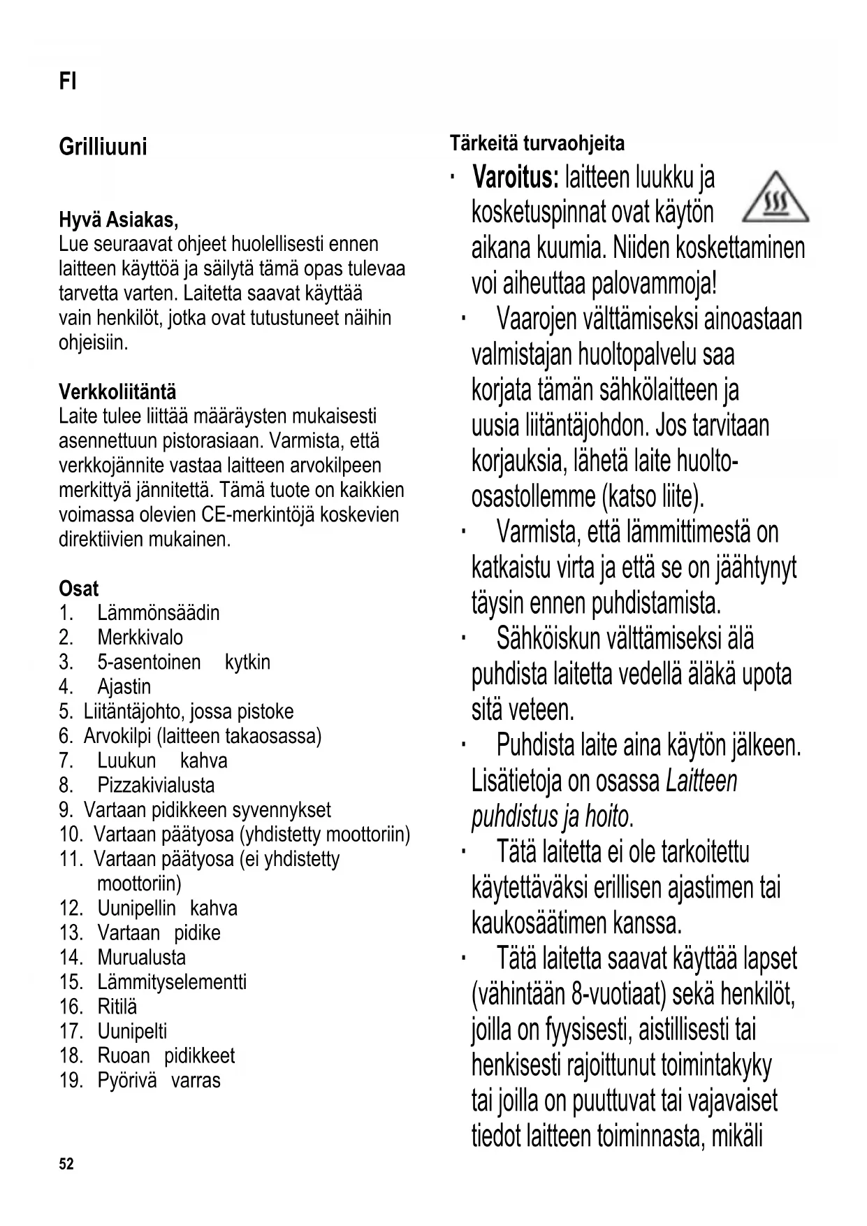 Tärkeitä turvaohjeita ∙ Varoitus: laitteen luukku ja kosketuspinnat ovat käytön aikana kuumia. Niiden koskettaminen voi aiheuttaa palovammoja! ∙ Vaarojen välttämiseksi ainoastaan valmistajan huoltopalvelu saa korjata tämän sähkölaitteen ja uusia liitäntäjohdon. Jos tarvitaan korjauksia, lähetä laite huolto- osastollemme (katso liite). ∙ Varmista, että lämmittimestä on katkaistu virta ja että se on jäähtynyt täysin ennen puhdistamista. ∙ Sähköiskun välttämiseksi älä puhdista laitetta vedellä äläkä upota sitä veteen. ∙ Puhdista laite aina käytön jälkeen. Lisätietoja on osassa Laitteen puhdistus ja hoito. ∙ Tätä laitetta ei ole tarkoitettu käytettäväksi erillisen ajastimen tai kaukosäätimen kanssa. ∙ Tätä laitetta saavat käyttää lapset (vähintään 8-vuotiaat) sekä henkilöt, joilla on fyysisesti, aistillisesti tai henkisesti rajoittunut toimintakyky tai joilla on puuttuvat tai vajavaiset tiedot laitteen toiminnasta, mikäli FI53 heitä valvotaan tai ohjataan laitteen käytössä ja he ymmärtävät täysin kaikki käyttöön liittyvät vaarat ja turvatoimenpiteet. ∙ Lasten ei saa antaa leikkiä laitteella. ∙ Lasten ei saa antaa tehdä laitteen puhdistus- tai huoltotoimenpiteitä, elleivät he ole aikuisen valvonnassa sekä vähintään 8 vuotta vanhoja. ∙ Laite ja sen liitäntäjohto täytyy aina pitää alle 8-vuotiaiden ulottumattomissa. ∙ Varoitus: Pidä lapset poissa pakkausmateriaalien luota potentiaalisen vaaratilanteen esim. tukehtumisvaaran vuoksi. ∙ Tarkasta aina ennen laitteen käyttöä huolellisesti laitteen runko, liitäntäjohto ja mahdolliset asennetut lisäosat vaurioiden varalta. Jos laite on esimerkiksi pudonnut kovalle pinnalle tai liitäntäjohdon vetämiseen on käytetty liikaa voimaa, laitetta ei saa enää käyttää: näkymättömätkin vauriot voivat aiheuttaa laitetta käytettäessä vaaratilanteita. ∙ Älä koske lämpöelementteihin. ∙ Ennen laitteen käyttöä murualusta on asetettava paikalleen alempien lämpöelementtien alle. ∙ Ylikuumennettu öljy tai rasva voi syttyä palamaan. Sen vuoksi uunipeltiä ei pidä täyttää liikaa. Näin vältät rasvan tippumisen alla oleville lämpöelementeille. ∙ Älä koskaan poistu paikalta laitteen ollessa toimintakunnossa. ∙ Älä käytä laitetta ulkona. ∙ Huolehdi aina riittävästä tuuletuksesta. Älä aseta mitään esineitä laitteen päälle. Varmista, että laite on vähintään seuraavilla etäisyyksillä seinästä tai esineistä: Sivu: 12 cm Takaosa: 12 cm Yläpuoli: 30 cm ∙ Laitetta ei saa sijoittaa kaappiin. Laitetta paikoilleen sijoitettaessa on myös varmistettava, että sitä ei aseteta kaapin tms. alapuolelle. ∙ Laitteen pohjassa olevia jalkoja ei saa irrottaa. ∙ Älä aseta laitetta seinäkaapin, tai minkään riippuvan esineen (verhojen, muun tulenaran materiaalin) alle tai läheisyyteen. ∙ Käytön ajaksi laite on asetettava lämmön- ja roiskeiden kestävälle alustalle. Älä aseta laitetta kuumalle alustalle, tai tulen tai palovaarallisen höyryn läheisyyteen. ∙ Varoitus: pizzakivialusta on käytön aikana erittäin kuuma, ja jäähtyy hyvin hitaasti, kun laite on sammutettu ja irrotettu verkkovirrasta. Kosketuksen liittyy vakava palovammavaara. ∙ Anna pizzakivialustan aina jäähtyä kokonaan, ennen kuin poistat sen laitteesta. ∙ Varoitus: älä aseta alumiinifoliota tai mitään sen tyyppistä ritilän ja pizzakivialustan väliin. Aseta pizzakivialusta suoraan ritilälle. ∙ Älä anna liitäntäjohdon koskea laitteen kuumia osia. ∙ Älä anna liitäntäjohtimen roikkua laitteesta. ∙ Irrota pistotulppa pistorasiasta aina - käytön jälkeen, - jos laitteessa on käyttöhäiriö, - ennen laitteen puhdistamista.54 ∙ Kun irrotat pistotulpan pistorasiasta, älä vedä liitäntäjohdosta; tartu aina pistotulppaan. ∙ Valmistaja ei ole vastuussa mahdollisista vaurioista, jos ne johtuvat laitteen väärinkäytöstä tai käyttöohjeiden laiminlyömisestä. ∙ Tämä laite on tarkoitettu kotitalouskäyttöön tai vastaavaan, kuten - toimistot ja muut kaupalliset ympäristöt - maatalousyritykset - hotellien, motellien jne. ja vastaavien yritysten asiakkaat - aamiaisen ja majoituksen tarjoavat majatalot. Lämpötilan säätö Lämpötila voidaan säätää halutuksi lämpötilan säätimellä. Merkkivalo syttyy, kun ajastin on aktivoitu. Merkkivalo sammuu, kun asetettu lämpötila saavutetaan. 5-asentoinen kytkin Molemmat lämpöelementit ja pyörivä varras ovat poissa päältä Ylälämpö Ylälämpö ja pyörivä varras Ala- ja ylälämpö Alalämpö Lämpöelementit kuumenevat vasta kun ajastin aktivoidaan. Ajastin Kypsennysajan voi säätää ajastimen avulla (enintään 60 min.). Merkkivalo palaa lämpöelementin toimiessa. Kun ohjelmoitu aika loppuu, äänimerkki ilmoittaa lämpöelementtien sammumisesta. Kun koko laite kytketään pois päältä, myös lämpöelementit on sammutettava. Kuuman ilman konvektio Kuuman ilman konvektiopuhallin aktivoituu automaattisesti, kun lämpöelementit kytketään päälle. Pyörivä varras Pyörivän vartaan kanssa käytetään vain ylälämpötoimintoa. ∙ Varmista ennen vartaan käyttöä, että uuniritilä ja uunipelti ovat kunnolla ohjauskiskoillaan. ∙ Kun asetat ruoan vartaaseen varmista, että se kosketa ylälämpöelementtiä tai uunipeltiä – varaa riittävä etäisyys. ∙ Keihästä kypsennettävä ruoka vartaaseen keskikohdastaan. Siten varmistat, että ruoka on riittävän etäällä uunipellistä, uunin sisäosista ja lämpöelementeistä. Kiinnitä ruoka pidikkeillä vartaan keskelle. ∙ Ulkonevat osat (esim. kananpojan siivet) on syytä kiinnittää hammastikulla, narulla tai muulla sopivalla tavalla. Näin mikään osa ruoasta ei irtoa kypsentämisen aikana. Pyörivän vartaan kiinnittäminen ja irrottaminen: ∙ Kun ruoka on kunnolla paikoillaan, aseta varras pidikkeeseensä. Varmista, että pidikkeen pykälät sopivat vartaan va