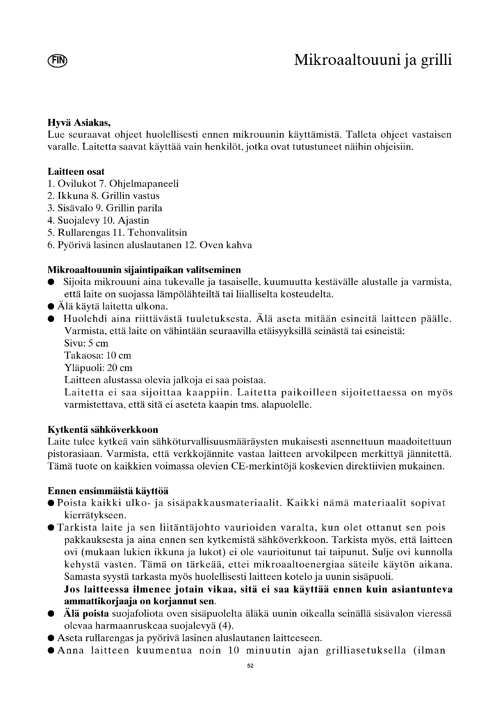FIN 52mikroaaltotoimintoa) ennen ensimmäistä käyttökertaa. Tämä toimenpide poistaa hajun, jota ilmenee tavallisesti, kun grilli kytketään päälle ensimmäistä kertaa. Laitteesta voi tulla jonkin verran savua; tämä on normaalia, mutta huolehdi kuitenkin riittävästä tuuletuksesta. Huom: Älä kytke mikrouuniin virtaa, jollei lämmitettävää tai kypsennettävää ruokaa ole laitettu uuniin. Laitteen käyttäminen tyhjänä voi aiheuttaa vaurioita. Tärkeää ● Kun lämmität nesteitä mikrossa, neste voi kuumentua kiehumapisteen yli ilman että kuplia näkyy. Siksi on astioita käsiteltäessä oltava erittäin varovainen (esim. niitä otettaessa mikrosta). Ylikiehumisen vaaraa voidaan vähentää asettamalla astiaan lämpöä kestävä lasisauva kuumennuksen ajaksi. ● Kananmunia kuorineen tai kovaksikeitettyinä ei saa kuumentaa mikrouunissa, koska ne saattavat räjähtää mikroaaltoprosessin päätyttyäkin. ● Varoitus: On myös erittäin vaarallista kuumentaa nesteitä tai mitään kiinteitä ruoka- aineita suljetuissa astioissa, koska tämä aiheuttaa erittäin vakavan räjähdysvaaran. ● Vauvojen ruokintapulloja tai vauvanruokaa sisältäviä lasiastioita on sekoitettava tai ravistettava kunnolla, jotta lämpö jakautuu tasaisesti. Kivuliaitten ja vaarallisten palovammojen välttämiseksi tarkista aina ruoka-aineen lämpötila ennen lapselle antamista. ● Kun lämmität tai kypsennät syttyvään aineeseen (kuten muoviin tai paperiin) pakattua ruokaa, voi tällainen materiaali syttyä palamaan. On myös mahdollista, että ruoka kuivuu tai jopa syttyy, jos on valittu liian pitkä kypsentämisaika. Rasva ja öljy ovat myös syttyviä aineita. Siksi on tärkeää valvoa laitteen toimintaa käytön aikana. Herkästi syttyvät nesteet kuten väkevät alkoholit eivät luonnollisesti sovellu kuumennettaviksi. ● Jos käytön aikana huomataan savua, pidä laitteen ovi kiinni tai estä tai tukahduta liekit. Kytke laitteesta virta pois välittömästi ja irrota pistotulppa pistorasiasta. ● Palovammojen estämiseksi on aina käytettävä asianmukaista patalappua ruoka-aineita otettaessa uunista, koska valmistusvälineet ja -astiat kuumenevat sekä grillin käytön että mikrouunin käytön aikana. ● Erityisiä ruokalämpömittareita (joita käytetään tavallisissa uuneissa) ei voi käyttää mikroaaltouunien yhteydessä. Tärkeitä turvallisuusohjeita ● Varoitus: jotkut ruoat syttyvät helposti palamaan. Älä jätä laitetta toimintaan ilman valvontaa. ● Tämä mikroaaltouuni on tarkoitettu vain ruuan sulattamiseen, kuumentamiseen ja kypsentämiseen. Valmistaja ei vastaa mahdollisista laitteen väärinkäytöstä tai käyttöohjeiden laiminlyömisestä johtuvista vaurioista. ● Varoitus: lapset eivät saa käyttää mikrouunia ilman valvontaa, jollei heille ole annettu yksityiskohtaisia ja selkeitä ohjeita ennen laitteen käyttämistä. Lapsille tulee selittää, että he saavat käyttää mikrouunia vain turvaohjeiden mukaisesti ja että on vaarallista, jos laitetta käytetään väärin tai ohjeita ei seurata. ● Katkaise aina virta laitteesta ja irrota pistotulppa pistorasiasta - ennen laitteen puhdistamista ja - mahdollisen toimintahäiriön sattuessa. ● Varoitus: Laitteen ulkopinnat saattavat kuumentua käytön aikana. Kuumaa höyryä voi 53myös tulla tuuletusaukoista: palovammavaara. ● Älä anna laitteen tai liitäntäjohdon koskettaa kuumia pintoja tai joutua kosketuksiin lämmönlähteiden kanssa. Älä myöskään jätä liitäntäjohtoa roikkumaan äläkä anna sen koskettaa kuumia osia. ● Tämä mikroaaltouuni on tarkoitettu vain kotitalouskäyttöön eikä sitä pidä käyttää kaupallisiin tarkoituksiin. (Luokka B EN 55011:1998+A1+A2 vaatimusten mukaisesti) ● Varoitus: huolto- ja korjaustyöt, jotka vaativat mikroaaltosäteilysuojuksen poistamista, ovat erittäin vaarallisia henkilöille, joilla ei ole alan koulutusta. Näihin töihin luetaan myös erikoisliitäntäjohdon ja sisävalon lampun vaihtaminen. Laitteen saa avata vain alan koulutuksen saanut, pätevä henkilö. Jos laitteessa ilmenee toimintahäiriöitä, ota yhteys asiakaspalveluumme. Miten mikroaallot toimivat (Ryhmä II EN 55011:1998+A1+A2 vaatimusten mukaisesti) Laitteen sisällä syntyy sähkömagneettista energiaa, joka saa ruuan molekyylit (enimmältään vesimolekyyleja) kieppumaan ja saa aikaan ruuan kuumenemisen. Siksi paljon vettä sisältävät ruoka-aineet kuumenevat nopeammin kuin suhteellisen kuivat ruoka-aineet. Lämpöä syntyy vähitellen ruoka-aineessa. Ruuan valmistamisessa käytetyt välineet ja astiat kuumenevat vain epäsuorasti ruuan lämpötilan nousun seurauksena. Käytä aina mikrouuniin sopivia astioita ● Älä laita ruokaa suoraan lasiselle aluslautaselle vaan käytä aina tarkoitukseen sopivaa lautasta tai astiaa. Tarkista, että astia ei työnny lasisen aluslautasen reunan yli. ● Metalliesineitä tulee välttää, koska mikroaallot heijastuvat metallista eivätkä ehkä saavutakaan kypsennettävää ruoka-ainetta. Uunin sisällä metalli voi myös aiheuttaa kipinöintiä, mikä saattaa vaurioittaa laitetta. ● Yleisesti ottaen ei aterimia tai metalliastioita saa käyttää mikrouunissa. Jotkut ruokien pakkausaineet sisältävät alumiinifoliota tai metallilankaa paperikerroksen alla, ja niitä ei saa käyttää mikroaaltolaitteiden kanssa. Jos ruokaohjeessa suositellaan alumiinifolion käyttöä, on ruoka-aine käärittävä tiiviisti folioon (välttäen ilmakuplien syntymistä). On myös varmistettava, että alumiinifolion ja uunin sisäseinien väliin jää vähintään 2,5 cm:n tila. ● Tarkista aina, että ruuan valmistukseen käytettävässä astiassa tai lautasessa ei ole metallikoristeita kuten kullattua reunusta tai metallihiukkasia sisältävää väriä. Lyijykristallista valmistetut esineet eivät myöskään sovi mikroaaltolaitteisiin. Varmista myös, että käyttämissäsi astioissa ei ole onttoja osia (esim. varressa tai k