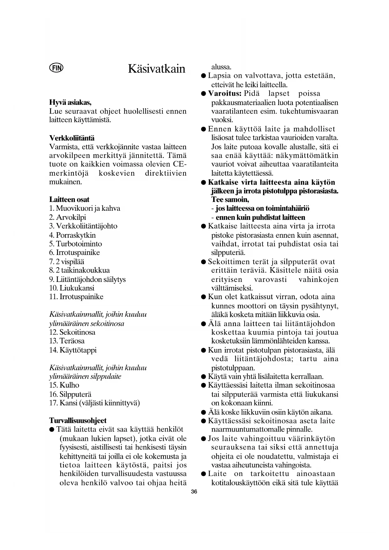 Kun olet katkaissut virran, odota aina kunnes moottori on täysin pysahtynyt, alakä kosketa mitään likkuvia osia. - Alä anna laitteen tai liitäntäjohdon koskettaa kuumia pintoja tai joutua kosketuksiin lammonlahteiden kanssa.