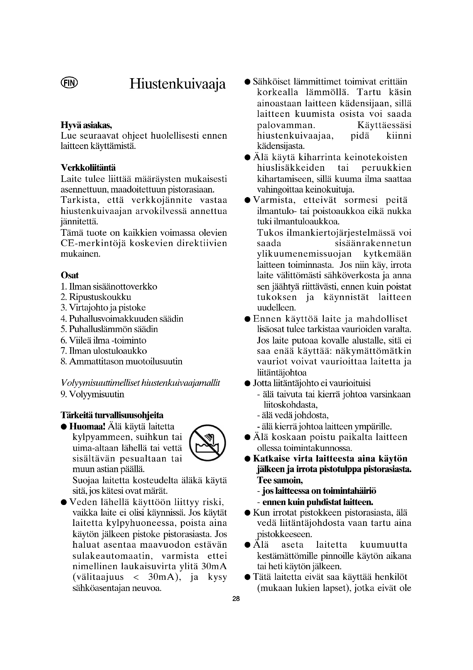 FINfyysisesti, aistillisesti tai henkisesti täysin kehittyneitä tai joilla ei ole kokemusta ja tietoa laitteen käytöstä, paitsi jos henkilöiden turvallisuudesta vastuussa oleva henkilö valvoo tai ohjaa heitä alussa. ● Lapsia on valvottava, jotta estetään, etteivät he leiki laitteella. ● Jos laite vahingoittuu väärinkäytön seurauksena tai siksi, että annettuja ohjeita ei ole noudatettu, valmistaja ei vastaa aiheutuneista vahingoista. ● Laite on tarkoitettu ainoastaan kotitalouskäyttöön eikä sitä tule käyttää kaupallisiin tarkoituksiin. ● Turvallisuusmääräykset vaativat, että sähkölaitteen saa korjata ja liitäntäjohdon uusia ainoastaan sähköalan ammattilainen. Näin vältytään vaarallisilta tilanteilta. Jos laite vaatii huoltoa tai korjausta, lähetä se huoltoliikkeeseemme. Osoitteen löydät tämän käyttöohjeen liitteestä. Hiustenkuivaajamallit, joissa IONIC- toiminto IONIC-toiminnon avulla hiukset voidaan muotoilla helposti ja hellävaraisesti, sillä se estää hiuksien sähköistymistä. Toiminto perustuu negatiiviseen “ionipilveä”, joka estää hiuksia latautumasta positiivisesti ja “lentämästä”. IONIC-toiminto aktivoituu automaattisesti käytön aikana riippumatta laitteen säädinten asetuksista. Muotoilusuutin Puhallusaukkoon voidaan kiinnittää muotoilusuutin, jonka avulla voidaan hiuksia muotoilla kuivauksen aikana. Volyymisuutin Myös volyymisuutin kiinnitetään puhallusaukkoon. Volyymisuuttimen avulla ylläpidetään hiusten volyymia. Liikuta tätä suutinta pään yläpuolella hieman pyörivällä liikkeellä. Puhallusvoimakkuuden ja -lämpötilan säätimet Eri puhallusvoimakkuuksia ja -lämpötiloja yhdistelemällä voidaan hiustenkuivaukseen valita useita erilaisia asetuksia. Puhallusvoimakkuudella säädellään ilmavirran voimakkuutta ja puhalluslämpötilalla ilman kuumuutta. Kun puhallusvoimakkuuden säädin on asennossa ‘0’, hiustenkuivaaja on pois päältä. Viileä ilma -toiminto Viileä ilma -toimintoa voidaan käyttää kaikissa kuivauksen vaiheessa. Tällöin hiustenkuivaajan puhallus on viileämpi ja kampauksen muotoilu ja kiinnittäminen on helpompaa. Käyttö Liitä hiustenkuivaaja sopivaan pistorasiaan ja valitse oikea virta-asetus kahvan kytkimillä. Puhdistus ja huolto ● Poista ennen laitteen puhdistusta pistoke pistorasiasta ja anna laitteen jäähtyä perusteellisesti. ● Älä pese hiustenkuivaajaa vedellä äläkä upota sitä veteen. Näin vältyt sähköiskuilta.