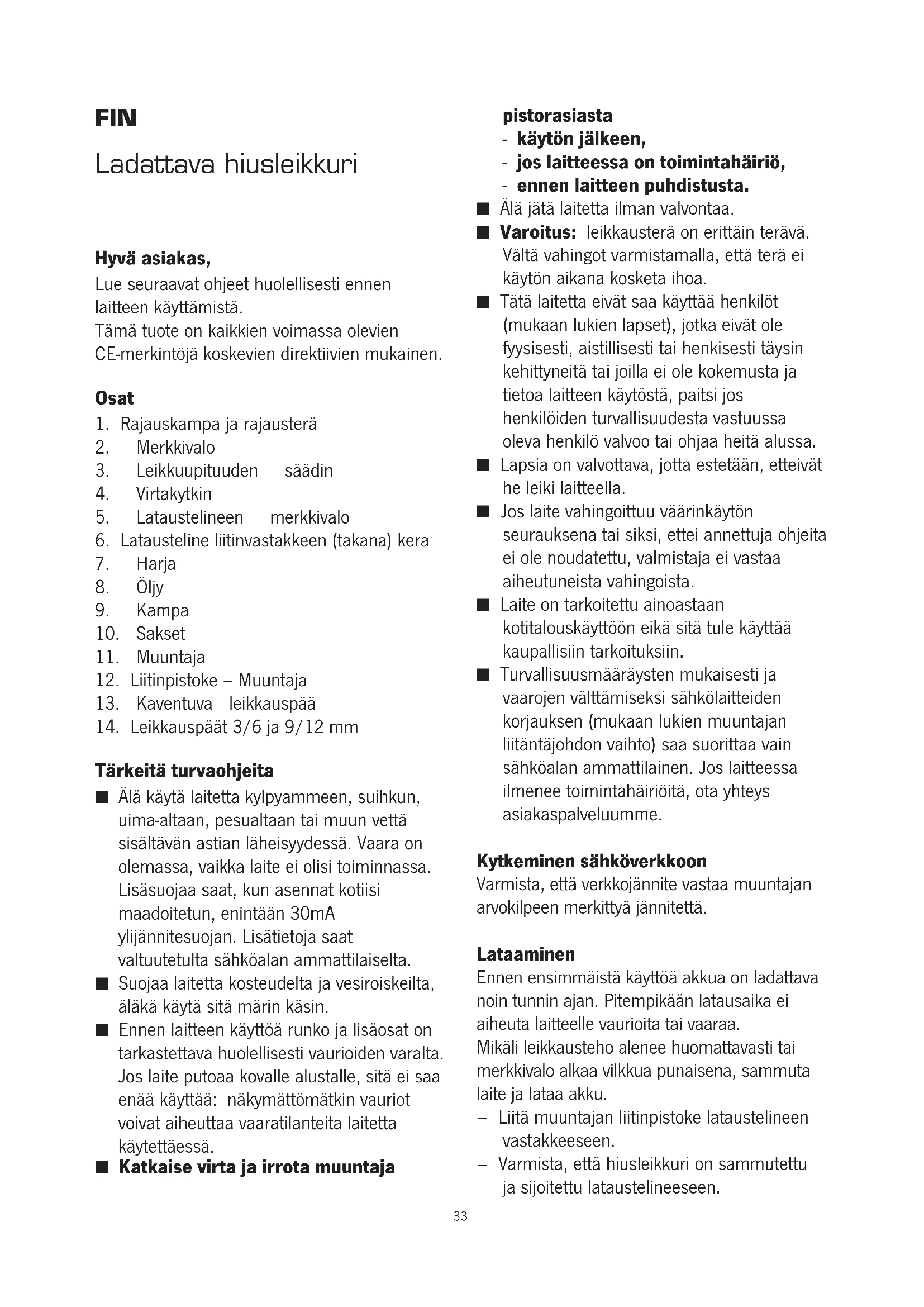 Tärkeitä turvaohjeita ■ Älä käytä laitetta kylpyammeen, suihkun, uima-altaan, pesualtaan tai muun vettä sisältävän astian läheisyydessä. Vaara on olemassa, vaikka laite ei olisi toiminnassa. Lisäsuojaa saat, kun asennat kotiisi maadoitetun, enintään 30mA ylijännitesuojan. Lisätietoja saat valtuutetulta sähköalan ammattilaiselta. ■ Suojaa laitetta kosteudelta ja vesiroiskeilta, äläkä käytä sitä märin käsin. ■ Ennen laitteen käyttöä runko ja lisäosat on tarkastettava huolellisesti vaurioiden varalta. Jos laite putoaa kovalle alustalle, sitä ei saa enää käyttää: näkymättömätkin vauriot voivat aiheuttaa vaaratilanteita laitetta käytettäessä. ■ Katkaise virta ja irrota muuntaja pistorasiasta - käytön jälkeen, - jos laitteessa on toimintahäiriö, - ennen laitteen puhdistusta. ■ Älä jätä laitetta ilman valvontaa. ■ Varoitus: leikkausterä on erittäin terävä. Vältä vahingot varmistamalla, että terä ei käytön aikana kosketa ihoa. ■ Tätä laitetta eivät saa käyttää henkilöt (mukaan lukien lapset), jotka eivät ole fyysisesti, aistillisesti tai henkisesti täysin kehittyneitä tai joilla ei ole kokemusta ja tietoa laitteen käytöstä, paitsi jos henkilöiden turvallisuudesta vastuussa oleva henkilö valvoo tai ohjaa heitä alussa. ■ Lapsia on valvottava, jotta estetään, etteivät he leiki laitteella. ■ Jos laite vahingoittuu väärinkäytön seurauksena tai siksi, ettei annettuja ohjeita ei ole noudatettu, valmistaja ei vastaa aiheutuneista vahingoista. ■ Laite on tarkoitettu ainoastaan kotitalouskäyttöön eikä sitä tule käyttää kaupallisiin tarkoituksiin. ■ Turvallisuusmääräysten mukaisesti ja vaarojen välttämiseksi sähkölaitteiden korjauksen (mukaan lukien muuntajan liitäntäjohdon vaihto) saa suorittaa vain sähköalan ammattilainen. Jos laitteessa ilmenee toimintahäiriöitä, ota yhteys asiakaspalveluumme. Kytkeminen sähköverkkoon Varmista, että verkkojännite vastaa muuntajan arvokilpeen merkittyä jännitettä. Lataaminen Ennen ensimmäistä käyttöä akkua on ladattava noin tunnin ajan. Pitempikään latausaika ei aiheuta laitteelle vaurioita tai vaaraa. Mikäli leikkausteho alenee huomattavasti tai merkkivalo alkaa vilkkua punaisena, sammuta laite ja lataa akku.