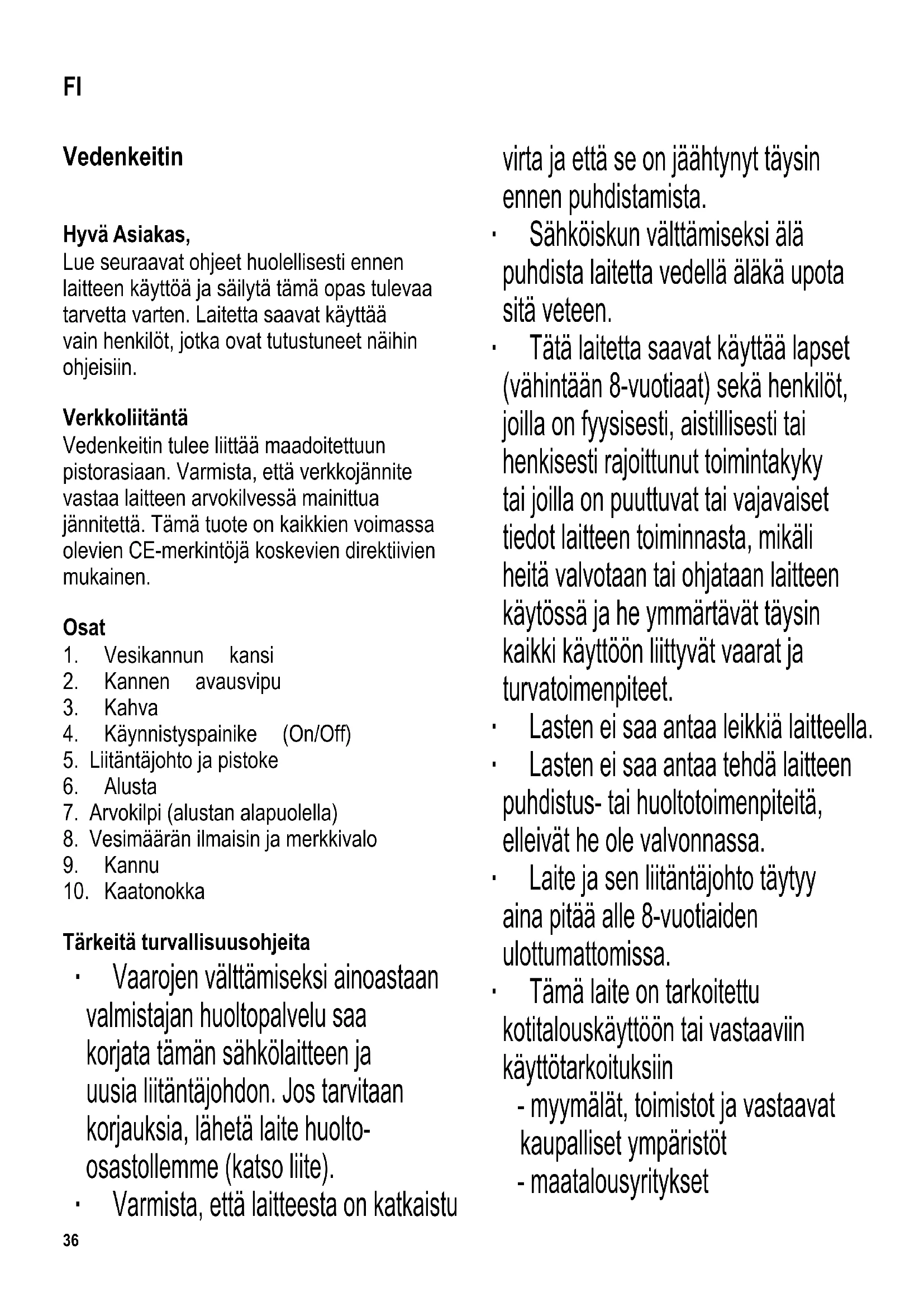 Tärkeitä turvallisuusohjeita ∙ Vaarojen välttämiseksi ainoastaan valmistajan huoltopalvelu saa korjata tämän sähkölaitteen ja uusia liitäntäjohdon. Jos tarvitaan korjauksia, lähetä laite huolto- osastollemme (katso liite). ∙ Varmista, että laitteesta on katkaistu virta ja että se on jäähtynyt täysin ennen puhdistamista. ∙ Sähköiskun välttämiseksi älä puhdista laitetta vedellä äläkä upota sitä veteen. ∙ Tätä laitetta saavat käyttää lapset (vähintään 8-vuotiaat) sekä henkilöt, joilla on fyysisesti, aistillisesti tai henkisesti rajoittunut toimintakyky tai joilla on puuttuvat tai vajavaiset tiedot laitteen toiminnasta, mikäli heitä valvotaan tai ohjataan laitteen käytössä ja he ymmärtävät täysin kaikki käyttöön liittyvät vaarat ja turvatoimenpiteet. ∙ Lasten ei saa antaa leikkiä laitteella. ∙ Lasten ei saa antaa tehdä laitteen puhdistus- tai huoltotoimenpiteitä, elleivät he ole valvonnassa. ∙ Laite ja sen liitäntäjohto täytyy aina pitää alle 8-vuotiaiden ulottumattomissa. ∙ Tämä laite on tarkoitettu kotitalouskäyttöön tai vastaaviin käyttötarkoituksiin - myymälät, toimistot ja vastaavat kaupalliset ympäristöt - maatalousyritykset FI37 - hotellien, motellien jne. ja vastaavien yritysten asiakkaat - aamiaisen ja majoituksen tarjoavat majatalot ∙ Älä jätä vedenkeitintä ilman valvontaa sen ollessa toiminnassa. Käytä vain puhdasta vettä ja huomioi aina minimi- ja maksimitäytön merkit kannua täyttäessäsi. Kannun täyttämimen liialla vedellä saattaa aiheuttaa kiehuvan veden valumisen ulos. ∙ Varo myös laitteesta tulevaa kuumaa höyryä. Älä kosketa laitetta käytön aikana kahvaa lukuunottamatta. ∙ Huomaa! Keittämisen aikana ja kuumaa vettä kaadettaessa kansi on aina pidettävä suljettuna. ∙ Keitintä saa käyttää ainoastaan mukana toimitetun alustan kanssa. ∙ Älä ota vesikannua koskaan pois alustalta (tai laita sitä takaisin alustalle) virran ollessa kytkettynä laitteeseen. ∙ Varoitus: Pidä lapset poissa pakkausmateriaalien luota potentiaalisen vaaratilanteen esim. tukehtumisvaaran vuoksi. ∙ Tarkasta aina ennen laitteen käyttöä huolellisesti laitteen runko, liitäntäjohto ja mahdolliset asennetut lisäosat vaurioiden varalta. Jos laite on esimerkiksi pudonnut kovalle pinnalle tai liitäntäjohdon vetämiseen on käytetty liikaa voimaa, laitetta ei saa enää käyttää: näkymättömätkin vauriot voivat aiheuttaa laitetta käytettäessä vaaratilanteita. ∙ Laitetta saa käyttää vain tasaisella, kuumuutta kestävällä pinnalla. ∙ Älä käytä laitetta seinään kiinnitetyn kaapin tai vastaavan esineen alla: on olemassa vaara, että poistuva höyry jämähtää sen alapuolelle. ∙ Ulkopinnat kuumenevat käytön aikana ja pysyvät kuumina jonkin aikaa käytön jälkeen. ∙ Varo, ettei liitäntäjohto tai kannu kosketa avoliekkiä tai kuumia pintoja (esim. lieden keittolevyjä). ∙ Älä jätä liitäntäjohtoa roikkumaan äläkä anna sen koskettaa kannun kuumia osia. ∙ Irrota pistotulppa pistorasiasta aina - käytön jälkeen - jos laitteessa on käyttöhäiriö - ennen laitteen puhdistamista ∙ Jos laite vahingoittuu väärinkäytön seurauksena tai siksi, että annettuja ohjeita ei ole noudatettu, valmistaja ei vastaa aiheutuneista vahingoista. Automaattinen virrankatkaisu Esiasetettu automaattinen turvakytkin suojaa vastusta ylikuumenemiselta, jos keittimeen kytketään virta vahingossa sen ollessa tyhjänä tai jos vastukseen on kerääntynyt kalkkia. Kun turvakytkin on katkaissut keittimestä virran, laitteen on annettava jäähtyä riittävästi tai siitä on poistettava kalkkisaostuma ennen verkkoon kytkemistä.38 Ennen käyttöä ∙ Täydellisen puhtauden varmistamiseksi kaada pois ensimmäinen kannullinen keitettyä vettä. Veden keittäminen ∙ Ota kannu pois alustalta. ∙ Avaa kansi ja laita kannuun tarvitsemasi määrä vettä. Huomoi minimi- ja maksimitäytön merkit. ∙ Sulje kansi ja laita vesikannu takaisin jalustalle. Kytke pistotulppa sopivaan seinäpistorasiaan ja paina käynnistyspainiketta (On/Off). Vesimäärän ilmaisimen merkkivalo syttyy. ∙ Vedenkeitto alkaa. Kun vesi saavuttaa kiehumispisteen, sisäänrakennettu kytkin katkaisee keittimestä virran automaattisesti. Kuuluu äänimerkki ja merkkivalo sammuu. ∙ Voit keskeyttää vedenkeiton asettamalla käynnistyspainikkeen (On/Off) Off- asentoon. ∙ Kun haluat kaataa kuumaa vettä, ota kannu pois alustalta. ∙ Kuuman höyryn ulostulon estämiseksi varmista, että kansi pysyy kiinni vettä kaadettaessa. ∙ Irrota pistotulppa pistorasiasta käytön jälkeen. ∙ Älä jätä yhtään vettä kannuun. Kelattavan liitäntäjohdon säilytystila Alustan pohjassa oleva kelattavan liitäntäjohdon säilytystila helpottaa laitteen varastoimista sekä johdon pituuden säätelyä käytön aikana. Kalkinpoisto Paikallisen veden laadusta riippuen vesikannun sisään saattaa kertyä kalkkia. Kalkkikertymien säännöllistä poistamista suositellaan. Kaikki takuuvaateet mitätöityvät, jos keittimen vika johtuu riittämättömästä kalkinpoistosta. Tarkoitukseen sopii seos, jossa on 0,5 litraa vettä ja 40 ml väkevää etikkaa. ∙ Kaada kannuun seos kalkin poistamiseksi. ∙ Kytke laitteeseen virta ja keitä kiehumispisteeseen. ∙ Anna seoksen vaikuttaa lyhyen aikaa. ∙ Puhdista kannu kalkin poiston jälkeen huuhtelemalla se perusteellisesti puhtaalla vedellä. ∙ Älä hengitä kalkinpoiston aikana syntyviä etikkahöyryjä ja varmista riittävä tuuletus. ∙ Älä kaada kalkinpoistoainetta emaloituihin astianpesualtaisiin. Siivilä Nokassa olevan siivilän voi poistaa puhdistusta varten. Muista asentaa se takaisin paikoilleen. Laitteen puhdistus ja huolto ∙ Varmista, että laite on kytketty irti verkkovirrasta ja että se on jäähtynyt täysin ennen puhdistamista. ∙ Mahdollisen sähköiskun välttämiseksi älä puhdista keitintä tai alustaa vedellä äläkä upota nii