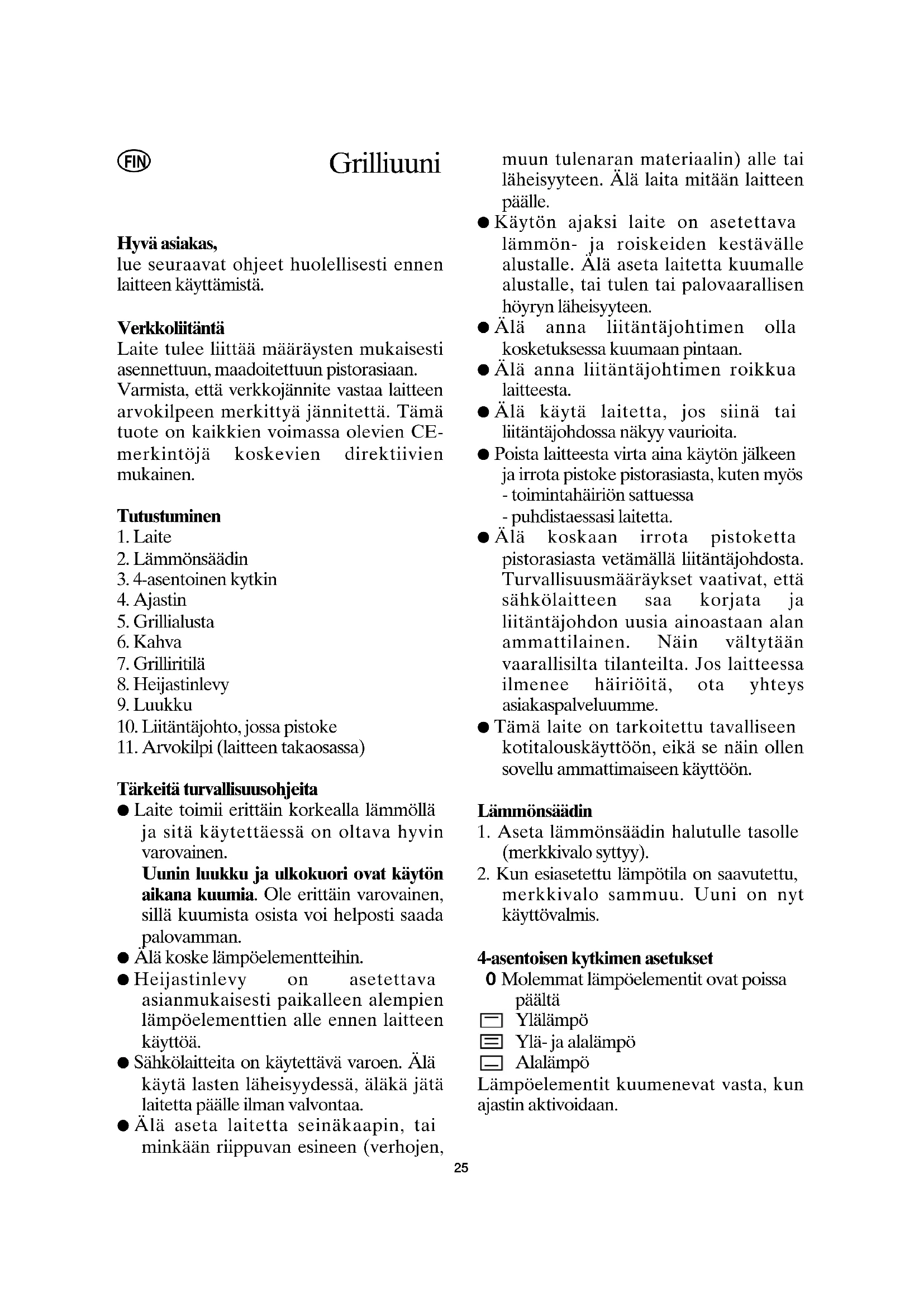 Tärkeitä turvallisuusohjeita ● Laite toimii erittäin korkealla lämmöllä ja sitä käytettäessä on oltava hyvin varovainen. Uunin luukku ja ulkokuori ovat käytön aikana kuumia. Ole erittäin varovainen, sillä kuumista osista voi helposti saada palovamman. ● Älä koske lämpöelementteihin. ● Heijastinlevy on asetettava asianmukaisesti paikalleen alempien lämpöelementtien alle ennen laitteen käyttöä. ● Sähkölaitteita on käytettävä varoen. Älä käytä lasten läheisyydessä, äläkä jätä laitetta päälle ilman valvontaa. ● Älä aseta laitetta seinäkaapin, tai minkään riippuvan esineen (verhojen, muun tulenaran materiaalin) alle tai läheisyyteen. Älä laita mitään laitteen päälle. ● Käytön ajaksi laite on asetettava lämmön- ja roiskeiden kestävälle alustalle. Älä aseta laitetta kuumalle alustalle, tai tulen tai palovaarallisen höyryn läheisyyteen. ● Älä anna liitäntäjohtimen olla kosketuksessa kuumaan pintaan. ● Älä anna liitäntäjohtimen roikkua laitteesta. ● Älä käytä laitetta, jos siinä tai liitäntäjohdossa näkyy vaurioita. ● Poista laitteesta virta aina käytön jälkeen ja irrota pistoke pistorasiasta, kuten myös - toimintahäiriön sattuessa - puhdistaessasi laitetta. ● Älä koskaan irrota pistoketta pistorasiasta vetämällä liitäntäjohdosta. Turvallisuusmääräykset vaativat, että sähkölaitteen saa korjata ja liitäntäjohdon uusia ainoastaan alan ammattilainen. Näin vältytään vaarallisilta tilanteilta. Jos laitteessa ilmenee häiriöitä, ota yhteys asiakaspalveluumme. ● Tämä laite on tarkoitettu tavalliseen kotitalouskäyttöön, eikä se näin ollen sovellu ammattimaiseen käyttöön. Lämmönsäädin