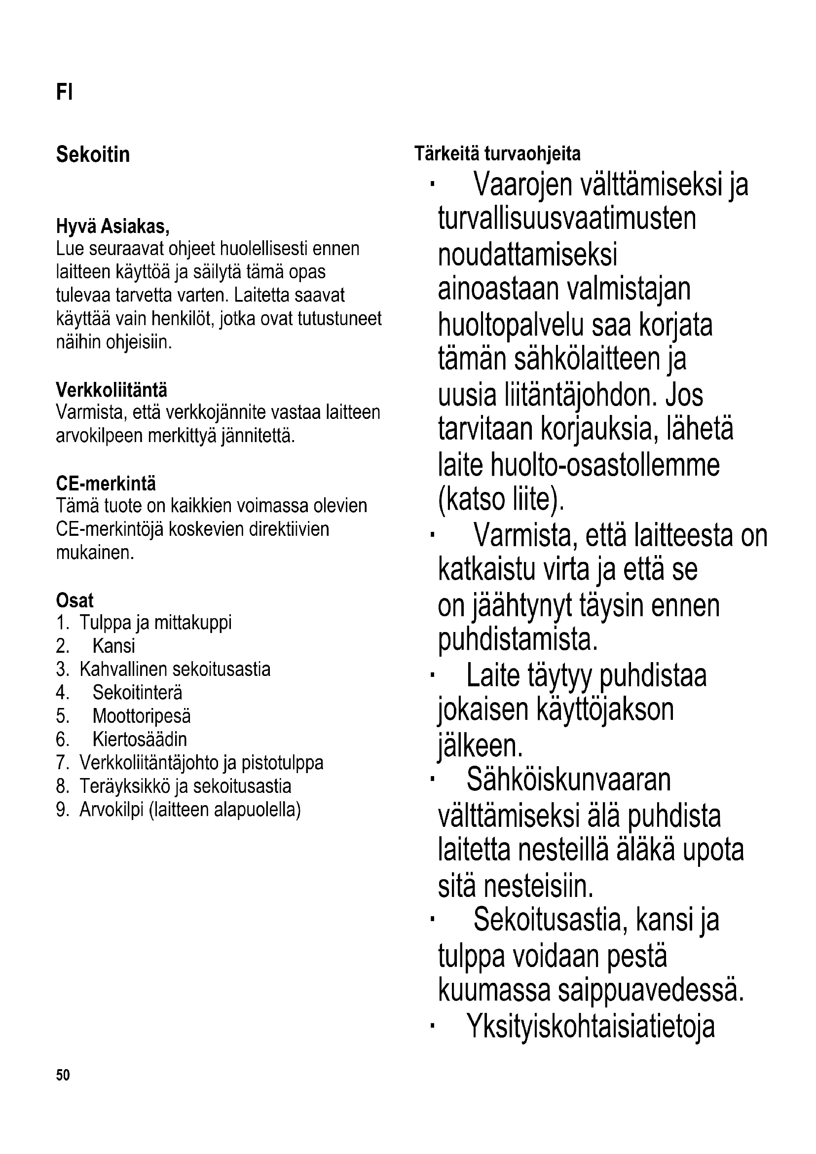 Tärkeitä turvaohjeita ∙ Vaarojen välttämiseksi ja turvallisuusvaatimusten noudattamiseksi ainoastaan valmistajan huoltopalvelu saa korjata tämän sähkölaitteen ja uusia liitäntäjohdon. Jos tarvitaan korjauksia, lähetä laite huolto-osastollemme (katso liite). ∙ Varmista, että laitteesta on katkaistu virta ja että se on jäähtynyt täysin ennen puhdistamista. ∙ Laite täytyy puhdistaa jokaisen käyttöjakson jälkeen. ∙ Sähköiskun vaaran välttämiseksi älä puhdista laitetta nesteillä äläkä upota sitä nesteisiin. ∙ Sekoitusastia, kansi ja tulppa voidaan pestä kuumassa saippuavedessä. ∙ Yksityiskohtaisia tietoja FI104 x 142 mm