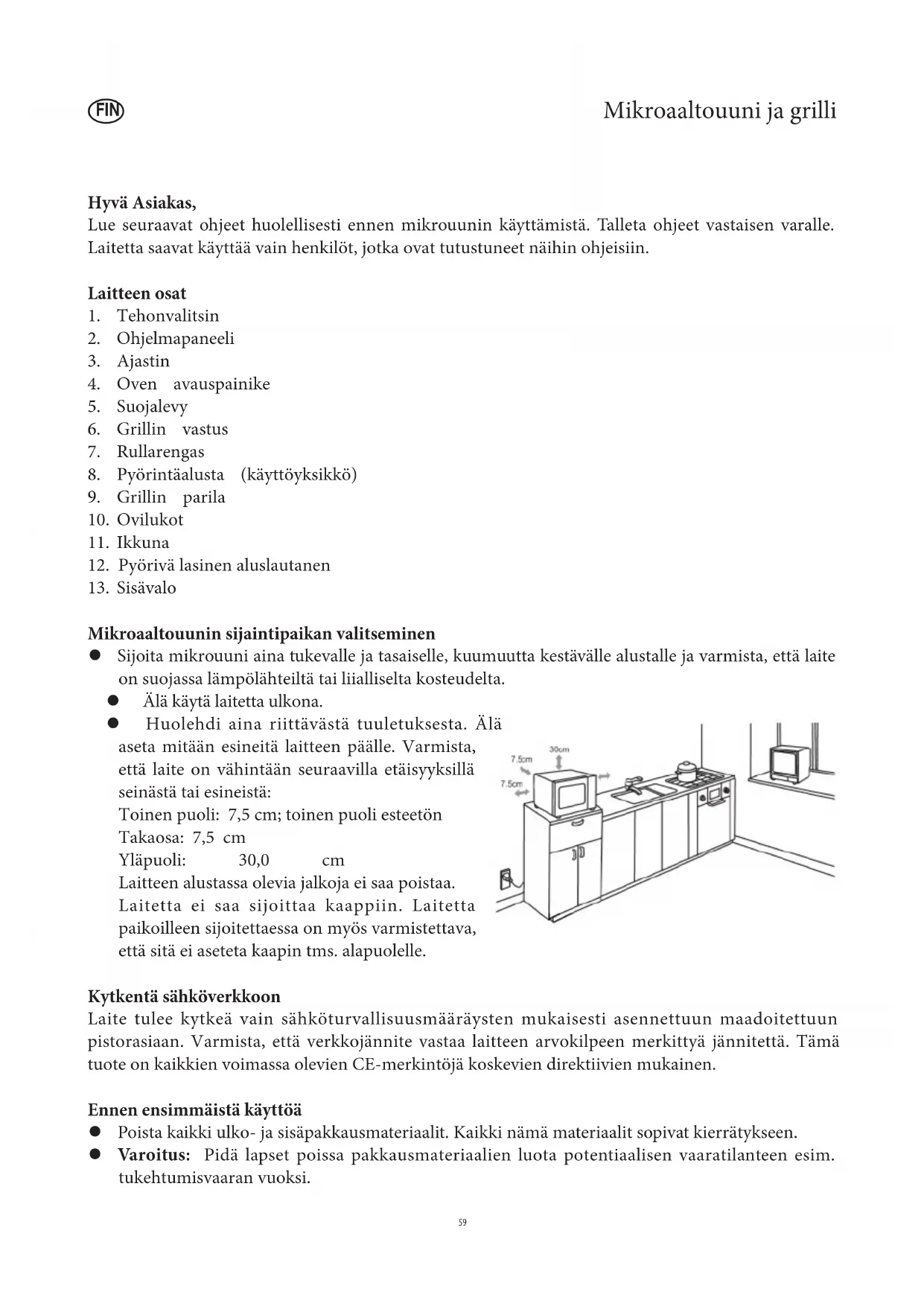 Mikroaaltouunin sijaintipaikan valitseminen Sijoita mikrouuni aina tukevalle ja tasaiselle, kuumuutta kestävälle alustalle ja varmista, että laite on suojassa lämpölähteiltä tai liialliselta kosteudelta. Älä käytä laitetta ulkona. Huolehdi aina riittävästä tuuletuksesta. Älä aseta mitään esineitä laitteen päälle. Varmista, että laite on vähintään seuraavilla etäisyyksillä seinästä tai esineistä: Toinen puoli: 7,5 cm; toinen puoli esteetön Takaosa: 7,5 cm Yläpuoli: 30,0 cm Laitteen alustassa olevia jalkoja ei saa poistaa. Laitetta ei saa sijoittaa kaappiin. Laitetta paikoilleen sijoitettaessa on myös varmistettava, että sitä ei aseteta kaapin tms. alapuolelle. Kytkentä sähköverkkoon Laite tulee kytkeä vain sähköturvallisuusmääräysten mukaisesti asennettuun maadoitettuun pistorasiaan. Varmista, että verkkojännite vastaa laitteen arvokilpeen merkittyä jännitettä. Tämä tuote on kaikkien voimassa olevien CE-merkintöjä koskevien direktiivien mukainen. Ennen ensimmäistä käyttöä Poista kaikki ulko- ja sisäpakkausmateriaalit. Kaikki nämä materiaalit sopivat kierrätykseen. Varoitus: Pidä lapset poissa pakkausmateriaalien luota potentiaalisen vaaratilanteen esim. tukehtumisvaaran vuoksi.