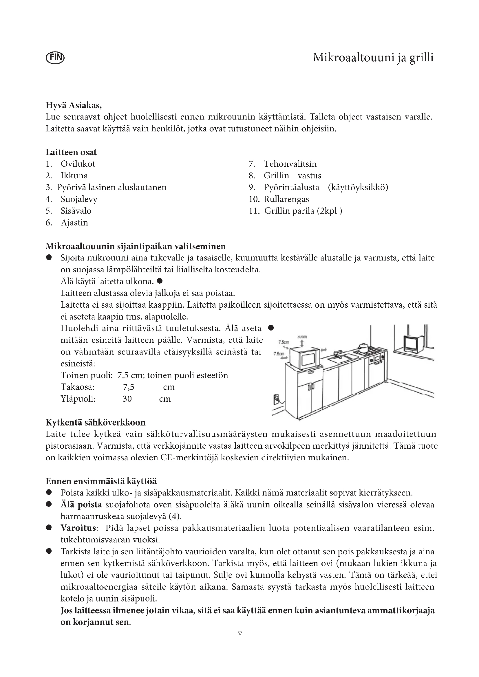 Mikroaaltouunin sijaintipaikan valitseminen Sijoita mikrouuni aina tukevalle ja tasaiselle, kuumuutta kestävälle alustalle ja varmista, että laite z on suojassa lämpölähteiltä tai liialliselta kosteudelta. Älä käytä laitetta ulkona. z Laitteen alustassa olevia jalkoja ei saa poistaa. Laitetta ei saa sijoittaa kaappiin. Laitetta paikoilleen sijoitettaessa on myös varmistettava, että sitä ei aseteta kaapin tms. alapuolelle. Huolehdi aina riittävästä tuuletuksesta. Älä aseta z mitään esineitä laitteen päälle. Varmista, että laite on vähintään seuraavilla etäisyyksillä seinästä tai esineistä: Toinen puoli: 7,5 cm; toinen puoli esteetön Takaosa: 7,5 cm Yläpuoli: 30 cm Kytkentä sähköverkkoon Laite tulee kytkeä vain sähköturvallisuusmääräysten mukaisesti asennettuun maadoitettuun pistorasiaan. Varmista, että verkkojännite vastaa laitteen arvokilpeen merkittyä jännitettä. Tämä tuote on kaikkien voimassa olevien CE-merkintöjä koskevien direktiivien mukainen. Ennen ensimmäistä käyttöä Poista kaikki ulko- ja sisäpakkausmateriaalit. Kaikki nämä materiaalit sopivat kierrätykseen. z Älä poista z suojafoliota oven sisäpuolelta äläkä uunin oikealla seinällä sisävalon vieressä olevaa harmaanruskeaa suojalevyä (4). Varoitus z : Pidä lapset poissa pakkausmateriaalien luota potentiaalisen vaaratilanteen esim. tukehtumisvaaran vuoksi. Tarkista laite ja sen liitäntäjohto vaurioiden varalta, kun olet ottanut sen pois pakkauksesta ja aina z ennen sen kytkemistä sähköverkkoon. Tarkista myös, että laitteen ovi (mukaan lukien ikkuna ja lukot) ei ole vaurioitunut tai taipunut. Sulje ovi kunnolla kehystä vasten. Tämä on tärkeää, ettei mikroaaltoenergiaa säteile käytön aikana. Samasta syystä tarkasta myös huolellisesti laitteen kotelo ja uunin sisäpuoli. Jos laitteessa ilmenee jotain vikaa, sitä ei saa käyttää ennen kuin asiantunteva ammattikorjaaja on korjannut sen.Ennen kuin laitetta käytetään ensimmäistä kertaa tai jos sitä ei ole käytetty pitkään aikaan, se on z puhdistettava huolellisesti jaksossa Laitteen puhdistus ja huolto. Aseta käyttöyksikkö, rullarengas ja pyörivä lasinen aluslautanen laitteeseen. z Anna laitteen kuumentua noin 10 minuutin ajan grilliasetuksella (ilman mikroaaltotoimintoa) z ennen ensimmäistä käyttökertaa. Tämä toimenpide poistaa hajun, jota ilmenee tavallisesti, kun grilli kytketään päälle ensimmäistä kertaa. Laitteesta voi tulla jonkin verran savua; tämä on normaalia, mutta huolehdi kuitenkin riittävästä tuuletuksesta. Huom: Älä kytke laitteen mikroaaltotoimintoa päälle, jollei lämmitettävää tai valmistettavaa ruokaa ole laitettu uuniin. Laitteen käyttäminen tyhjänä voi aiheuttaa vaurioita. Tärkeää Kun lämmität nesteitä mikrossa, neste voi kuumentua kiehumapisteen yli ilman että kuplia z näkyy. Siksi on astioita käsiteltäessä oltava erittäin varovainen (esim. niitä otettaessa mikrosta). Ylikiehumisen vaaraa voidaan vähentää asettamalla astiaan lämpöä kestävä lasisauva kuumennuksen ajaksi. Kananmunia kuorineen tai kovaksikeitettyinä ei saa kuumentaa mikrouunissa, koska ne saattavat z räjähtää mikroaaltoprosessin päätyttyäkin. Varoitus z : On myös erittäin vaarallista kuumentaa nesteitä tai mitään kiinteitä ruoka-aineita suljetuissa astioissa, koska tämä aiheuttaa erittäin vakavan räjähdysvaaran. Vauvojen ruokintapulloja tai vauvanruokaa sisältäviä lasiastioita on sekoitettava tai ravistettava z kunnolla, jotta lämpö jakautuu tasaisesti. Kivuliaitten ja vaarallisten palovammojen välttämiseksi tarkista aina ruoka-aineen lämpötila ennen lapselle antamista. Kun lämmität tai kypsennät syttyvään aineeseen (kuten muoviin tai paperiin) pakattua ruokaa, z voi tällainen materiaali syttyä palamaan. On myös mahdollista, että ruoka kuivuu tai jopa syttyy, jos on valittu liian pitkä kypsentämisaika. Rasva ja öljy ovat myös syttyviä aineita. Siksi on tärkeää valvoa laitteen toimintaa käytön aikana. Herkästi syttyvät nesteet kuten väkevät alkoholit eivät luonnollisesti sovellu kuumennettaviksi. Jos käytön aikana huomataan savua, pidä laitteen ovi kiinni tai estä tai tukahduta liekit. Kytke z laitteesta virta pois välittömästi ja irrota pistotulppa pistorasiasta. Palovammojen estämiseksi on aina käytettävä asianmukaista patalappua ruoka-aineita otettaessa z uunista, koska valmistusvälineet ja -astiat kuumenevat sekä grillin käytön että mikrouunin käytön aikana. Erityisiä ruokalämpömittareita (joita käytetään tavallisissa uuneissa) ei voi käyttää z mikroaaltouunien yhteydessä. Tärkeitä turvallisuusohjeita Varoitus: jotkut ruoat syttyvät helposti palamaan. Älä jätä laitetta toimintaan ilman valvontaa. z Tämä mikroaaltouuni on tarkoitettu vain ruuan sulattamiseen, kuumentamiseen ja z kypsentämiseen. Valmistaja ei vastaa mahdollisista laitteen väärinkäytöstä tai käyttöohjeiden laiminlyömisestä johtuvista vaurioista. Tätä laitetta ei ole tarkoitettu käytettäväksi erillisen ajastimen tai kaukosäätimen kanssa. z Tätä laitetta eivät saa käyttää henkilöt (mukaan lukien lapset), jotka eivät ole fyysisesti, aistillisesti z tai henkisesti täysin kehittyneitä tai joilla ei ole kokemusta ja tietoa laitteen käytöstä, paitsi jos henkilöiden turvallisuudesta vastuussa oleva henkilö valvoo tai ohjaa heitä alussa. Lapsia on valvottava, jotta estetään, etteivät he leiki laitteella. z Varoitus z : lapset eivät saa käyttää mikrouunia ilman valvontaa, jollei heille ole annettu yksityiskohtaisia ja selkeitä ohjeita ennen laitteen käyttämistä. Lapsille tulee selittää, että he saavat käyttää mikrouunia vain turvaohjeiden mukaisesti ja että on vaarallista, jos laitetta 58käytetään väärin tai ohjeita ei seurata. Varoitus: z Grillitoiminnon tai mikro-/grillitoiminnon käytön aikaisten korkeiden lämpötilojen vuoksi lapset eivät sa