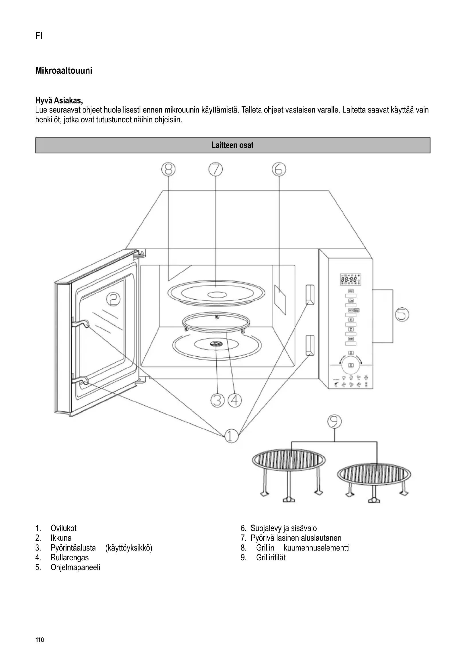 Ohjauspaneelin osat Painike Toiminto Mikrouuni Kello/paino Grilli Grilli- ja mikroaalto-toiminnon yhdistelmä Kuumailma Mikroaalto- ja kuumailmatoiminnon yhdistelmä Pysäytys / keskeytys Kiertokytkin Toiminto Käynnistys/pikakäynnistys Automaattiset valmistus-ohjelmat / aika Näyttö - Syöttötila - Esilämmitys - Automaattiset ohjelmat - Määräyksikkö automaattisessa valmistusohjelmassa - Käyttö - Kestoaika Näytön alueella näkyy senhetkinen kellonaika tai käytön aikana ohjelmoitu kestoaika ja valitut toiminnot. - Kello - Kuumailmatoiminto - Grillitoiminto - Mikroaaltotoiminto - Sulatus - Muistitila - Lapsilukko112 Tärkeitä turvallisuusohjeita Tärkeitä turvallisuusohjeita Lue seuraavat ohjeet huolellisesti ja säilytä käyttöohje tulevaa tarvetta varten. Kytkentä sähköverkkoon Laite tulee kytkeä vain sähköturvallisuusmääräysten mukaisesti asennettuun maadoitettuun pistorasiaan. Varmista, että verkkojännite vastaa laitteen arvokilpeen merkittyä jännitettä. Tämä tuote on kaikkien voimassa olevien CE-merkintöjä koskevien direktiivien mukainen. Mikroaaltouunin sijaintipaikan valitseminen ∙ Sijoita mikrouuni aina tukevalle ja tasaiselle, kuumuutta kestävälle alustalle ja varmista, että laite on suojassa lämpölähteiltä tai liialliselta kosteudelta. ∙ Älä käytä laitetta ulkona. ∙ Laitteen pohjassa olevia jalkoja ei saa irrottaa. ∙ Huolehdi aina riittävästä tuuletuksesta. Älä aseta mitään esineitä laitteen päälle. Varmista, että laite on vähintään seuraavilla etäisyyksillä seinästä tai esineistä: Sivut: 7,5 cm Takaosa: 7,5 cm Yläpuoli: 30,0 cm Laitetta ei saa sijoittaa kaappiin. Laitetta paikoilleen sijoitettaessa on myös varmistettava, että sitä ei aseteta kaapin tms. alapuolelle. Tärkeää ∙ Varoitus: Jotkut ruoat syttyvät helposti palamaan. Älä koskaan jätä laitetta ilman valvontaa käyttäessäsi mikroaalto-, grilli-, kiertoilma- tai yhdistelmätoimintoja. ∙ Tämä mikroaaltouuni on tarkoitettu vain ruuan sulattamiseen, kuumentamiseen ja kypsentämiseen. Varoitus: Jos ruokaa tai vaatteita yritetään kuivata tai lämpötyynyjä, kotitossuja, sieniä, märkiä puhdistusriepuja jne. lämmittää, seurauksena voi olla vammoja, palaminen tai tulipalo. ∙ Valmistaja ei vastaa mahdollisista laitteen väärinkäytöstä tai käyttöohjeiden laiminlyömisestä johtuvista vaurioista. ∙ Käytä vain mikrouunikäyttöön soveltuvia astioita. Mikroaaltotoiminnolla ei saa käyttää metalliastioita ruokien tai juomien lämmittämiseen. Katso lisätietoja kohdasta Käytä aina mikrouunikäyttöön soveltuvia astioita. ∙ Tätä laitetta ei ole tarkoitettu käytettäväksi erillisen ajastimen tai kaukosäätimen kanssa. ∙ Tätä laitetta saavat käyttää lapset (vähintään 8-vuotiaat) sekä henkilöt, joilla on113 fyysisesti, aistillisesti tai henkisesti rajoittunut toimintakyky tai joilla on puuttuvat tai vajavaiset tiedot laitteen toiminnasta, mikäli heitä valvotaan tai ohjataan laitteen käytössä ja he ymmärtävät täysin kaikki käyttöön liittyvät vaarat ja turvatoimenpiteet. ∙ Lasten ei saa antaa leikkiä laitteella. ∙ Lasten ei saa antaa tehdä laitteen puhdistus- tai huoltotoimenpiteitä, elleivät he ole aikuisen valvonnassa. ∙ Laite ja sen liitäntäjohto täytyy aina pitää alle 8-vuotiaiden ulottumattomissa. ∙ Sähköiskun välttämiseksi älä puhdista laitetta vedellä äläkä upota sitä veteen. ∙ Varoitus Yhdistelmätoimintojen käytön aikaisten korkeiden lämpötilojen vuoksi lapset eivät saa käyttää laitetta muutoin kuin aikuisten tarkassa valvonnassa. ∙ Varo yhdistelmä- tai grillitoimintojen sekä/tai kiertoilmatoimintojen käytön aikana erityisesti koskettamasta sisäpuolella olevia lämpöelementtejä. ∙ Älä käytä höyrypuhdistuslaitteita laitteen puhdistamiseen. ∙ Katkaise aina virta laitteesta ja irrota pistotulppa pistorasiasta: - ennen laitteen puhdistamista ja, - mahdollisen toimintahäiriön sattuessa. - jokaisen käyttökerran jälkeen. ∙ Kun irrotat pistotulpan pistorasiasta, älä vedä liitäntäjohdosta vaan tartu aina pistotulppaan. ∙ Varoitus: Laitteen ulkopinnat saattavat kuumentua käytön aikana. Kuumaa höyryä voi myös tulla tuuletusaukoista: palovammavaara. ∙ Älä anna laitteen tai liitäntäjohdon koskettaa kuumia pintoja tai joutua kosketuksiin lämmönlähteiden kanssa. Älä myöskään jätä liitäntäjohtoa roikkumaan äläkä anna sen koskettaa kuumia osia. ∙ Ellei laitetta pidetä puhtaana oikein, se pintojen kunto saattaa vaurioitua, mistä voi olla seurauksena sen käyttöiän lyheneminen sekä mahdollinen uhka käyttäjän turvallisuudelle. Siksi ruoantähteet täytyy poistaa välittömästi. Yksityiskohtaisia tietoja laitteen puhdistuksesta on osassa Puhdistus. ∙ Tämä laite on tarkoitettu kotitalouskäyttöön tai vastaavaan, kuten - ruokalat, toimistot ja muut kaupalliset ympäristöt, - maatalousyritykset, - hotellien, motellien jne. ja vastaavien yritysten asiakkaat, - aamiaisen ja majoituksen tarjoavat majatalot. ∙ Varoitus: Huolto- ja korjaustyöt, jotka vaativat mikroaaltosäteilysuojuksen poistamista, ovat erittäin vaarallisia henkilöille, joilla ei ole alan koulutusta. Näihin töihin luetaan myös erikoisliitäntäjohdon ja sisävalon lampun vaihtaminen. Laitteen saa avata vain alan koulutuksen saanut, pätevä henkilö. Jos laitteessa ilmenee toimintahäiriöitä, ota yhteys asiakaspalveluumme.114 ∙ Kun lämmität nesteitä mikrossa, neste voi kuumentua kiehumapisteen yli ilman että kuplia näkyy. Siksi astioita käsiteltäessä on oltava erittäin varovainen (esim. otettaessa niitä mikrosta). Ylikiehumisen vaaraa voidaan vähentää asettamalla astiaan lämpöä kestävä lasisauva kuumennuksen ajaksi. ∙ Kananmunia kuorineen tai kovaksi keitettyinä ei saa kuumentaa mikrouunissa, koska ne saattavat räjähtää mikroaaltoprosessin päätyttyäkin. ∙ Varoitus: On myös erittäin vaarall