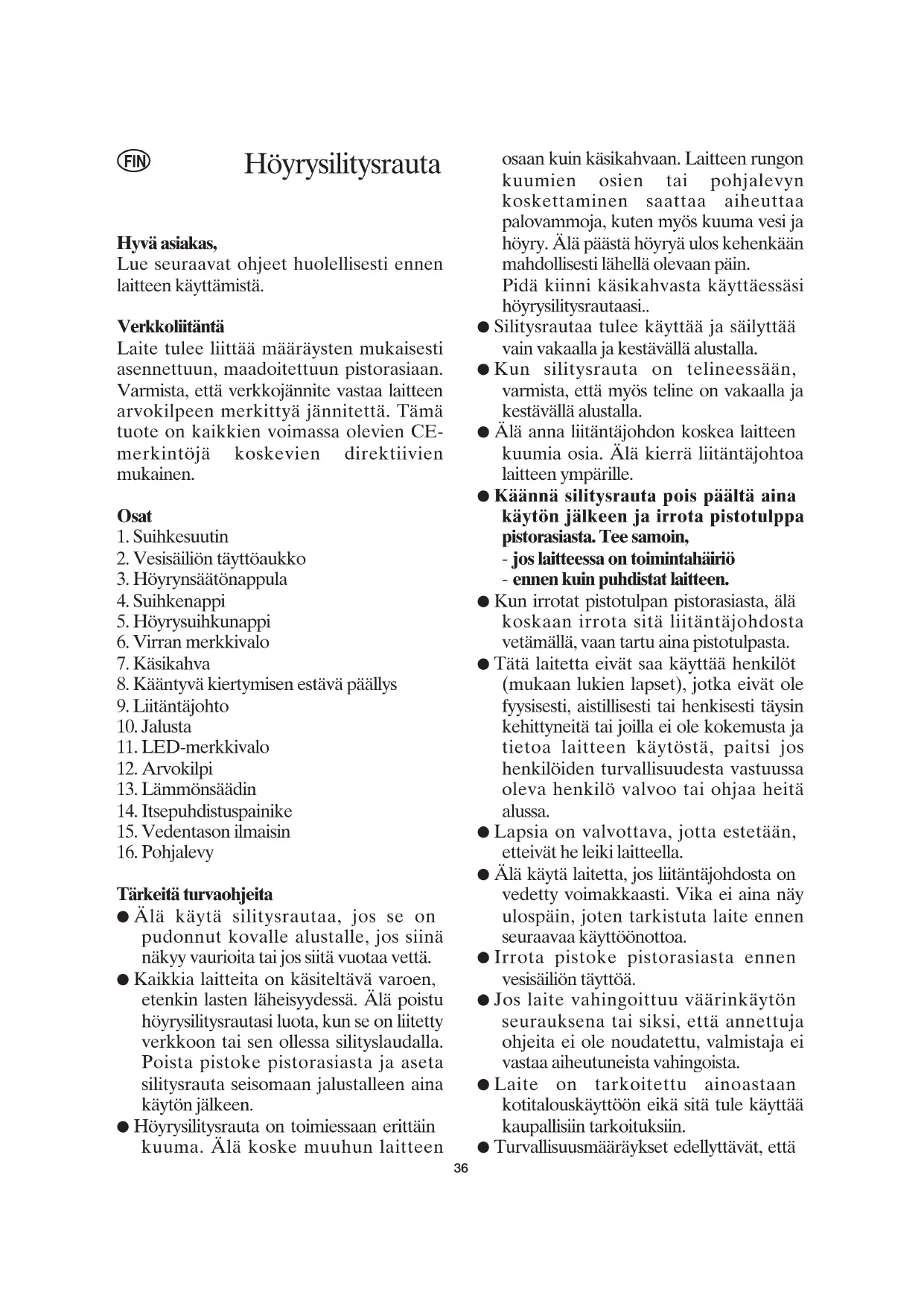 Tärkeitä turvaohjeita ● Älä käytä silitysrautaa, jos se on pudonnut kovalle alustalle, jos siinä näkyy vaurioita tai jos siitä vuotaa vettä. ● Kaikkia laitteita on käsiteltävä varoen, etenkin lasten läheisyydessä. Älä poistu höyrysilitysrautasi luota, kun se on liitetty verkkoon tai sen ollessa silityslaudalla. Poista pistoke pistorasiasta ja aseta silitysrauta seisomaan jalustalleen aina käytön jälkeen. ● Höyrysilitysrauta on toimiessaan erittäin kuuma. Älä koske muuhun laitteen osaan kuin käsikahvaan. Laitteen rungon kuumien osien tai pohjalevyn koskettaminen saattaa aiheuttaa palovammoja, kuten myös kuuma vesi ja höyry. Älä päästä höyryä ulos kehenkään mahdollisesti lähellä olevaan päin. Pidä kiinni käsikahvasta käyttäessäsi höyrysilitysrautaasi.. ● Silitysrautaa tulee käyttää ja säilyttää vain vakaalla ja kestävällä alustalla. ● Kun silitysrauta on telineessään, varmista, että myös teline on vakaalla ja kestävällä alustalla. ● Älä anna liitäntäjohdon koskea laitteen kuumia osia. Älä kierrä liitäntäjohtoa laitteen ympärille. ● Käännä silitysrauta pois päältä aina käytön jälkeen ja irrota pistotulppa pistorasiasta. Tee samoin, - jos laitteessa on toimintahäiriö - ennen kuin puhdistat laitteen. ● Kun irrotat pistotulpan pistorasiasta, älä koskaan irrota sitä liitäntäjohdosta vetämällä, vaan tartu aina pistotulpasta. ● Tätä laitetta eivät saa käyttää henkilöt (mukaan lukien lapset), jotka eivät ole fyysisesti, aistillisesti tai henkisesti täysin kehittyneitä tai joilla ei ole kokemusta ja tietoa laitteen käytöstä, paitsi jos henkilöiden turvallisuudesta vastuussa oleva henkilö valvoo tai ohjaa heitä alussa. ● Lapsia on valvottava, jotta estetään, etteivät he leiki laitteella. ● Älä käytä laitetta, jos liitäntäjohdosta on vedetty voimakkaasti. Vika ei aina näy ulospäin, joten tarkistuta laite ennen seuraavaa käyttöönottoa. ● Irrota pistoke pistorasiasta ennen vesisäiliön täyttöä. ● Jos laite vahingoittuu väärinkäytön seurauksena tai siksi, että annettuja ohjeita ei ole noudatettu, valmistaja ei vastaa aiheutuneista vahingoista. ● Laite on tarkoitettu ainoastaan kotitalouskäyttöön eikä sitä tule käyttää kaupallisiin tarkoituksiin. ● Turvallisuusmääräykset edellyttävät, että