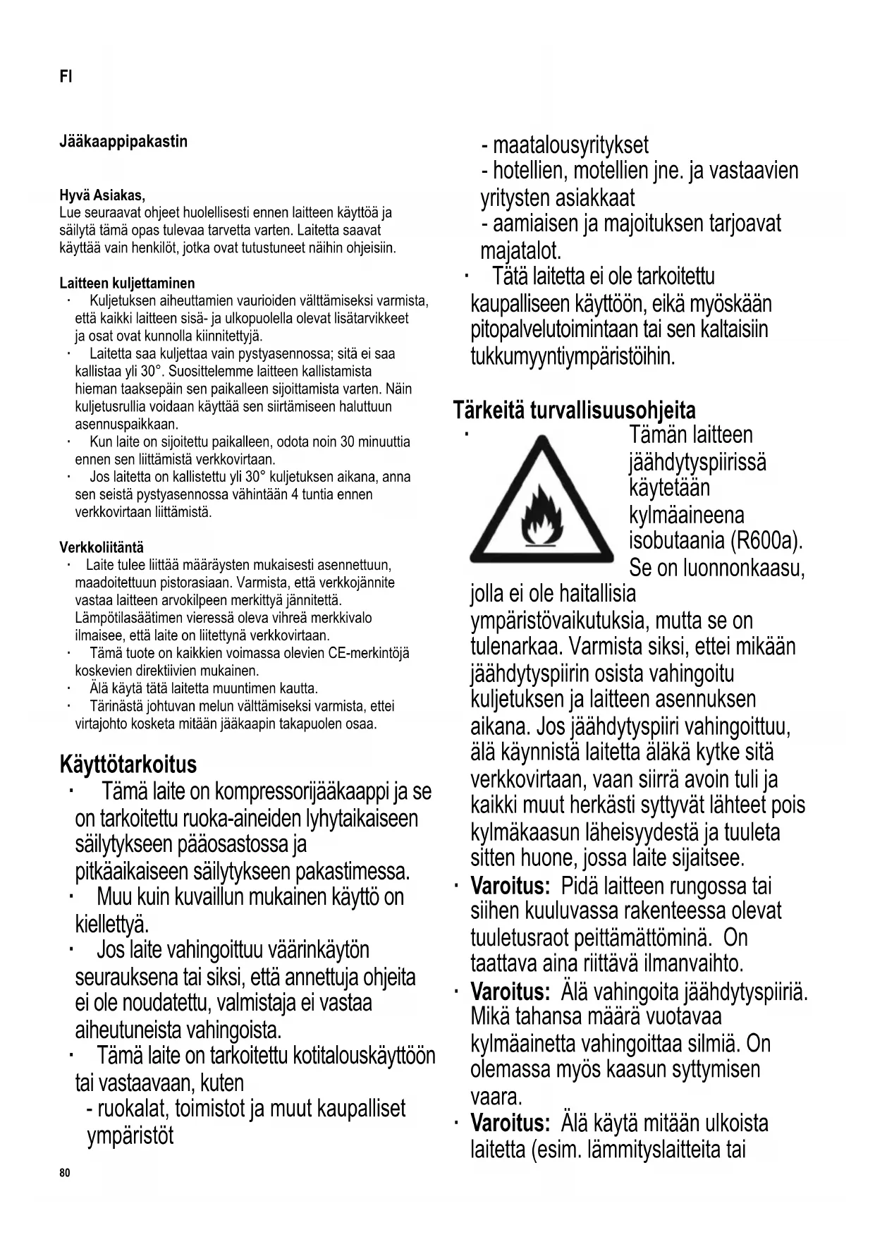 Tämän laitteen jäähdytyspiirissä käytetään kylmäaineena isobutaania (R600a). Se on luonnonkaasu, jolla ei ole haitallisia ympäristövaikutuksia, mutta se on tulenarkaa. Varmista siksi, ettei mikään jäähdytyspiirin osista vahingoitu kuljetuksen ja laitteen asennuksen aikana. Jos jäähdytyspiiri vahingoittuu, älä käynnistä laitetta äläkä kytke sitä verkkovirtaan, vaan siirrä avoin tuli ja kaikki muut herkästi syttyvät lähteet pois kylmäkaasun läheisyydestä ja tuuleta sitten huone, jossa laite sijaitsee. ∙ Varoitus: Pidä laitteen rungossa tai siihen kuuluvassa rakenteessa olevat tuuletusraot peittämättöminä. On taattava aina riittävä ilmanvaihto. ∙ Varoitus: Älä vahingoita jäähdytyspiiriä. Mikä tahansa määrä vuotavaa kylmäainetta vahingoittaa silmiä. On olemassa myös kaasun syttymisen vaara. ∙ Varoitus: Älä käytä mitään ulkoista laitetta (esim. lämmityslaitteita tai FI81 lämpöpuhaltimia) nopeuttamaan sulatusta. Noudata ainoastaan tässä oppaassa suositeltuja menetelmiä. ∙ Varoitus: Älä käytä mitään muita sähkölaitteita (esim. jääpalakoneita) pakastimen sisällä, ellei sitä ole erityisesti hyväksytty tässä oppaassa. ∙ Koko laite, mukaan lukien sen virtajohto, on tarkastettava perusteellisesti kuljetusvaurioiden varalta ennen kuin se liitetään verkkovirtaan. Mikäli tällainen vaurio löytyy, laitetta ei saa liittää verkkovirtaan. ∙ Tätä laitetta ei ole tarkoitettu räjähdysherkkien aineiden säilytykseen kuten aerosolipurkkien, joissa on tulenarkaa ponneainetta. ∙ Jos laite myydään, annetaan ulkopuoliselle tai hävitetään sopivassa kierrätyslaitoksessa, on kiinnitettävä huomiota eristyskaasuna toimivan syklopentaanin sekä kylmäaineen (R600a) olemassaoloon. Lisätietoa oikein kierrätyksestä on osassa Hävittäminen. ∙ Jotta turvallisuusmääräyksiä noudatetaan ja vaarat vältetään, vain valmistajan valtuuttama huoltohenkilöstö saa tehdä laitteeseen korjauksia tai muutoksia mukaan lukien virtajohdon vaihtamisen. ∙ Tätä laitetta saavat käyttää lapset (vähintään 8-vuotiaat) sekä henkilöt, joilla on fyysisesti, aistillisesti tai henkisesti rajoittunut toimintakyky tai joilla on puuttuvat tai vajavaiset tiedot laitteen toiminnasta, mikäli heitä valvotaan tai ohjataan laitteen käytössä ja he ymmärtävät täysin kaikki käyttöön liittyvät vaarat ja turvatoimenpiteet. ∙ Lasten ei saa antaa leikkiä laitteella. ∙ Lasten ei saa antaa tehdä laitteen puhdistus- tai huoltotoimenpiteitä, elleivät he ole valvonnassa. ∙ Säännölliseen puhdistukseen suosittelemme lämpimän veden ja miedon puhdistusaineen käyttöä. Kaikki lisävarusteet on puhdistettava erikseen saippuavedellä. Älä laita niitä astianpesukoneeseen. ∙ Varoitus: Älä irrota LED-sisävalon kantta. Mikäli siihen tulee vika, saat apua ottamalla yhteyttä asiakaspalveluun (katso liite). ∙ Jotta henkilövammojen tai pakastimen vaurioitumisen vaara vältetään, laitetta saadaan kuljettaa ainoastaan sen alkuperäispakkauksessa. Laitteen poistamiseen pakkauksesta sekä asennukseen tarvitaan 2 henkilöä. ∙ Varoitus: Pidä lapset poissa pakkausmateriaalien luota potentiaalisen vaaratilanteen esim. tukehtumisvaaran vuoksi. ∙ Laitteesta sulattamisen ja puhdistuksen aikana poistettu jää ei sovellu ihmisten nautittavaksi. ∙ Virtajohto on tarkistettava säännöllisesti vaurioiden varalta. Jos johdossa on vikaa, laitetta ei saa enää käyttää. ∙ Älä aseta tulipalon vaaran välttämiseksi mitään lämpöä tuottavia sähkölaitteita pakastimen päälle. Älä sijoita mitään nestettä sisältäviä astioita laitteen päälle. Siten estetään nesteiden valuminen tai vuotaminen ja siten sähköeristyksen vaurioituminen. ∙ Tämä laite on tarkoitettu ainoastaan ruoan säilytykseen. ∙ Alkoholipitoisia aineita saadaan säilyttää vain kunnolla suljetuissa pakkauksissa ja pystysuorassa asennossa. ∙ Älä säilytä hiilihappoa tai muita jäätyviä nesteitä sisältäviä lasipulloja laitteen pakastinosastossa: tällaiset pullot voivat haljeta pakastamisen aikana. ∙ Jotta vältetään ruokamyrkytyksen vaara, älä nauti ruokaa sen säilytysajan umpeutumisen jälkeen. Sulatettuja ruokia ei saa pakastaa uudelleen. ∙ Älä nojaa äläkä kohdista kohtuutonta painoa hyllyihin, osastoihin ja oveen jne. ∙ Suojaa pakastimen sisustaa aina avoimilta liekeiltä ja muilta syttymislähteiltä. ∙ Irrota pistoke seinäpistorasiasta - kun ilmenee mikä tahansa vika, - ennen laitteen sulattamista, - puhdistuksen ajaksi, - ennen huolto- tai korjaustöiden suorittamista. ∙ Kun irrotat pistotulpan pistorasiasta, älä vedä liitäntäjohdosta vaan tartu aina pistotulppaan. ∙ Ellei laitetta käytetä pitkään aikaan, suositellaan sen oven pitämistä auki. ∙ Valmistaja pidättää itsellään oikeuden teknisiin muutoksiin.82 Tutustuminen ∙ Jääkaappipakastimesi osat voivat poiketa määrältään ja malliltaan tässä olevasta kuvauksesta. Tämä kuvaus viittaa laitteeseen, joka on kaksiosastoinen jääkaappipakastinyhdistelmä. Laite koostuu kahdesta osasta: jääkaappiosastosta (A) ja pakastinosastosta (B). ∙ Pakastinosaston sisällä olevassa pikapakastuslokerossa on symboli Fast Freeze.