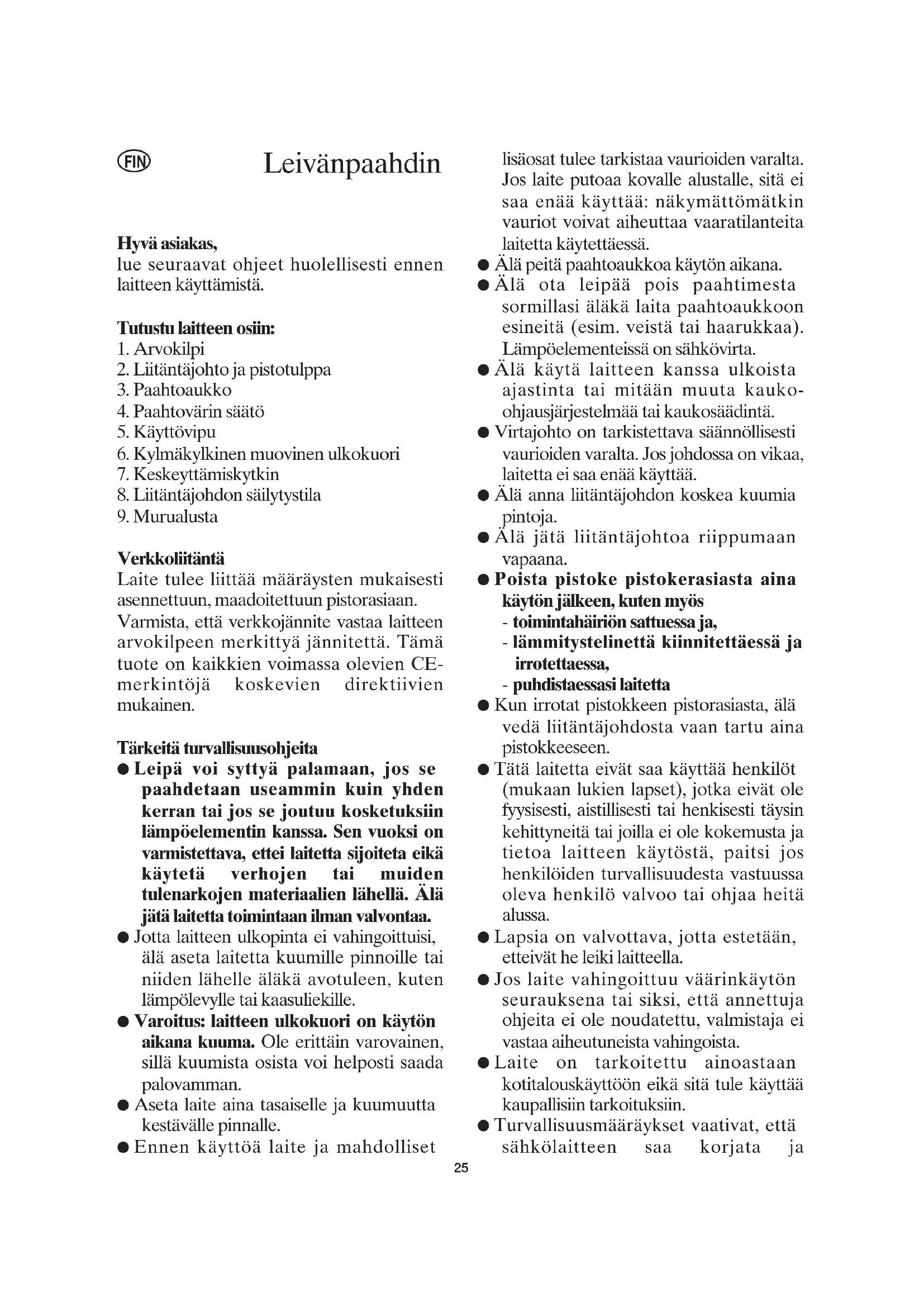 Verkkoliitäntä Laite tulee liittää määräysten mukaisesti asennettuun, maadoitettuun pistorasiaan. Varmista, että verkkojännite vastaa laitteen arvokilpeen merkittyä jännitettä. Tämä tuote on kaikkien voimassa olevien CE- merkintöjä koskevien direktiivien mukainen. Tärkeitä turvallisuusohjeita ● Leipä voi syttyä palamaan, jos se paahdetaan useammin kuin yhden kerran tai jos se joutuu kosketuksiin lämpöelementin kanssa. Sen vuoksi on varmistettava, ettei laitetta sijoiteta eikä käytetä verhojen tai muiden tulenarkojen materiaalien lähellä. Älä jätä laitetta toimintaan ilman valvontaa. ● Jotta laitteen ulkopinta ei vahingoittuisi, älä aseta laitetta kuumille pinnoille tai niiden lähelle äläkä avotuleen, kuten lämpölevylle tai kaasuliekille. ● Varoitus: laitteen ulkokuori on käytön aikana kuuma. Ole erittäin varovainen, sillä kuumista osista voi helposti saada palovamman. ● Aseta laite aina tasaiselle ja kuumuutta kestävälle pinnalle. ● Ennen käyttöä laite ja mahdolliset lisäosat tulee tarkistaa vaurioiden varalta. Jos laite putoaa kovalle alustalle, sitä ei saa enää käyttää: näkymättömätkin vauriot voivat aiheuttaa vaaratilanteita laitetta käytettäessä. ● Älä peitä paahtoaukkoa käytön aikana. ● Älä ota leipää pois paahtimesta sormillasi äläkä laita paahtoaukkoon esineitä (esim. veistä tai haarukkaa). Lämpöelementeissä on sähkövirta. ● Älä käytä laitteen kanssa ulkoista ajastinta tai mitään muuta kauko- ohjausjärjestelmää tai kaukosäädintä. ● Virtajohto on tarkistettava säännöllisesti vaurioiden varalta. Jos johdossa on vikaa, laitetta ei saa enää käyttää. ● Älä anna liitäntäjohdon koskea kuumia pintoja. ● Älä jätä liitäntäjohtoa riippumaan vapaana. ● Poista pistoke pistokerasiasta aina käytön jälkeen, kuten myös - toimintahäiriön sattuessa ja, - lämmitystelinettä kiinnitettäessä ja irrotettaessa, - puhdistaessasi laitetta ● Kun irrotat pistokkeen pistorasiasta, älä vedä liitäntäjohdosta vaan tartu aina pistokkeeseen. ● Tätä laitetta eivät saa käyttää henkilöt (mukaan lukien lapset), jotka eivät ole fyysisesti, aistillisesti tai henkisesti täysin kehittyneitä tai joilla ei ole kokemusta ja tietoa laitteen käytöstä, paitsi jos henkilöiden turvallisuudesta vastuussa oleva henkilö valvoo tai ohjaa heitä alussa. ● Lapsia on valvottava, jotta estetään, etteivät he leiki laitteella. ● Jos laite vahingoittuu väärinkäytön seurauksena tai siksi, että annettuja ohjeita ei ole noudatettu, valmistaja ei vastaa aiheutuneista vahingoista. ● Laite on tarkoitettu ainoastaan kotitalouskäyttöön eikä sitä tule käyttää kaupallisiin tarkoituksiin. ● Turvallisuusmääräykset vaativat, että sähkölaitteen saa korjata ja