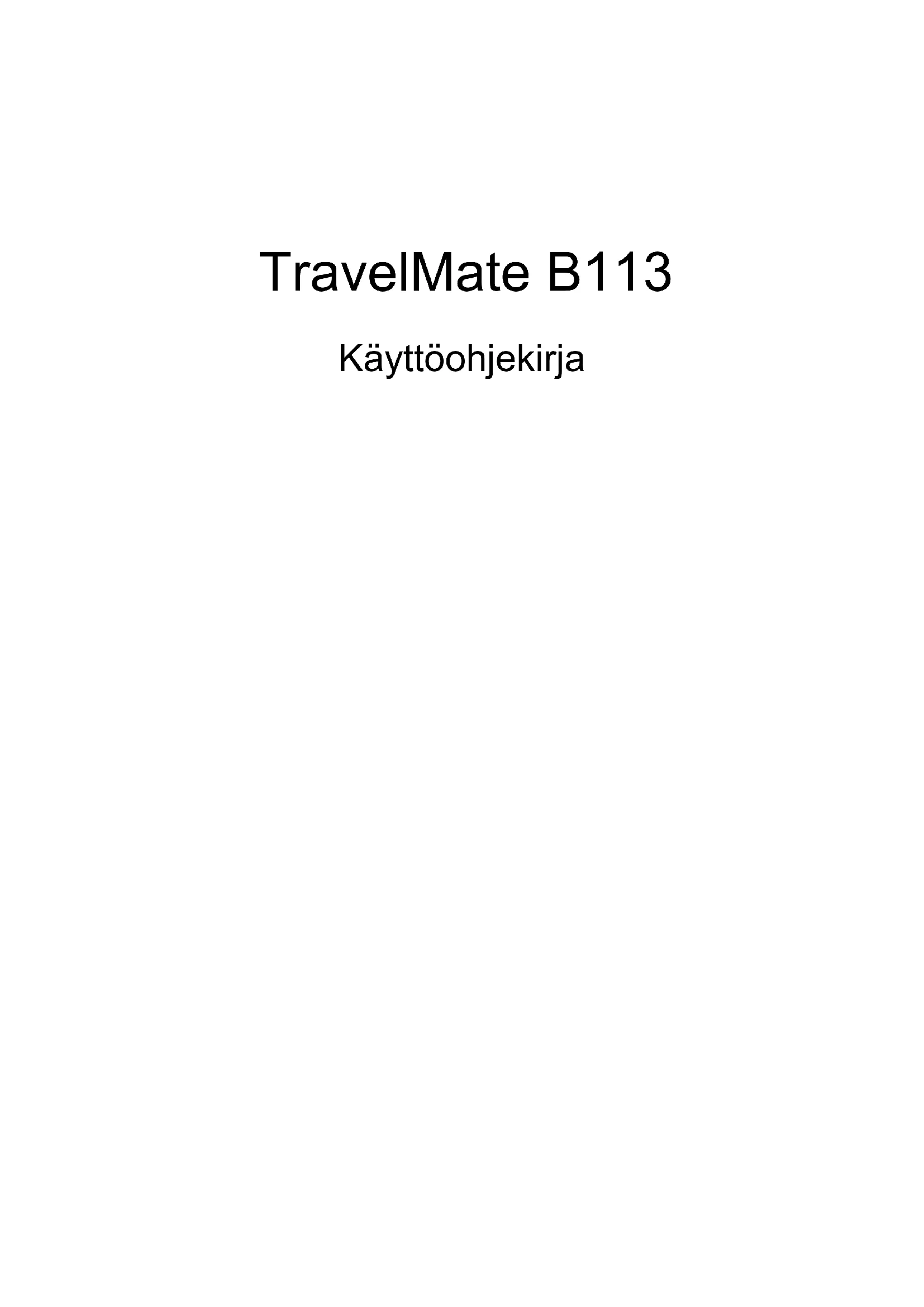 ANADA - LICENSFRIA LÅGEFFEKTSENHETER FÖR RADIOKOMMUNIKATION (RSS-210) Radiostrålning - exponering av personer (RSS-102) Datorn använder inbyggda antenner med låg förstärkning som inte avger radiostrålning över de gränsvärden för den allmänna befolkningen som angivits av Health Canada. Se även Safety Code 6 som du kan hämta på Health Canadas webbplats www.hc-sc.gc.ca/rpb Denna enhet uppfyller kraven i RSS210 från Industry Canada. Denna Class B digitala enhet uppfyller kraven i kanadensiska ICES-003, Issue 4 och RSS-210, No 4 (Dec 2000) och No 5 (Nov 2001). "Denna enhet skall användas inomhus för att förhindra störningar på radiotrafik med licens, och på avstånd från fönster för att sörja för bästa möjliga avskärmning. Utrustning (eller dess sändarantenn) som är installerad utomhus kräver licens." Cet appareil numérique de la classe B est conforme à la norme NMB-003, No. 4, et CNR-210, No 4 (Dec 2000) et No 5 (Nov 2001).68 Svenska « Pour empêcher que cet appareil cause du brouillage au service faisant l'objet d'une licence, il doit être utilisé a l'intérieur et devrait être placé loin des fenêtres afin de fournir un écran de blindage maximal. Si le matériel (ou son antenne d'émission) est installé à l'extérieur, il doit faire l'objet d'une licence. Var försiktig: Vid anvädning av IEEE 802.11 trådlös LAN är denna utrustning begränsad till användning inomhus eftersom den opererar på frekvensområdet 5,15 till 5,25 GHz. Industry Canada kräver att denna produkt skall användas inomhus i frekvensområdet 5,15 till 5,25 GHz för att minska risken för skadliga störningar på mobilsatellitsystem som drivs på samma kanal. Högeffektsradar är tilldelad primära användarrättigheter på banden 5,25 till 5,35 GHz och 5,65 till 5,85 GHz. Dessa radarstationer kan orsaka störningar på och/eller skada enheten. Den högsta tillåtna antennförstärkningen som får användas med den här enheten är 6 dBi för att följa E.I.R.P.-gränsvärdet för frekvensbandet 5,25 till 5,35 och 5,725 till 5,85 GHz i punkt-till-punkt-drift. Ver.: 01.01.04TravelMate B113 KäyttöohjekirjaMallinumero: _________________________ Sarjanumero: _________________________ Ostopäivämäärä: ______________________ Ostopaikka: __________________________ © 2012 Kaikki oikeudet pidätetään. TravelMate B113 käyttöohjeesta Tämä versio: 11/2012iii Suomi Tietoja turvallisuuttasi ja mukavuuttasi varten Tärkeitä turvallisuusohjeita Lue nämä ohjeet huolellisesti. Säästä ohjeet tulevaisuutta varten. Säilytä tämä asiakirja tulevaa käyttöä varten. Noudata kaikkia laitteeseen merkittyjä määräyksiä ja ohjeita. Tuotteen sammuttaminen ennen puhdistamista Irrota laite pistorasiasta ennen sen puhdistamista. Älä käytä puhdistukseen nestemäisiä pesuaineita. Puhdista laite kostealla rievulla. VAROITUS kytkemisestä irrotettavana laitteena Huomaa seuraavat ohjeet virtalähteen virran kytkemisestä, sekä irroituksesta: Aseta virtalähde-yksikkö ennen virtajohdon liittämistä vaihtovirtapistorasiaan. Irroita virtajohto ennen virtalähde-yksikön irroitusta tietokoneesta. Jos laitteessa on useampia virtalähteitä, irroita kaikkien virtalähteiden virtajohdot. VAROITUS käsiksipääsystä Varmista, että virtaliitin, johon liität virtajohdon, on helposti käsiksi päästävissä, ja sijaitsee mahdollisimman lähellä laitteiston käyttäjää. Kun haluat katkaista virran laitteistosta, varmista että irroitat virtajohdon virtaliittimisetä. VAROITUS mukana toimitetuista täytekortista(-korteista) (vain tietyille malleille) Tietokoneesi on toimitettu täytekorttien kanssa, jotka on asetettu korttipaikkoihin. Täytekortit suojaavat käyttämättömiä korttipaikkoja pölyltä, metalliesineiltä, ja muulta lialta. Säilytä täytekortit, jotta voit käyttää niitä, kun korttipaikoissa ei ole kortteja. VAROITUS kuuntelemisessa Suojaa kuuloasi noudattamalla seuraavia ohjeita.
